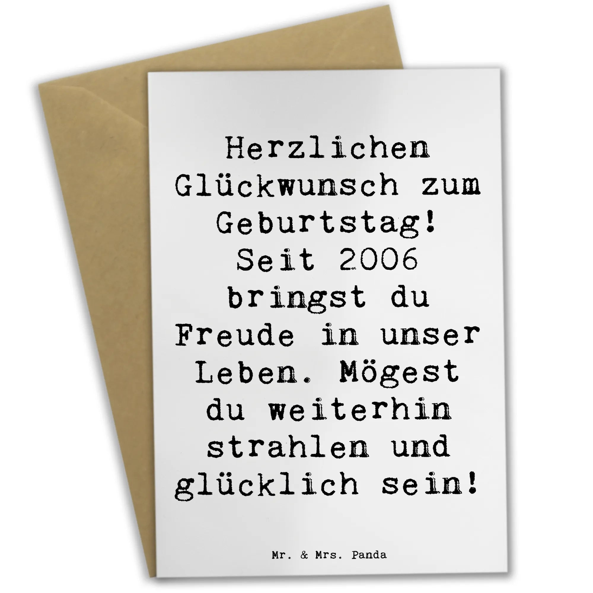 Die wunderschöne Grußkarte "2006 Geburtstag" aus der freundlichen Kollektion von Mr. & Mrs. Panda ist das perfekte Geschenk für alle, die einen besonderen Geburtstag feiern möchten! Egal ob für einen Freund, ein Familienmitglied oder sogar für dich selbst, diese Karte erfüllt jeden Anlass mit Freude und herzlich-lebendigen Erinnerungen. Die Karte ist bedruckt mit dem herzlichen Spruch: "Herzlichen Glückwunsch zum Geburtstag! Seit 2006 bringst du Freude in unser Leben. Mögest du weiterhin strahlen und glücklich sein!" und einem süßen Panda-Motiv, das die Herzen höher schlagen lässt.