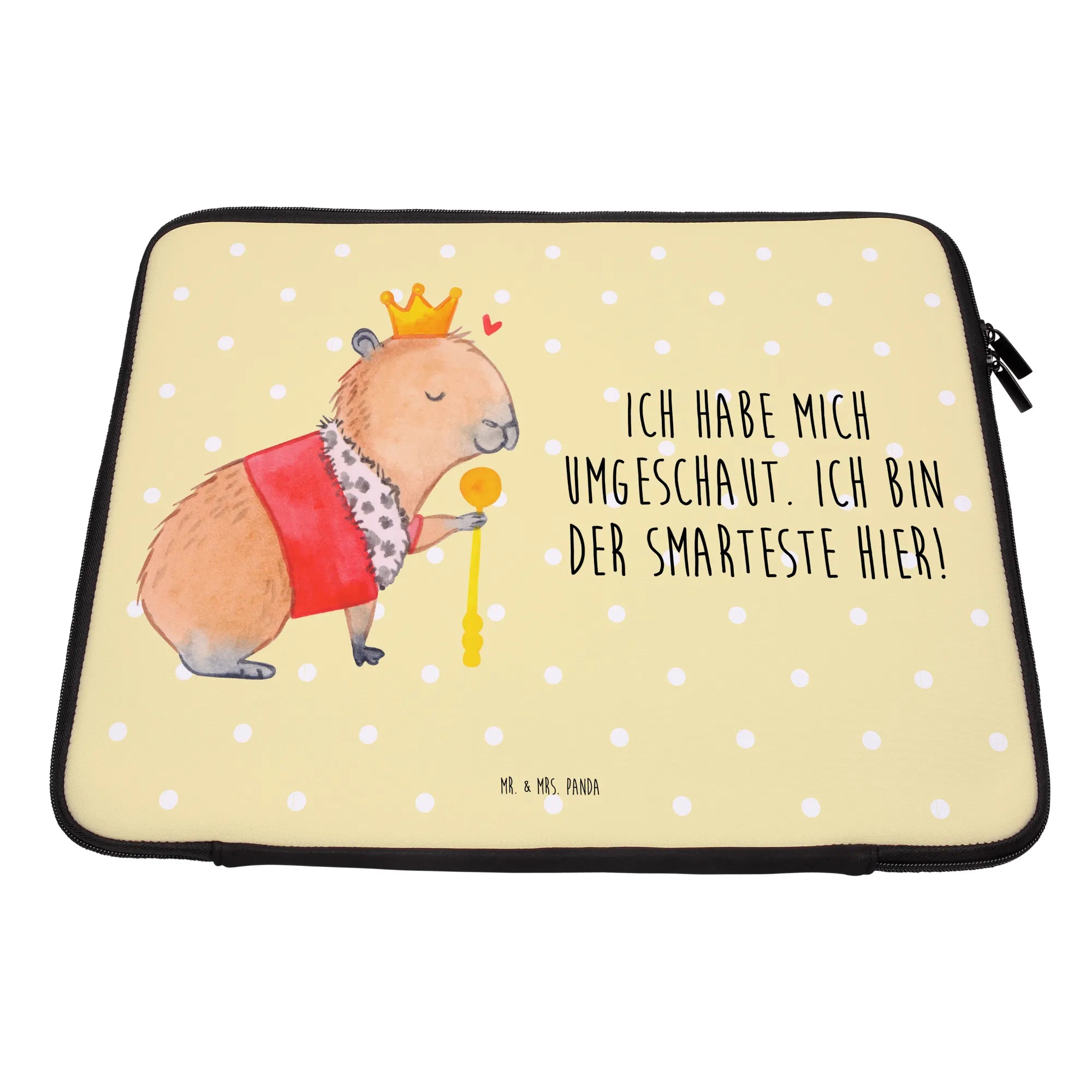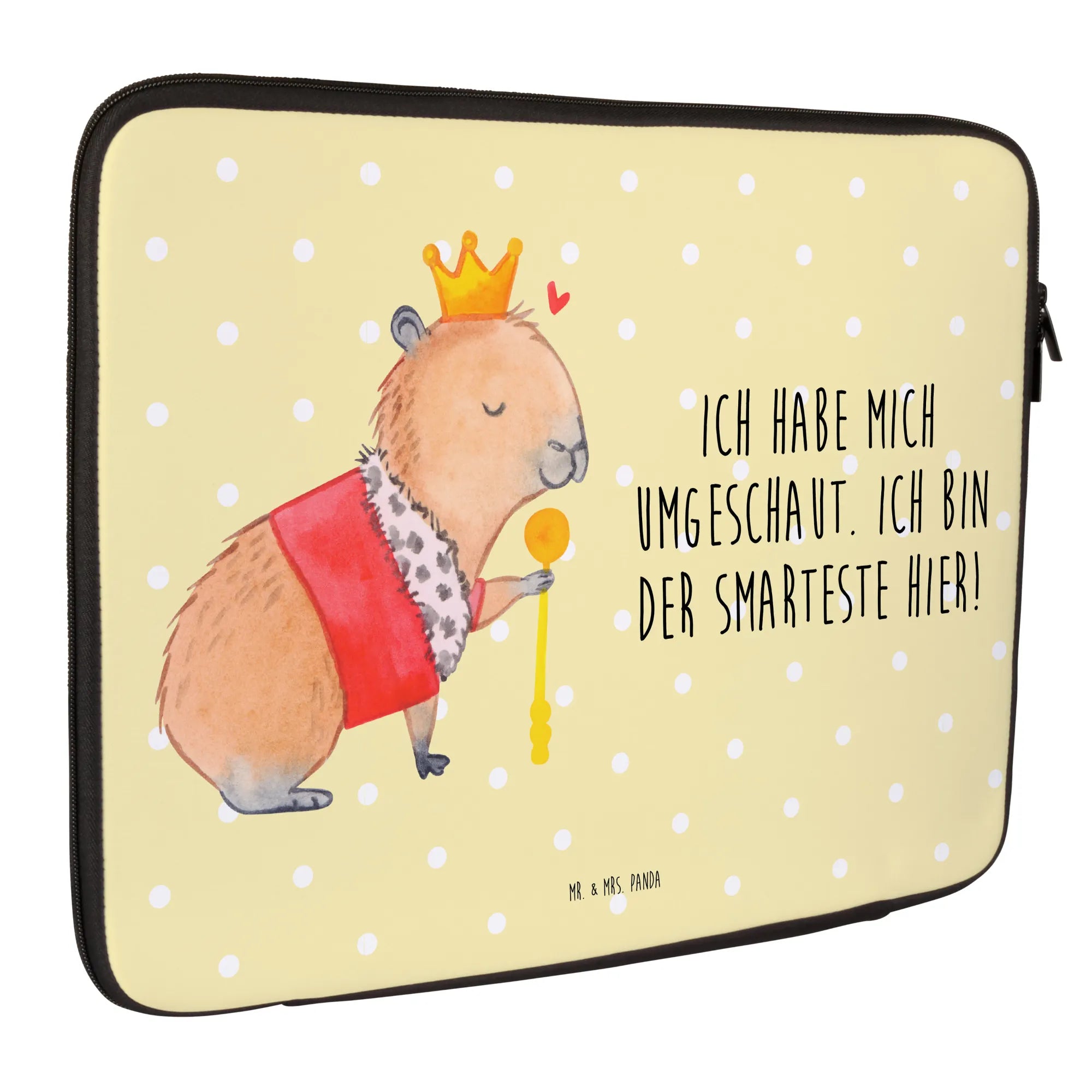 Diese besondere Tasche ist nicht nur ein echter Hingucker, sondern auch ein praktisches Accessoire für jeden, der sein Notebook sicher transportieren möchte. Handgezeichnet von Mrs. Panda selbst, zeigt das Design ein charmantes Capybara, das mit einer goldenen Krone und einem purpurroten Mantel ausgestattet ist. Der königliche Look wird durch das kleine Herzchen über dem Kopf perfekt ergänzt.