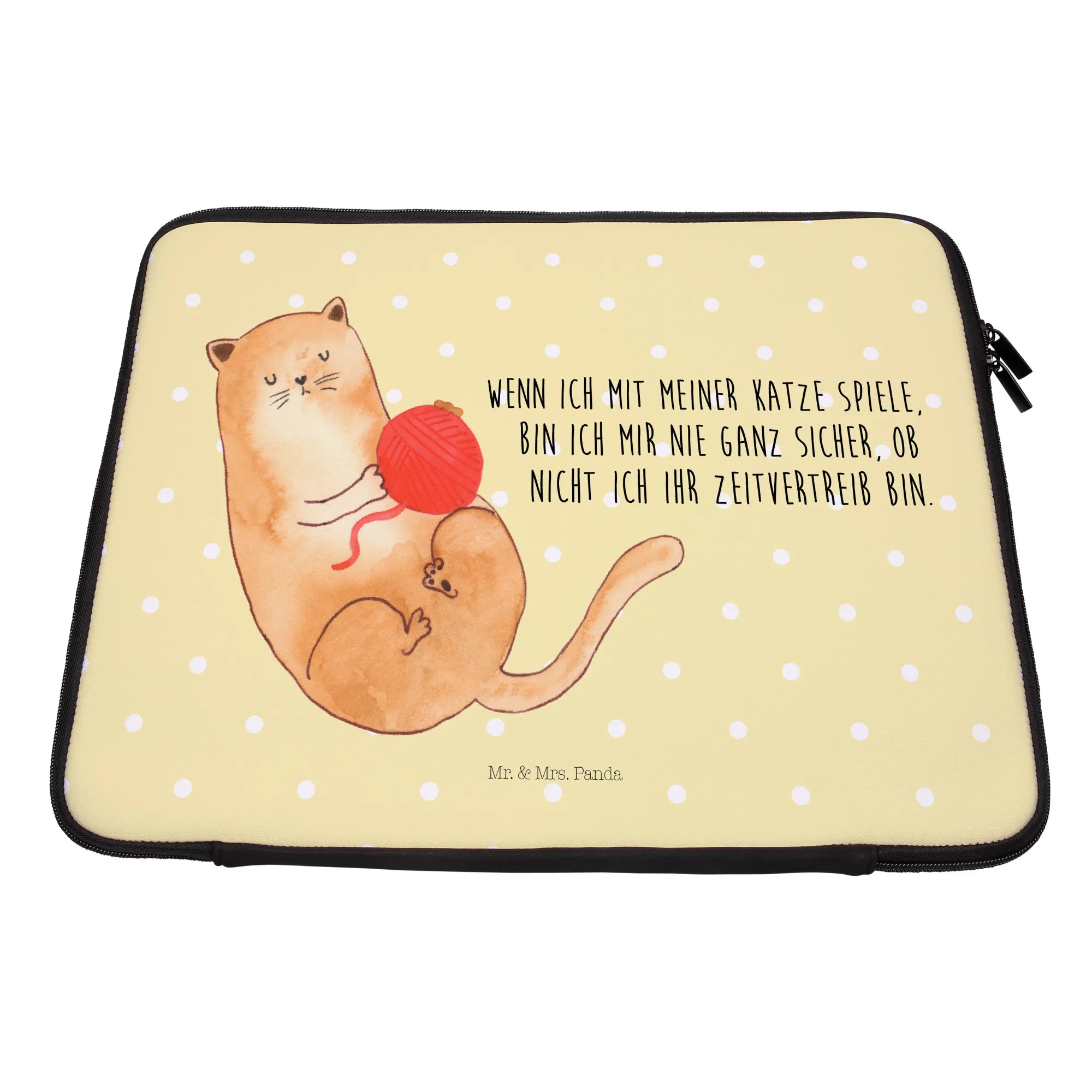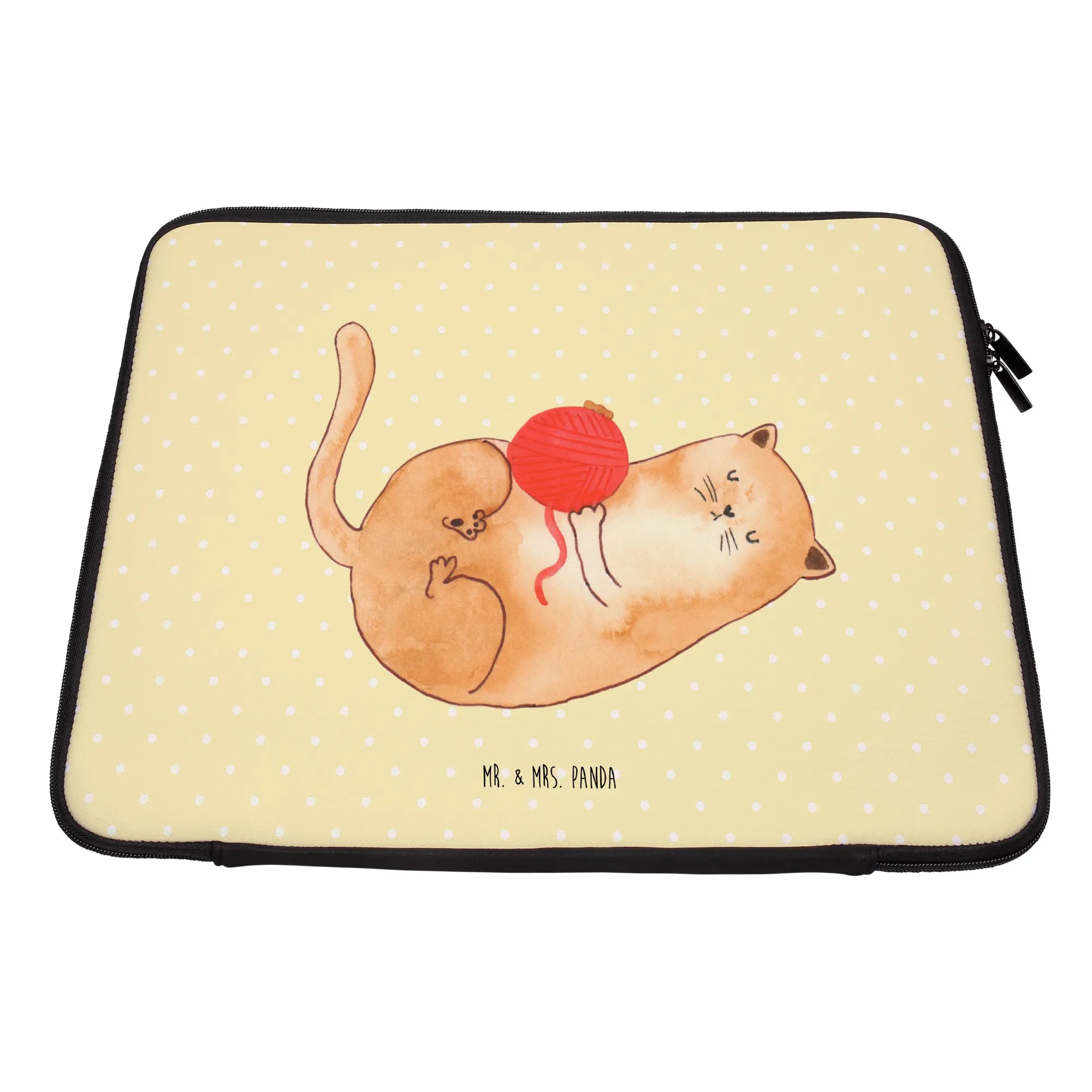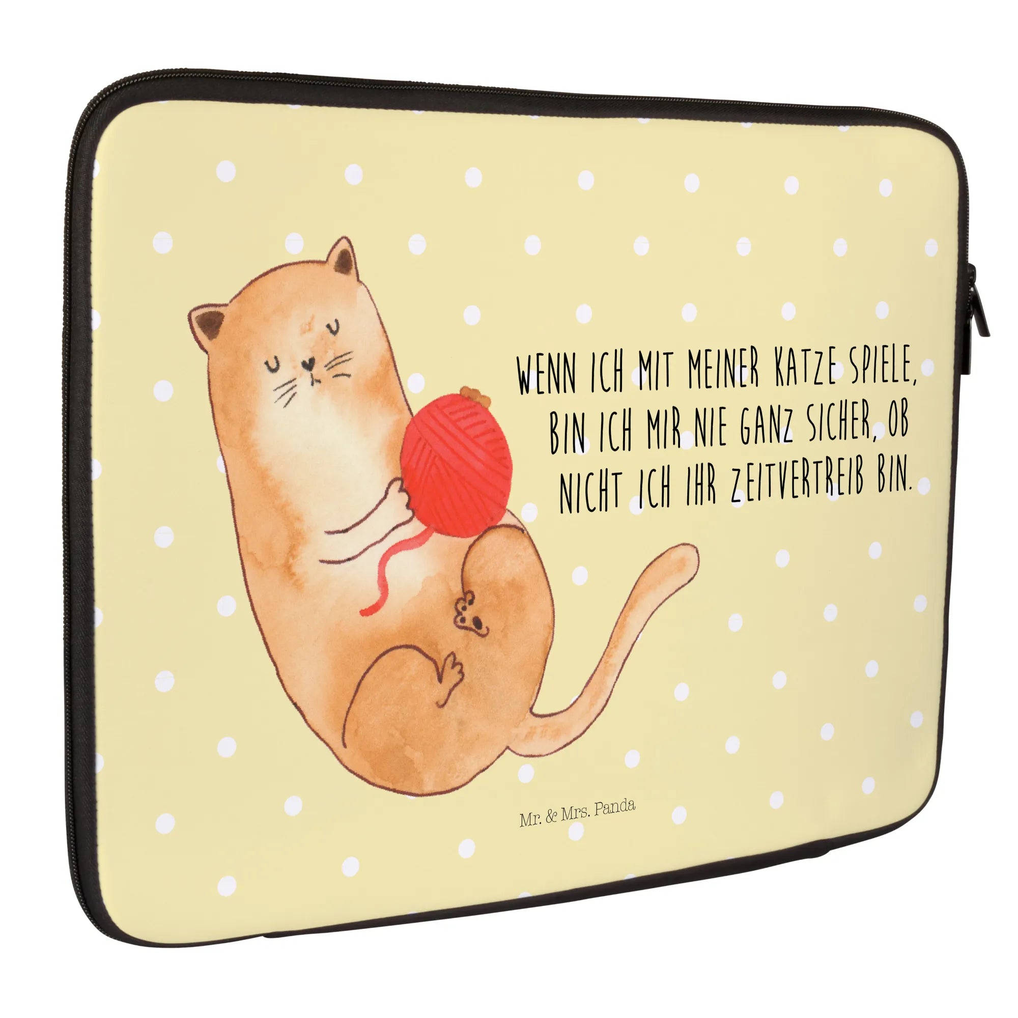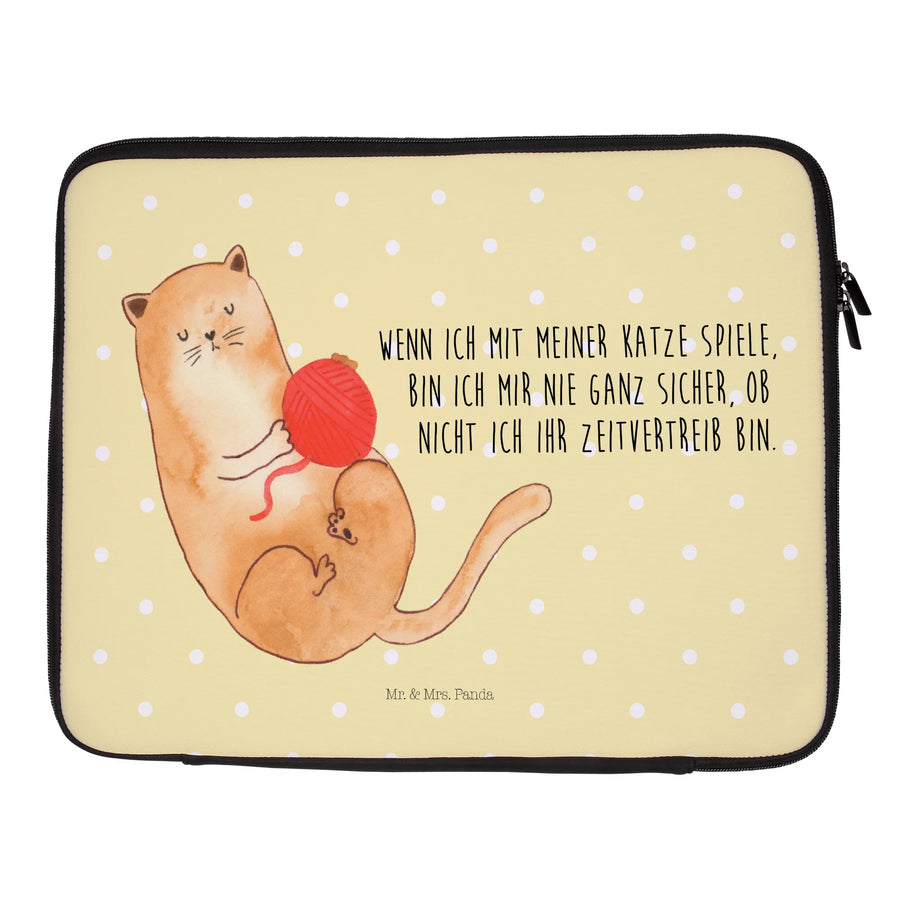 Unsere hübsche Notebooktasche verbindet Schutz und Charme. Auf einem sanften pastellgelben Hintergrund tummelt sich eine handgezeichnete Katze, die begeistert mit ihrem Wollknäuel spielt – ein Motiv aus der liebevollen Katzen - Kollektion von Mr. & Mrs. Panda. Diese Laptoptasche ist perfekt für alle, die Funktionalität mit einem verspielten Katzenmotiv suchen.