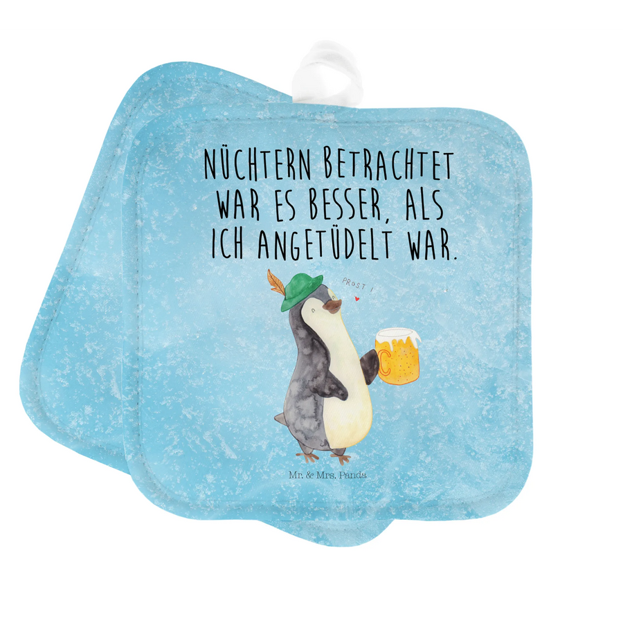 2er Set Topflappen Pinguin Bier - mit Spruch - Eisblau