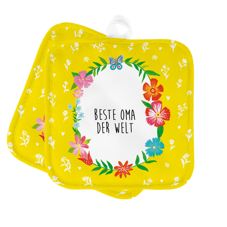 Mit praktischen Aufhängeschlaufen versehen, lassen sie sich ganz einfach aufhängen. Das perfekte Geschenk für die beste Oma – ob als Kleinigkeit oder besondere Aufmerksamkeit, diese Topflappen zaubern garantiert ein Lächeln auf ihr Gesicht. Pflegeleicht sind sie bei 30°C waschbar.