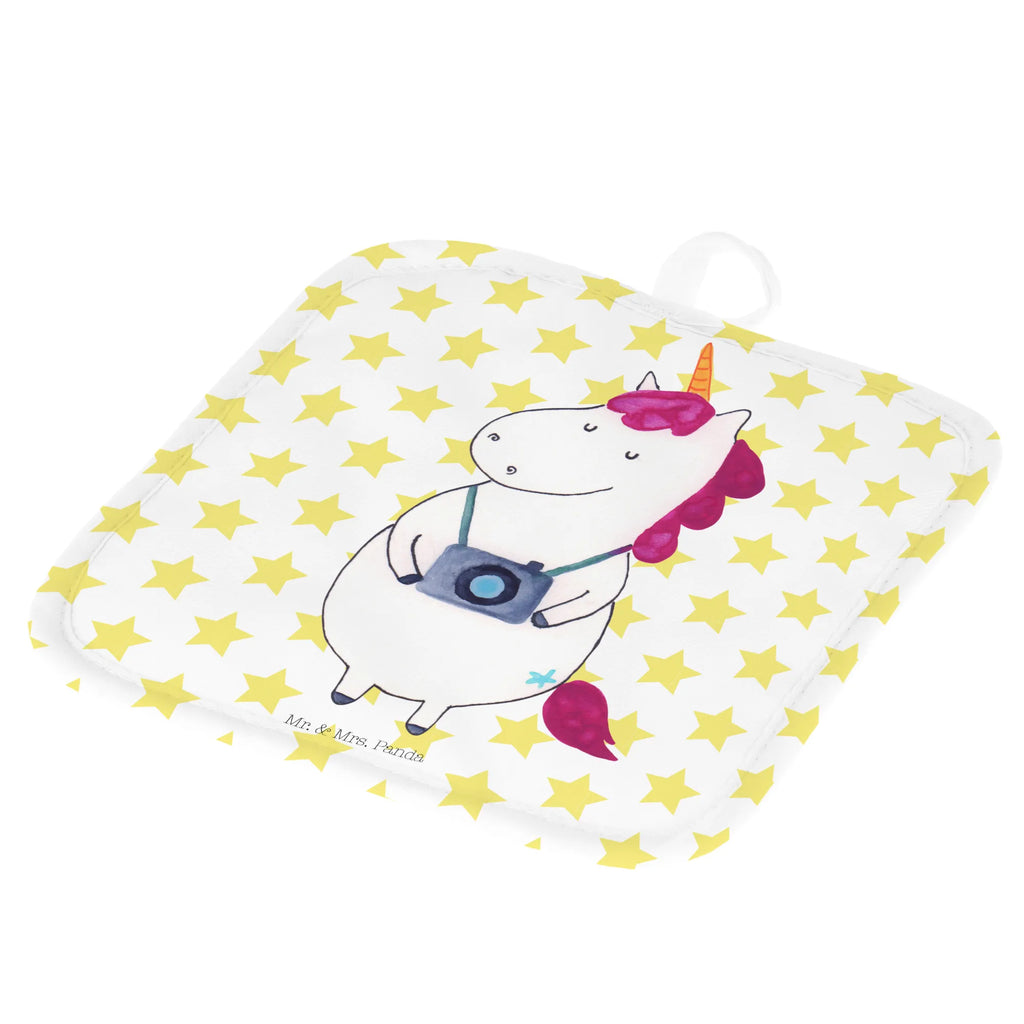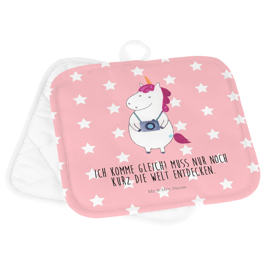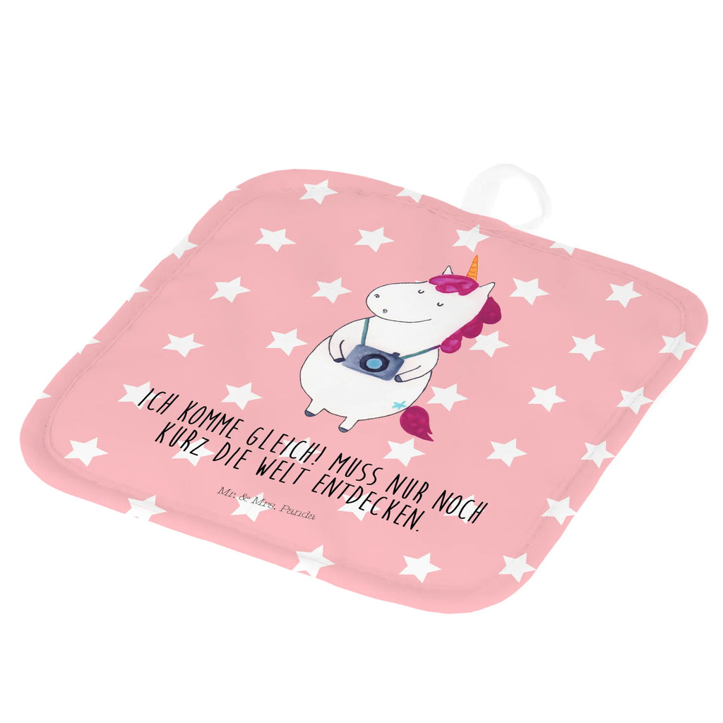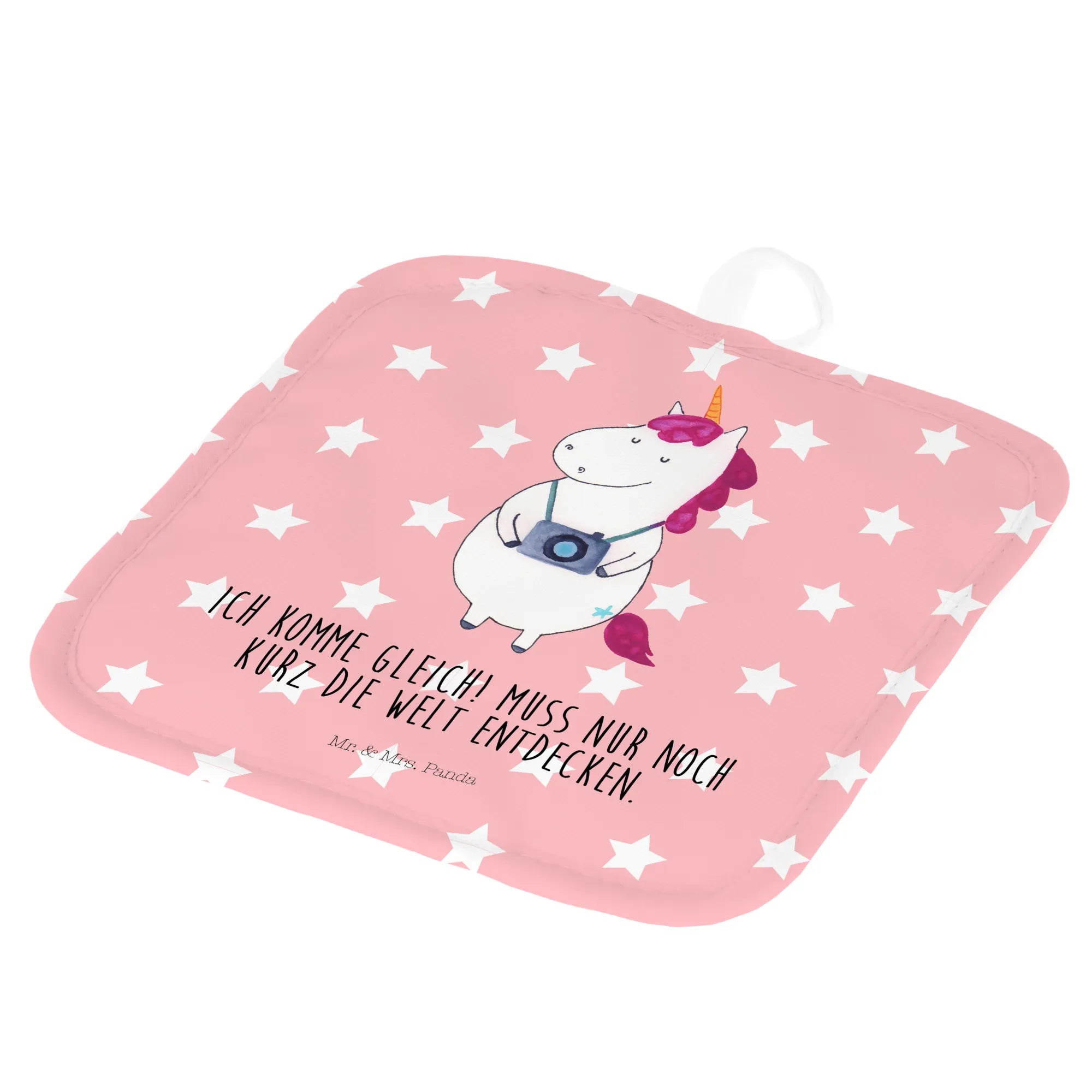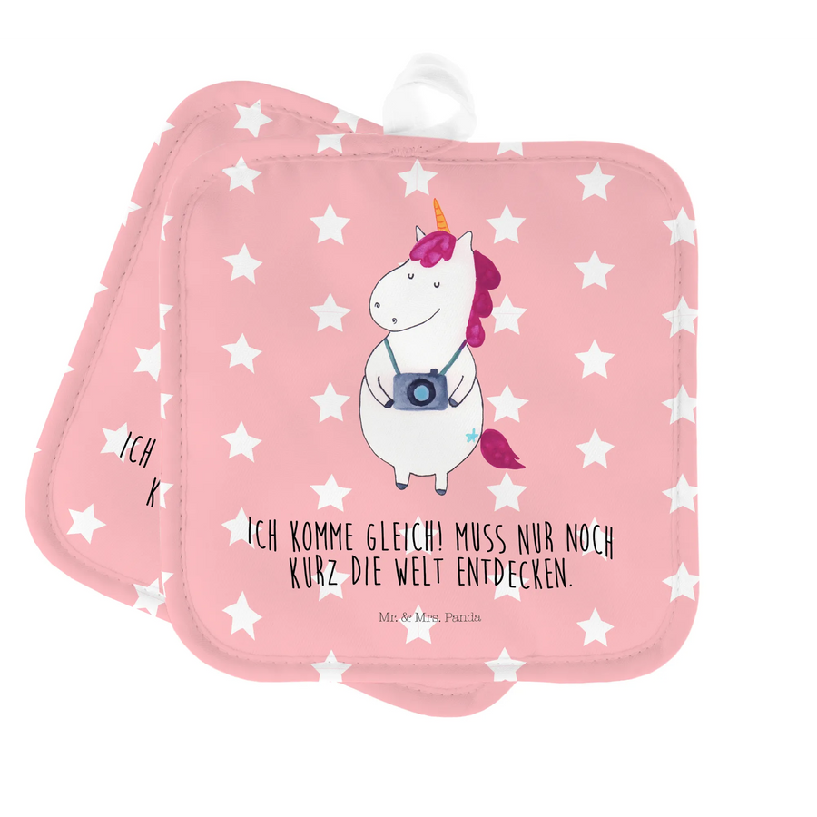 Du suchst nach einem perfekten Geschenk für einen Weltenbummler, der das Fotografieren liebt? Unser 2er Set Topflappen mit dem süßen Einhorn Fotograf Motiv aus der Einhorn-Kollektion von Mr. & Mrs. Panda ist die ideale Wahl! Jedes Stück ist einseitig bedruckt und zeigt ein fröhliches Einhorn, das eine Kamera trägt und bereit ist, die Welt zu entdecken. Dieser lustige Topflappen mit Spruch "Ich komme gleich! Muss nur noch kurz die Welt entdecken." macht nicht nur in der Küche Eindruck, sondern sorgt auch bei jedem Einsatz für gute Laune.