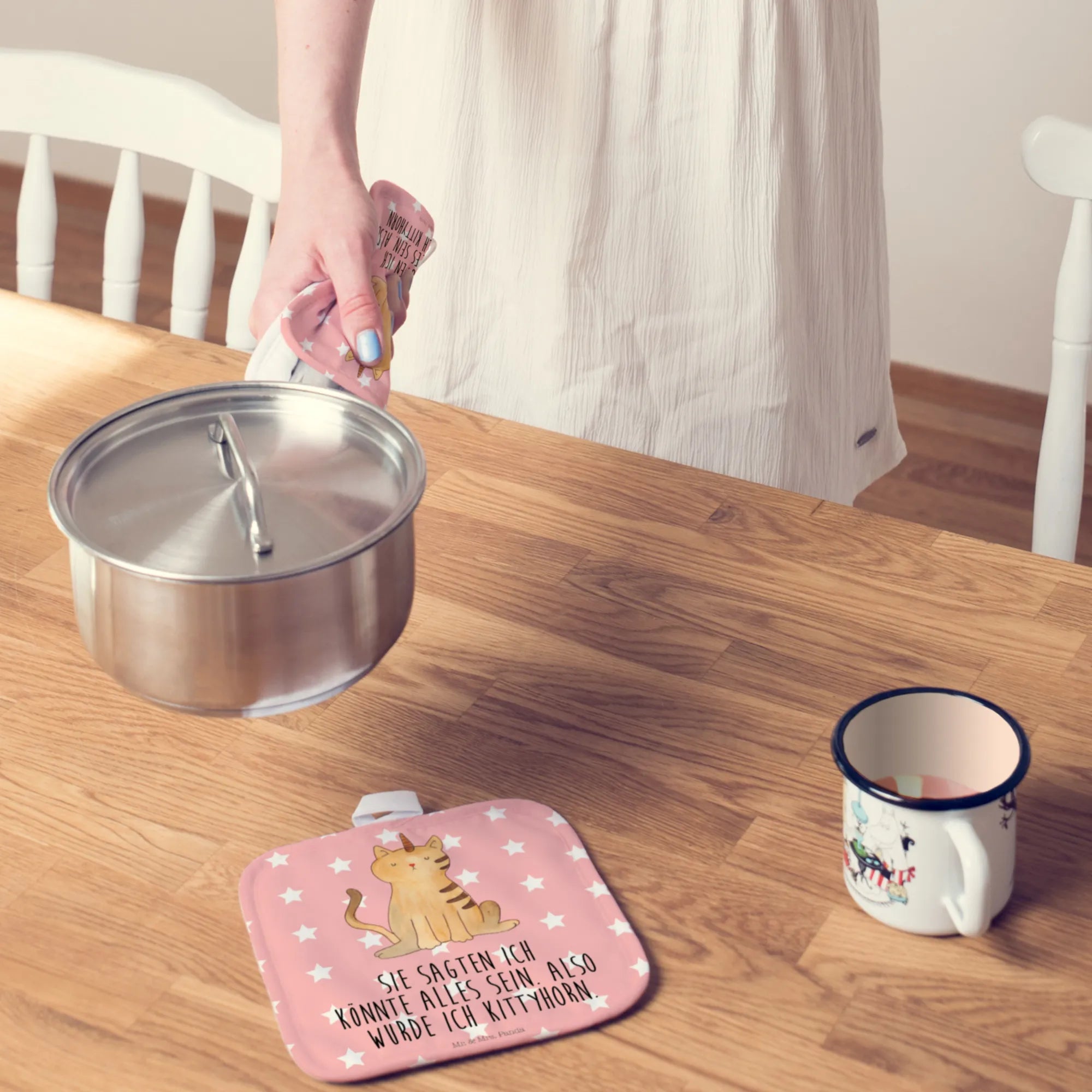 Suchst du ein Geschenk, das Herz und Küche verzaubert? Unser 2er Set Topflappen "Einhorn Katze" aus der Einhorn - Kollektion von Mr. & Mrs. Panda ist genau das Richtige für alle, die Einhörner, Katzen und eine Prise Humor lieben. 🦄🐱