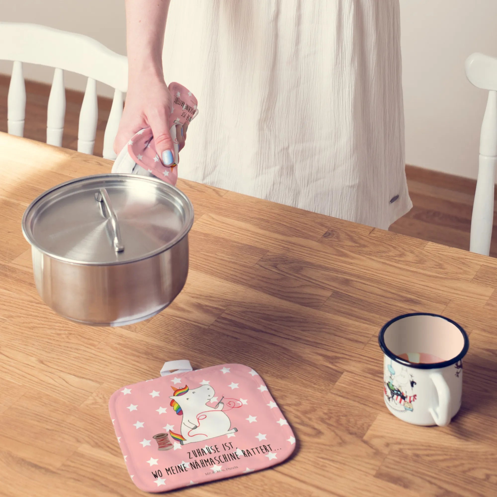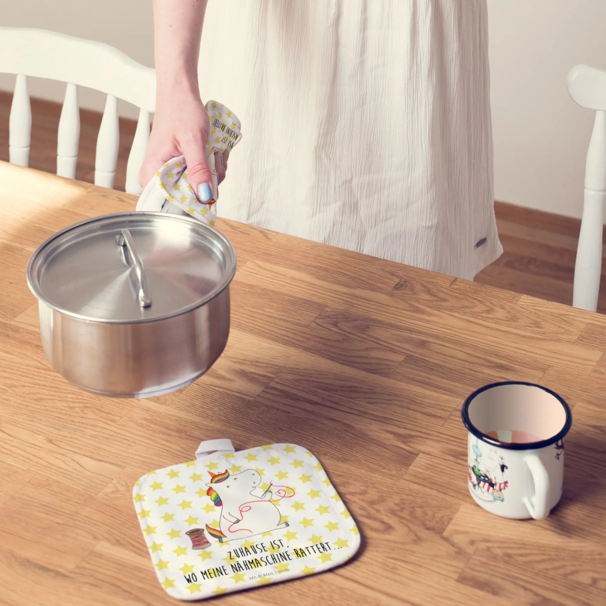 Entdecke das 2er Set Topflappen Einhorn Näherin aus der bezaubernden Einhorn-Kollektion von Mr. & Mrs. Panda! Diese zwei wunderschönen Topflappen sind die perfekten Helfer in deiner Küche im zauberhaften Einhorn-Design. Mit liebevoll handgezeichneten Motiven und dem Spruch "Zuhause ist, wo meine Nähmaschine rattert" bringen sie ganz viel Freude beim Kochen und Backen.