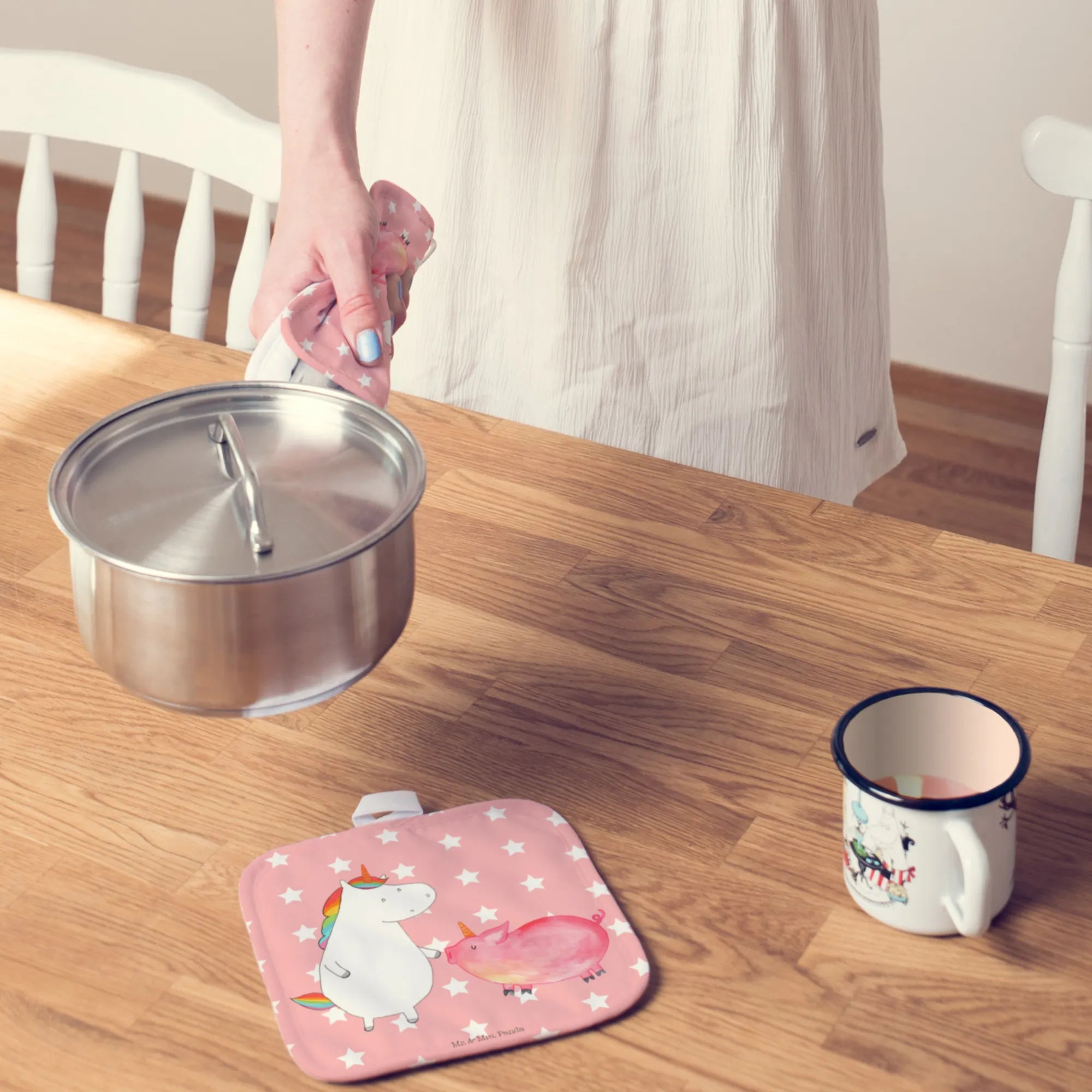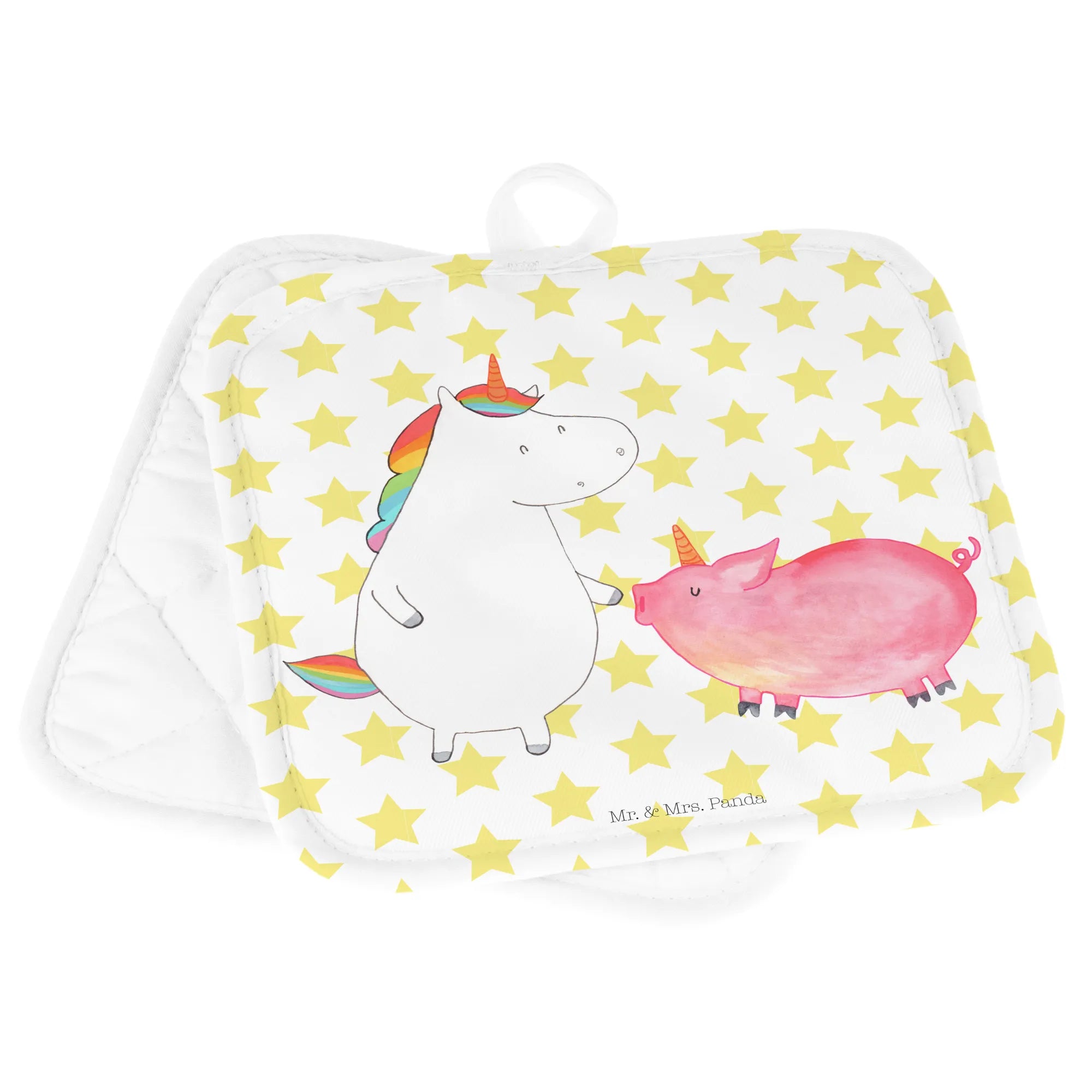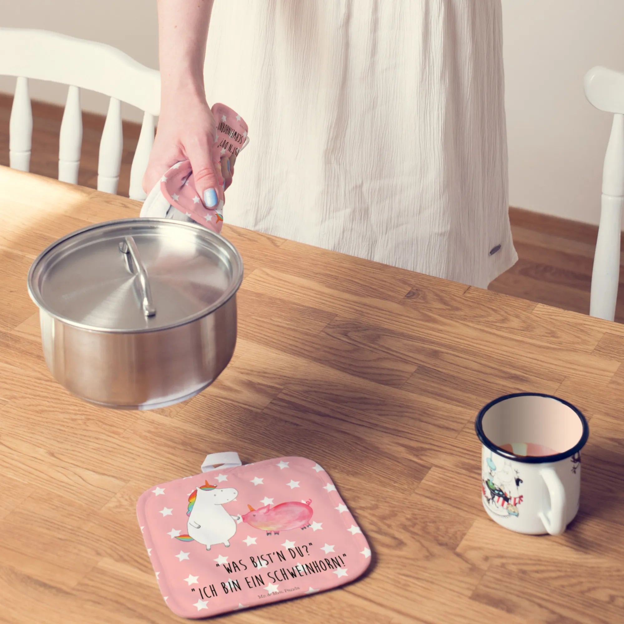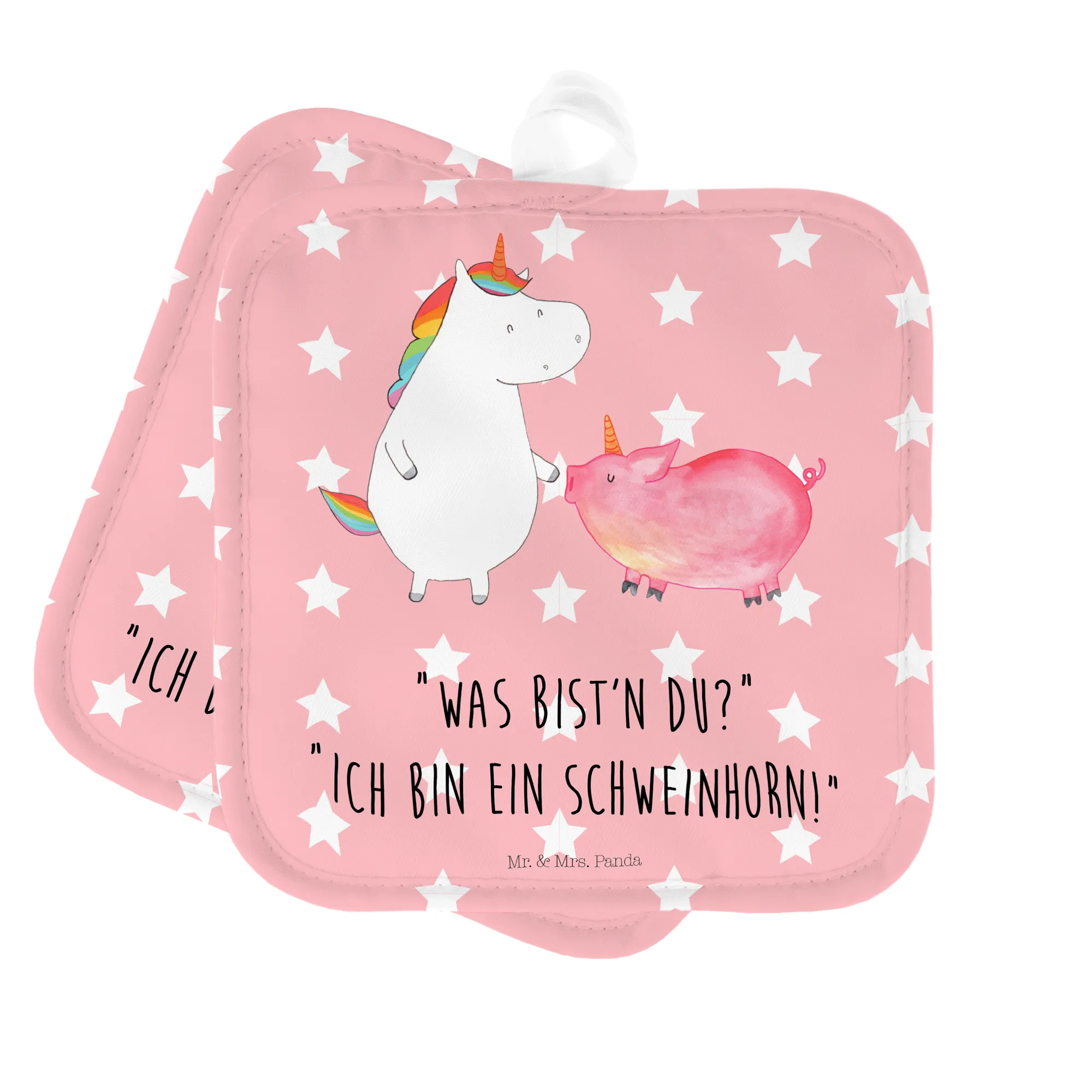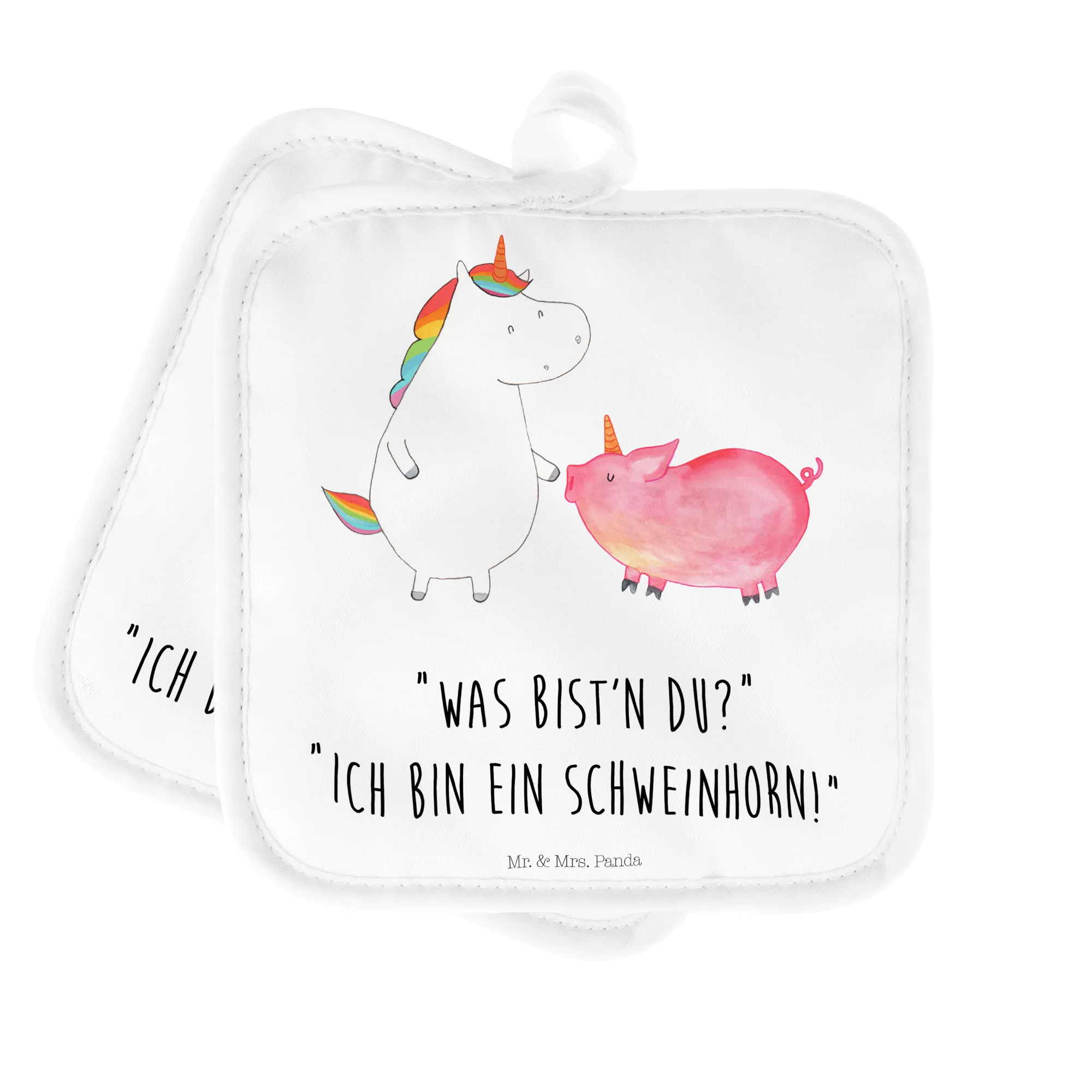 Suchst du nach einem Geschenk, das Herzen höherschlagen lässt und zugleich praktisch ist? Unser 2er Set Topflappen aus der Einhorn - Kollektion von Mr. & Mrs. Panda verbindet süße Handzeichnung mit einem frechen Spruch: "Was bist'n du?" – "Ich bin ein Schweinhorn." 🐷🦄