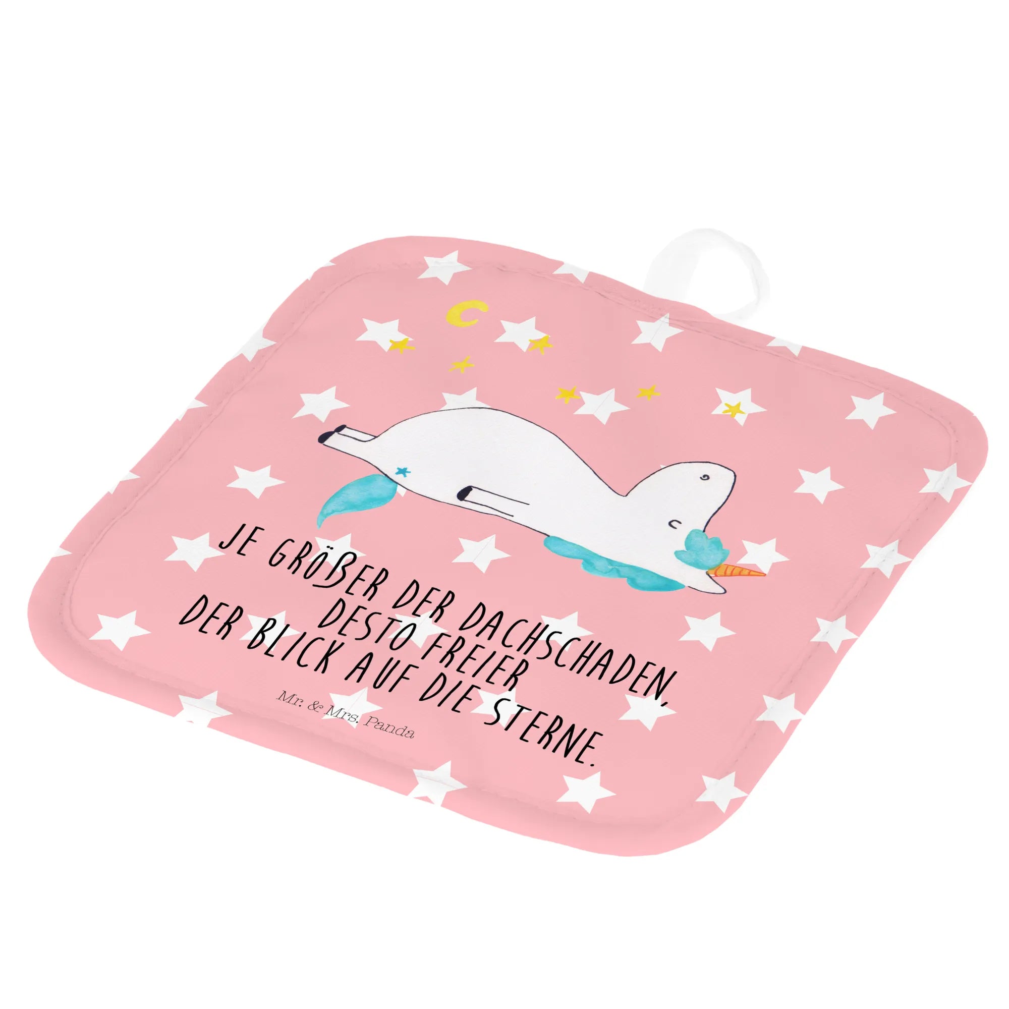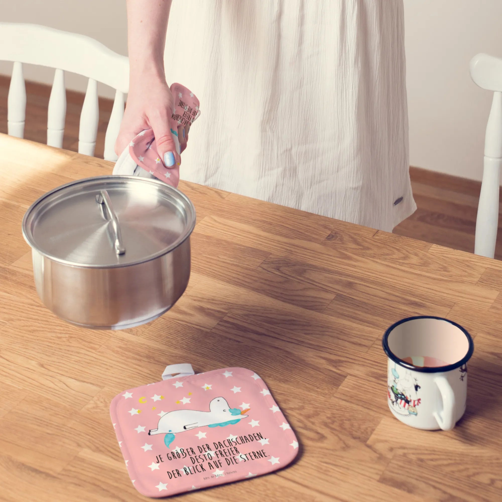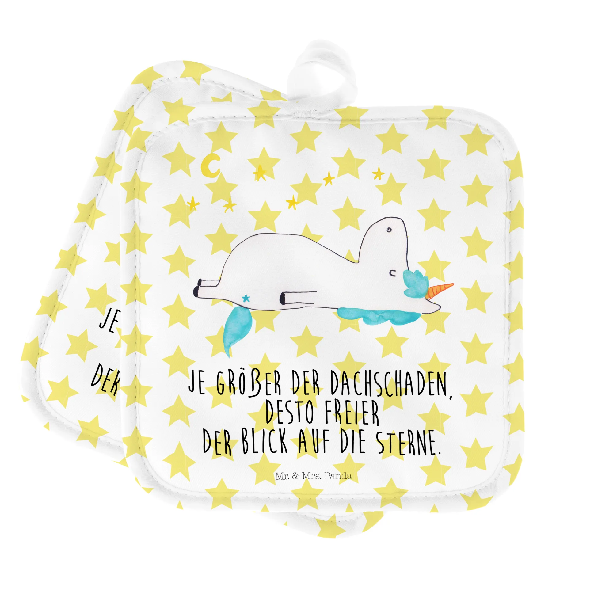 Entdecke die zauberhaften Einhorn Topflappen im 2er Set von Mr. & Mrs. Panda! Diese hochwertigen Topflappen sind perfekt für alle Einhorn-Liebhaber und bringen eine Portion Magie in deine Küche. Das Design zeigt ein niedliches Einhorn, das verträumt in den Sternenhimmel schaut, und der witzige Spruch "Je größer der Dachschaden, desto freier der Blick auf die Sterne" sorgt für ein Lächeln beim Kochen.