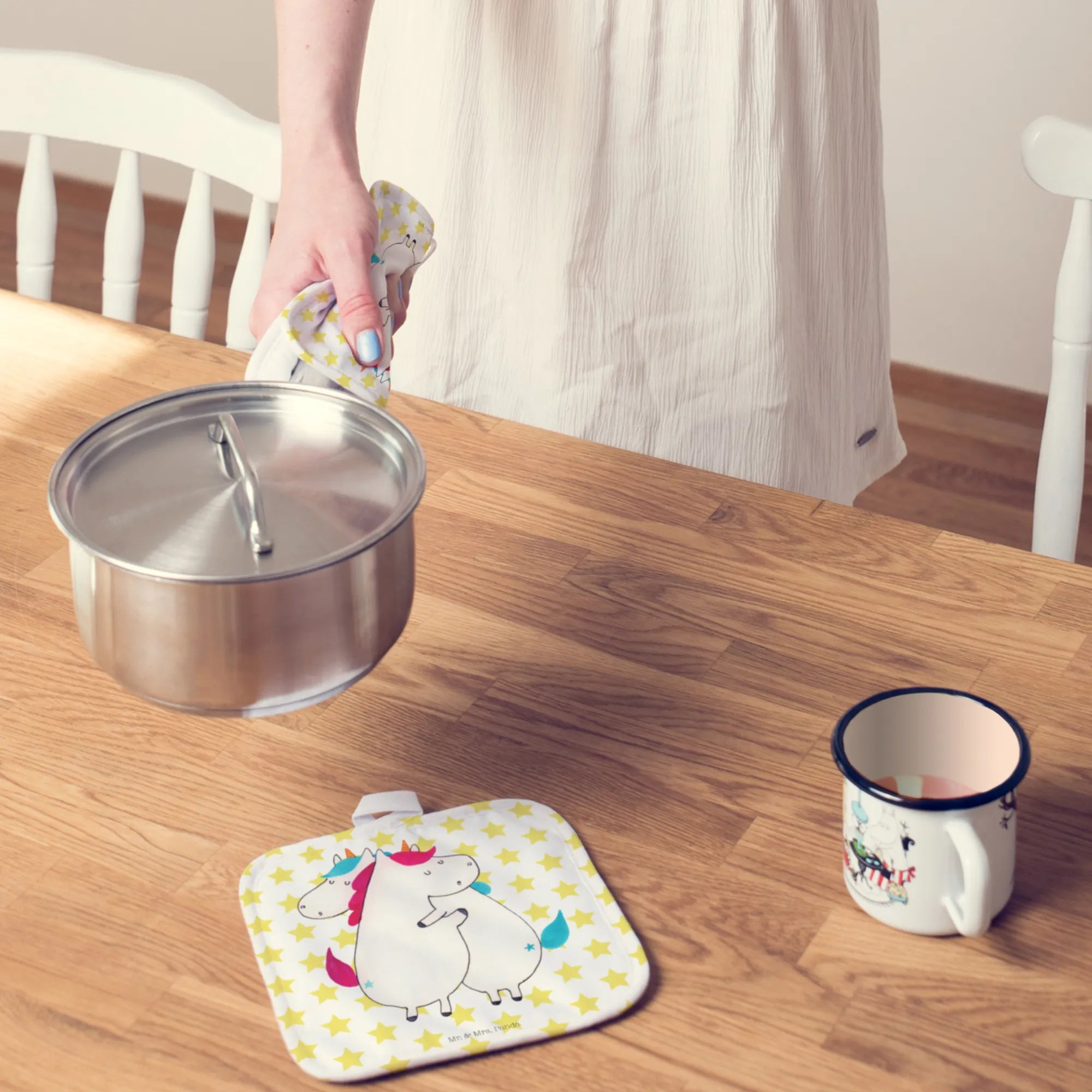 Willkommen in der Welt von Mr. & Mrs. Panda, wo Design auf Funktionalität trifft. Unsere 2er Set Topflappen mit einer Größe von 170 mm x 170 mm und einer Dicke von 5 mm sind deine perfekten Begleiter beim Umgang mit heißen Speisen. Aus 100% Polyester gefertigt, überzeugen sie mit außergewöhnlicher Hitzebeständigkeit und sind bei 30°C leicht zu reinigen. Die einseitigen Druckmotive und Sprüche bringen nicht nur Farbe in deine Küche, sondern zaubern auch ein Lächeln auf dein Gesicht. Dank der praktischen Aufhängeschlaufen sind sie stets griffbereit. Egal ob als schicker Topfuntersetzer oder handlicher Ofenhandschuh, mit diesen Topflappen von Mr. & Mrs. Panda machst du jede Mahlzeit zum Vergnügen.