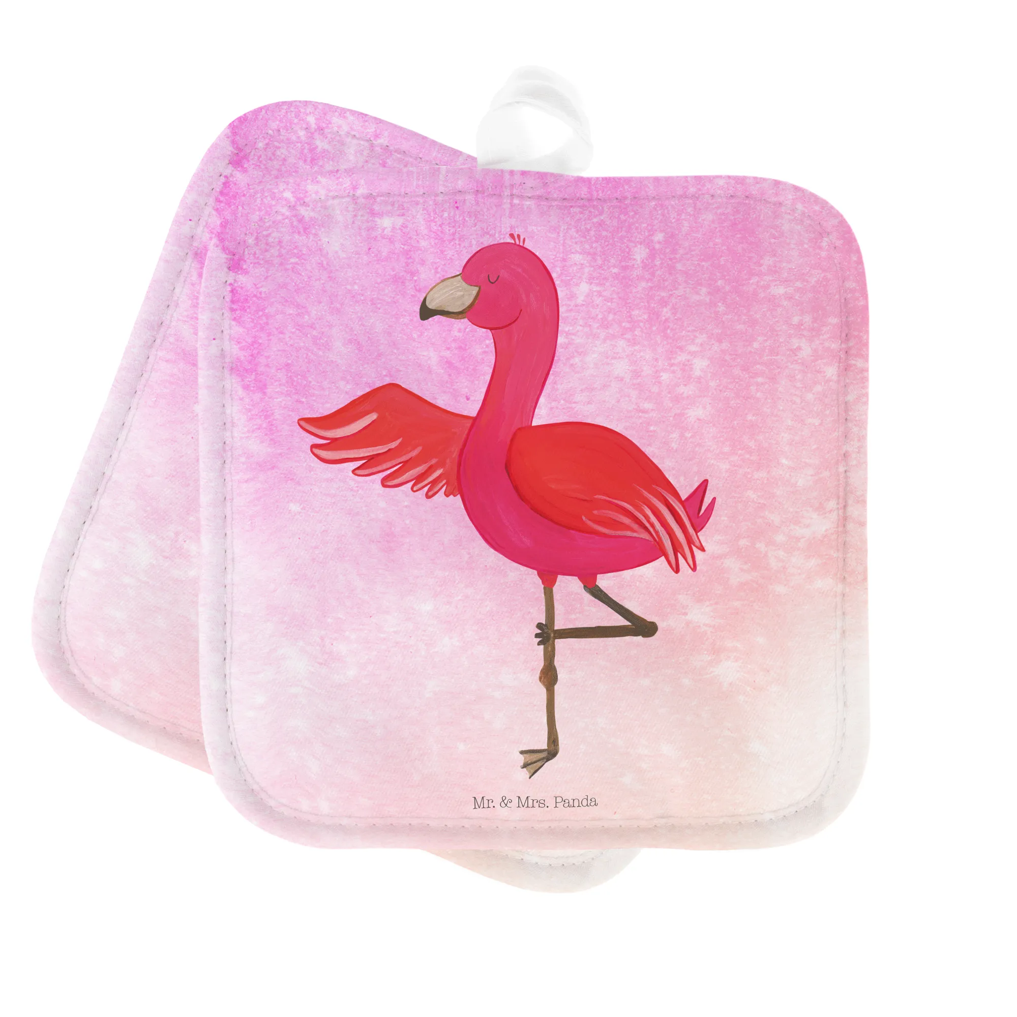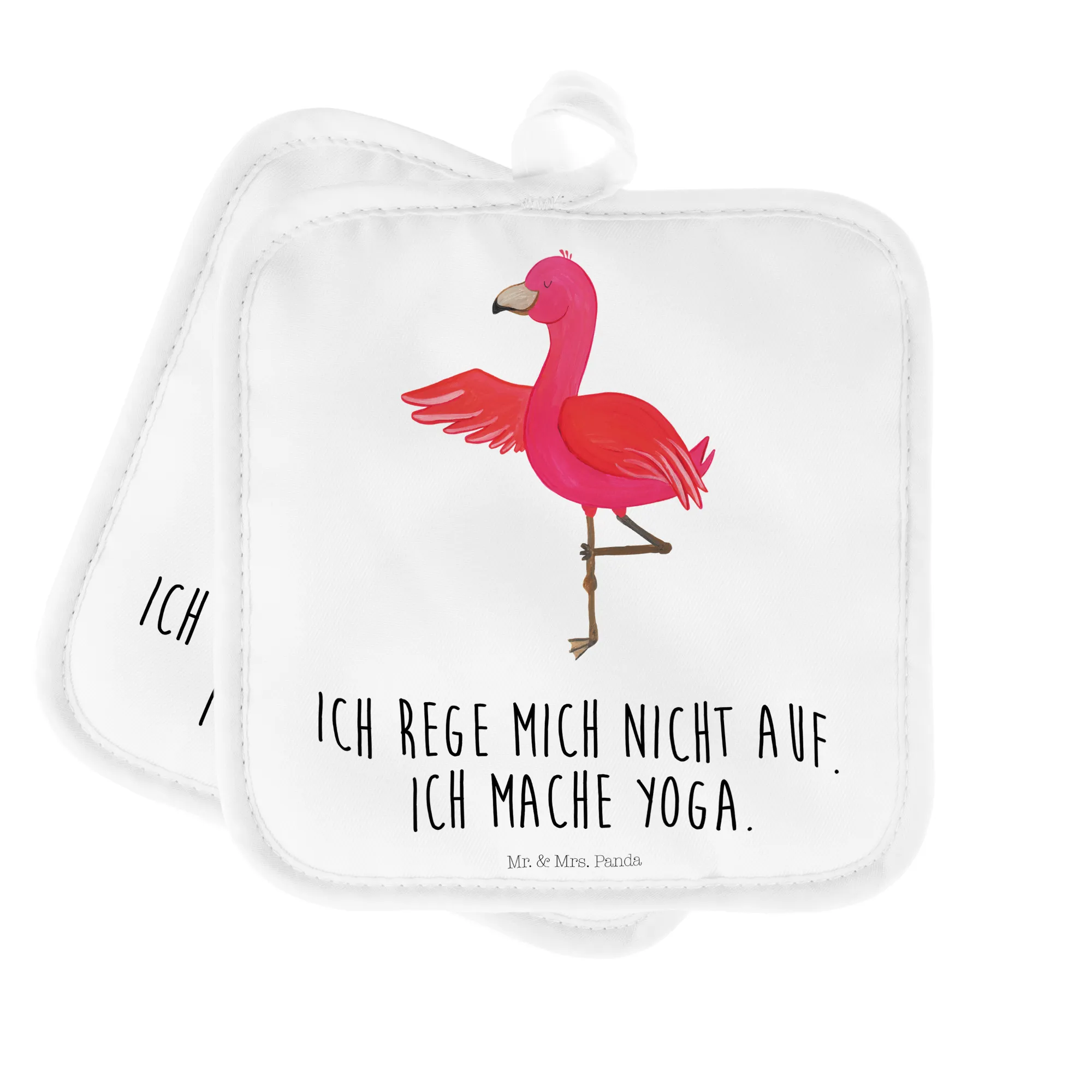 Kochst du gerne? Dann sind die 2er Set Topflappen Flamingo Yoga aus der Flamingo-Kollektion von Mr. & Mrs. Panda das perfekte Geschenk für dich oder deine Freunde! Mit ihrem charmanten Design und dem aufgedruckten Spruch 'Ich rege mich nicht auf. Ich mache Yoga.' bringen sie eine entspannte Stimmung in jede Küche.