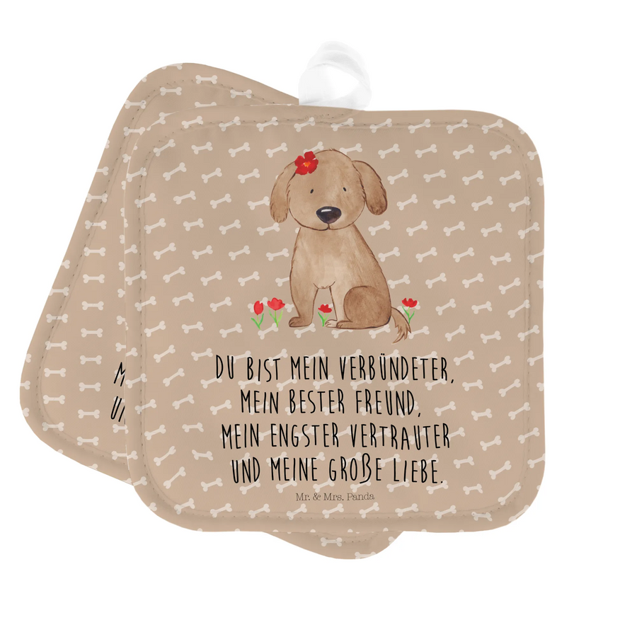 Entdecke das perfekte Geschenk für alle Hundeliebhaber mit dem 2er Set Topflappen "Hund Hundedame" aus der zauberhaften Hunde Kollektion von Mr. & Mrs. Panda!