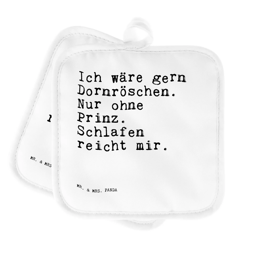Entdecke die zauberhaften Topflappen im 2er Set von Mr. & Mrs. Panda! Mit dem spritzigen Spruch "Ich wäre gern Dornröschen. Nur ohne Prinz. Schlafen reicht mir." sind diese Topflappen nicht nur praktisch, sondern auch ein echter Blickfang in Deiner Küche. Sie sind perfekt für alle, die die süßen Märchen und die Welt der Prinzessinnen lieben. Ob als Geschenk für eine gute Freundin zum Geburtstag, zur Einweihung einer neuen Wohnung oder einfach als kleine Aufmerksamkeit zwischendurch – diese Topflappen bringen ein Lächeln in jede Küche! 🌟