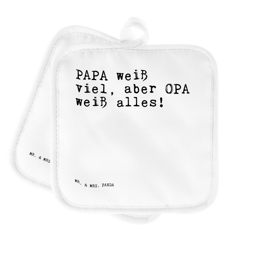 Die 2er Set Topflappen "PAPA weiß viel, aber OPA weiß alles!" von Mr. & Mrs. Panda sind das perfekte Geschenk für all jene, die Wert auf stilvolle und humorvolle Küchenausstattung legen. Diese wunderschön gestalteten Topflappen sind nicht nur praktisch, sondern bringen auch eine gehörige Portion Persönlichkeit in deine Küche. Hergestellt aus hochwertiger Kunstfaser, sind sie besonders hitzebeständig und strapazierfähig.