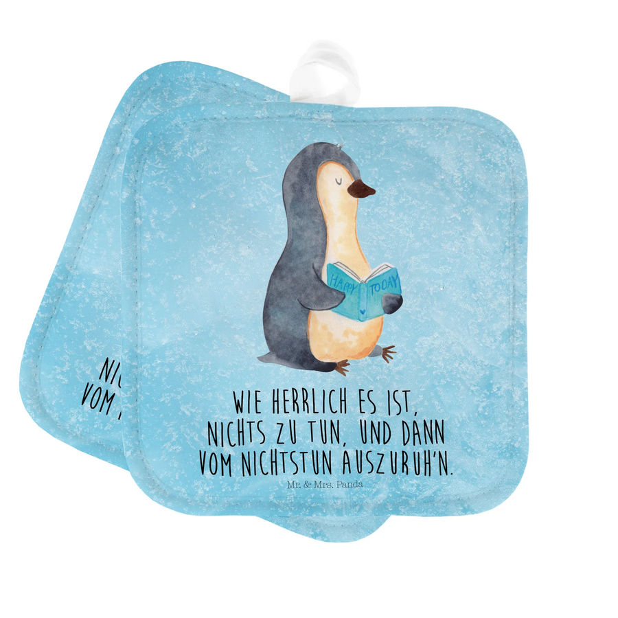 2er Set Topflappen Pinguin Buch - mit Spruch - Eisblau