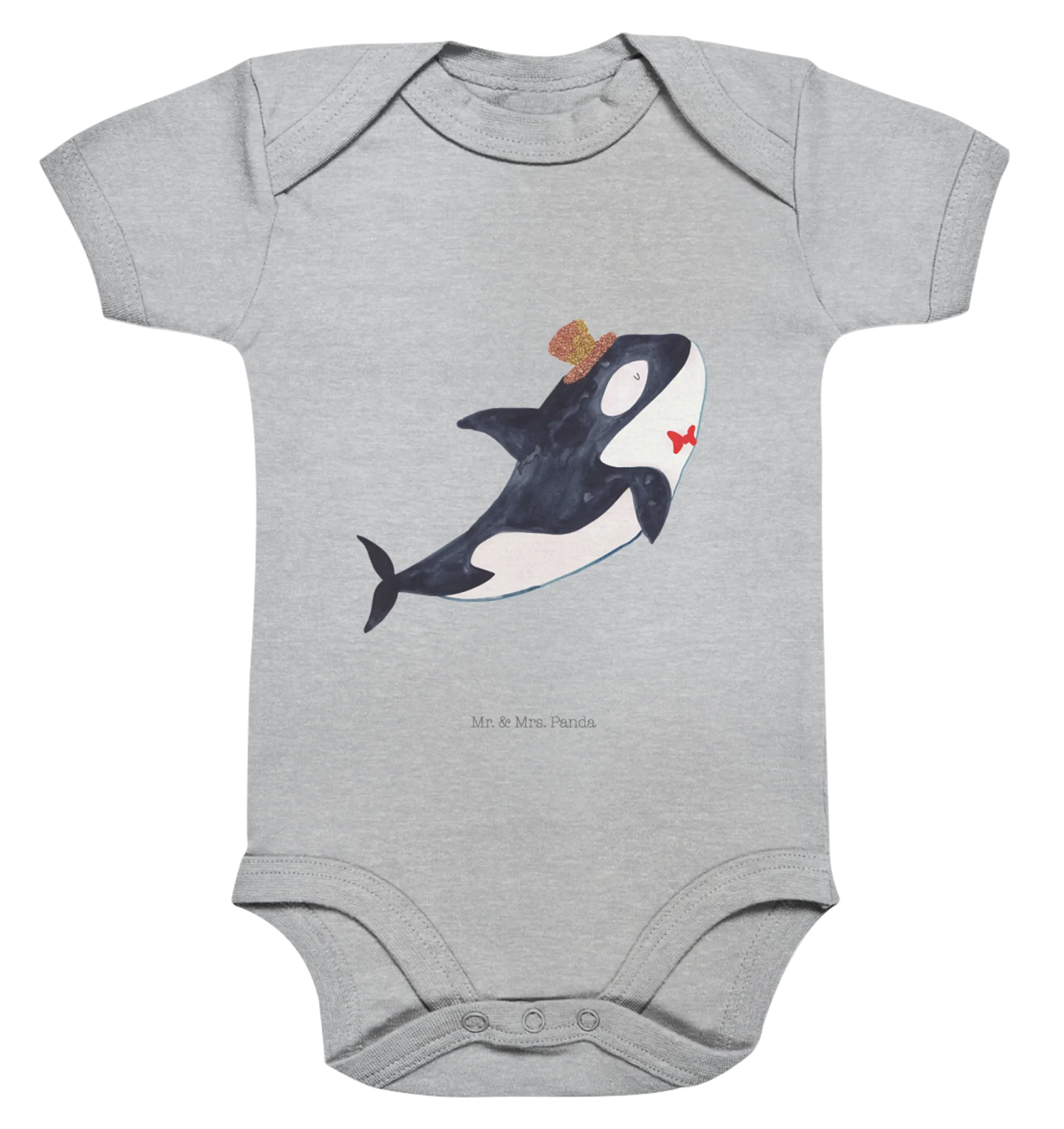 Der Organic Baby Body mit dem bezaubernden Orca Zylinder aus unserer liebenswerten Meerestiere Kollektion ist das perfekte Geschenk für alle kleinen Entdecker und deren Eltern. Auf diesem zauberhaften Babystrampler prangt ein niedlicher Orca in einer verspielten Pose, der mit einem eleganten Zylinder und einer blumigen Verzierung versehen ist. Der kleine rote Fisch, der ihm zur Seite schwimmt, verleiht dem Design einen extra Hauch von Freude und Liebe.