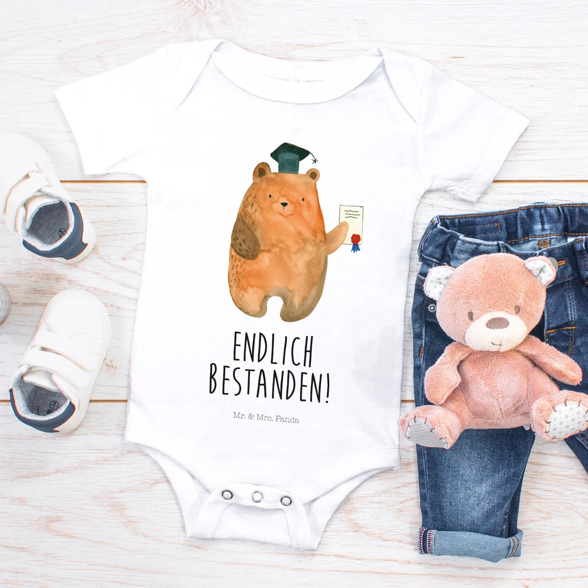 Der Organic Baby Body "Prüfungsbär" aus der liebevollen Bär-Kollektion von Mr. & Mrs. Panda ist das perfekte Geschenk zur Feier eines neuen Lebensabschnitts!