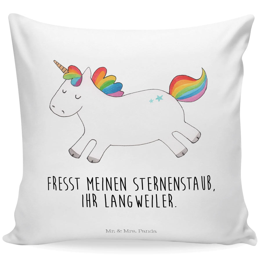 Das 40x40 Kissen "Einhorn Happy" von Mr. & Mrs. Panda ist das perfekte Geschenk für alle, die es lieben, glücklich zu sein! Mit seinem zauberhaften Motiv eines fröhlichen Einhorns und dem witzigen Spruch "Fresst meinen Sternenstaub, ihr Langweiler" bringt dieses Kissen sofort gute Laune in jedes Zuhause.