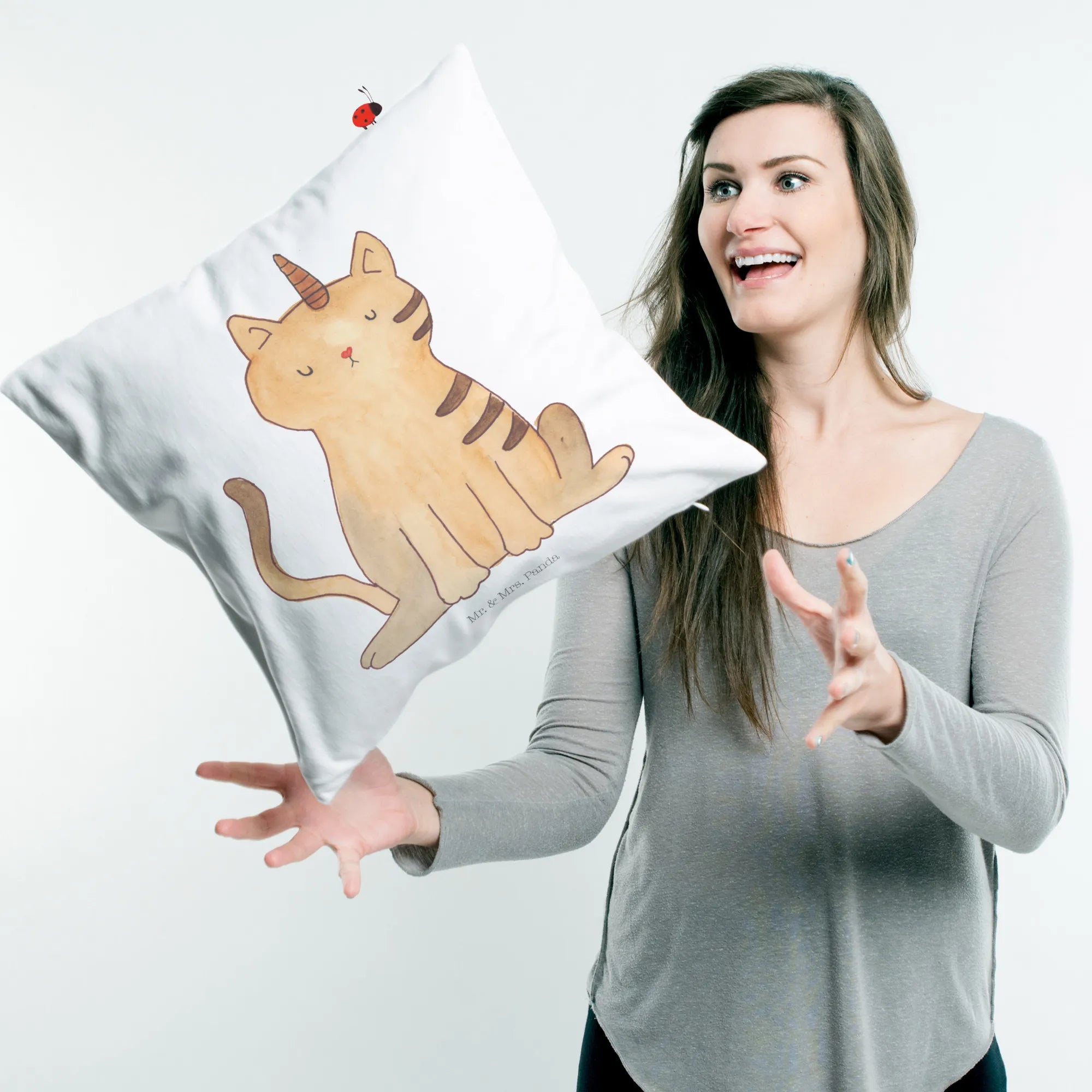 Das 40x40 Kissen Einhorn Katze aus der zauberhaften Einhorn Kollektion von Mr. & Mrs. Panda ist das perfekte Geschenk für alle Einhorn- und Katzenliebhaber. Mit diesem Kissen bringst du einen Hauch von Magie in dein Zuhause! Die süße Katze mit ihrem strahlenden Horn auf dem Kopf zaubert ein Lächeln auf jedes Gesicht. Egal, ob für Kindergeburtstage, zu Weihnachten oder einfach als Geschenk für einen lieben Menschen – dieses Kissen ist immer eine gute Wahl.
