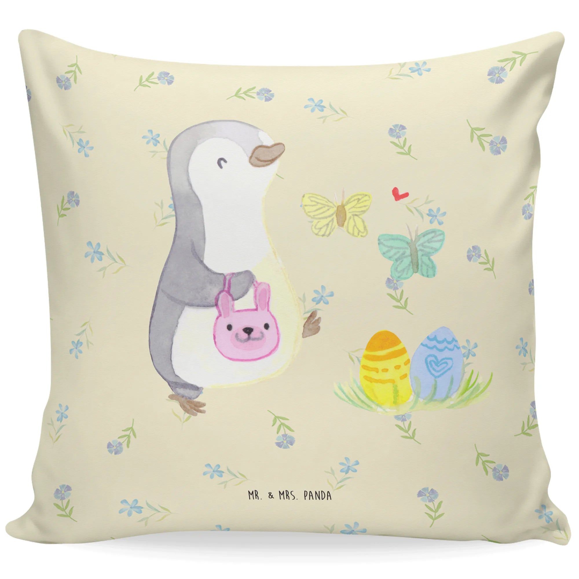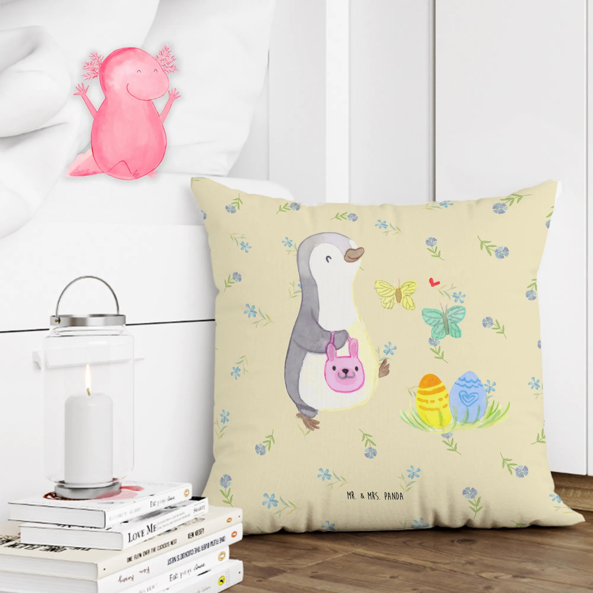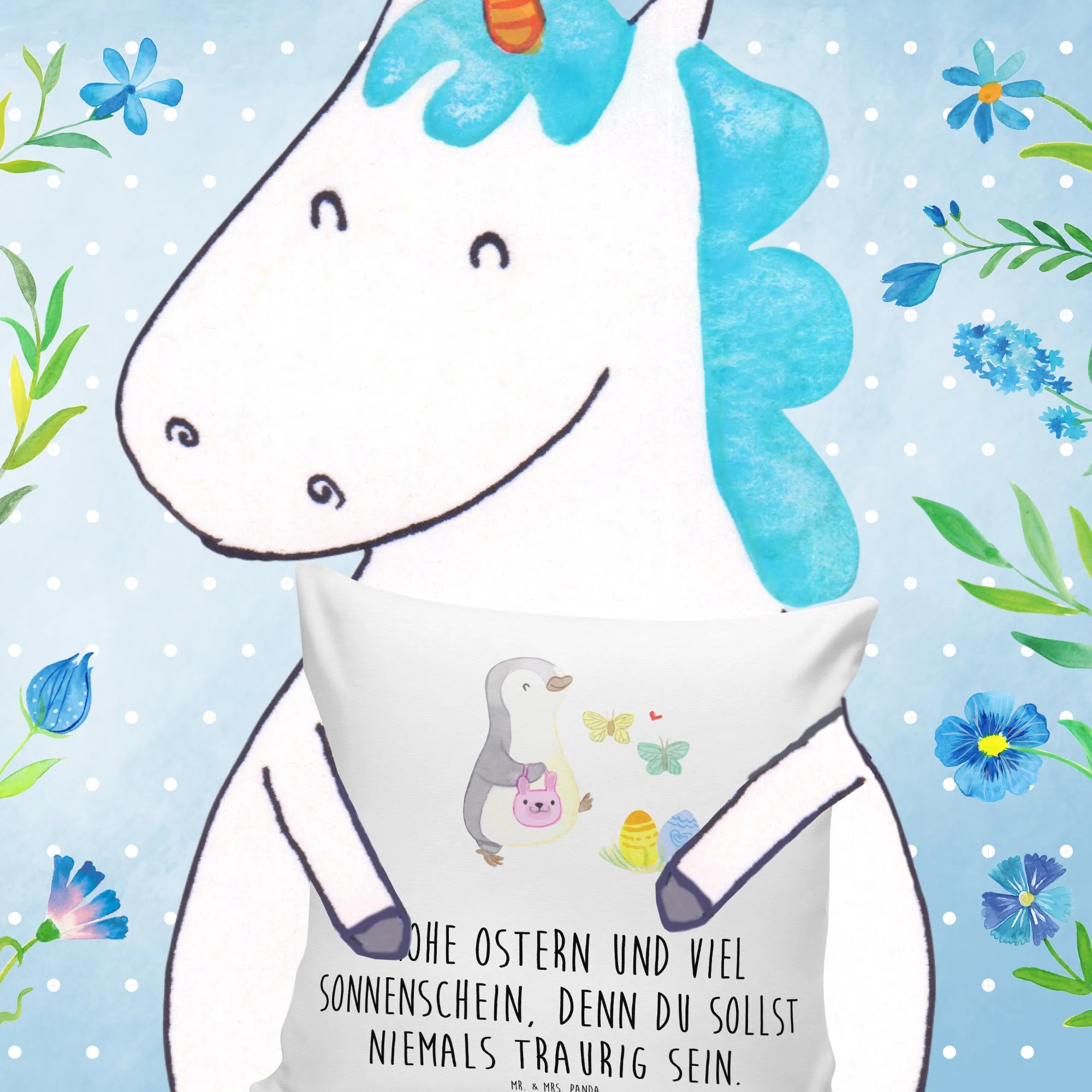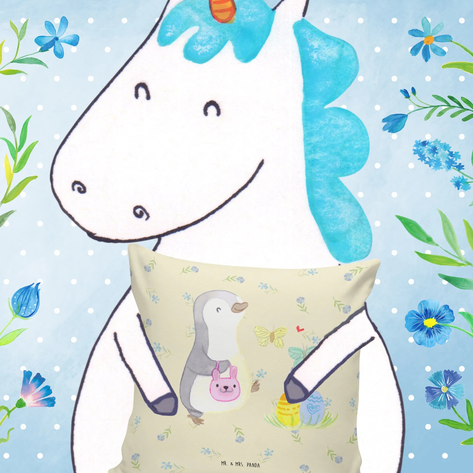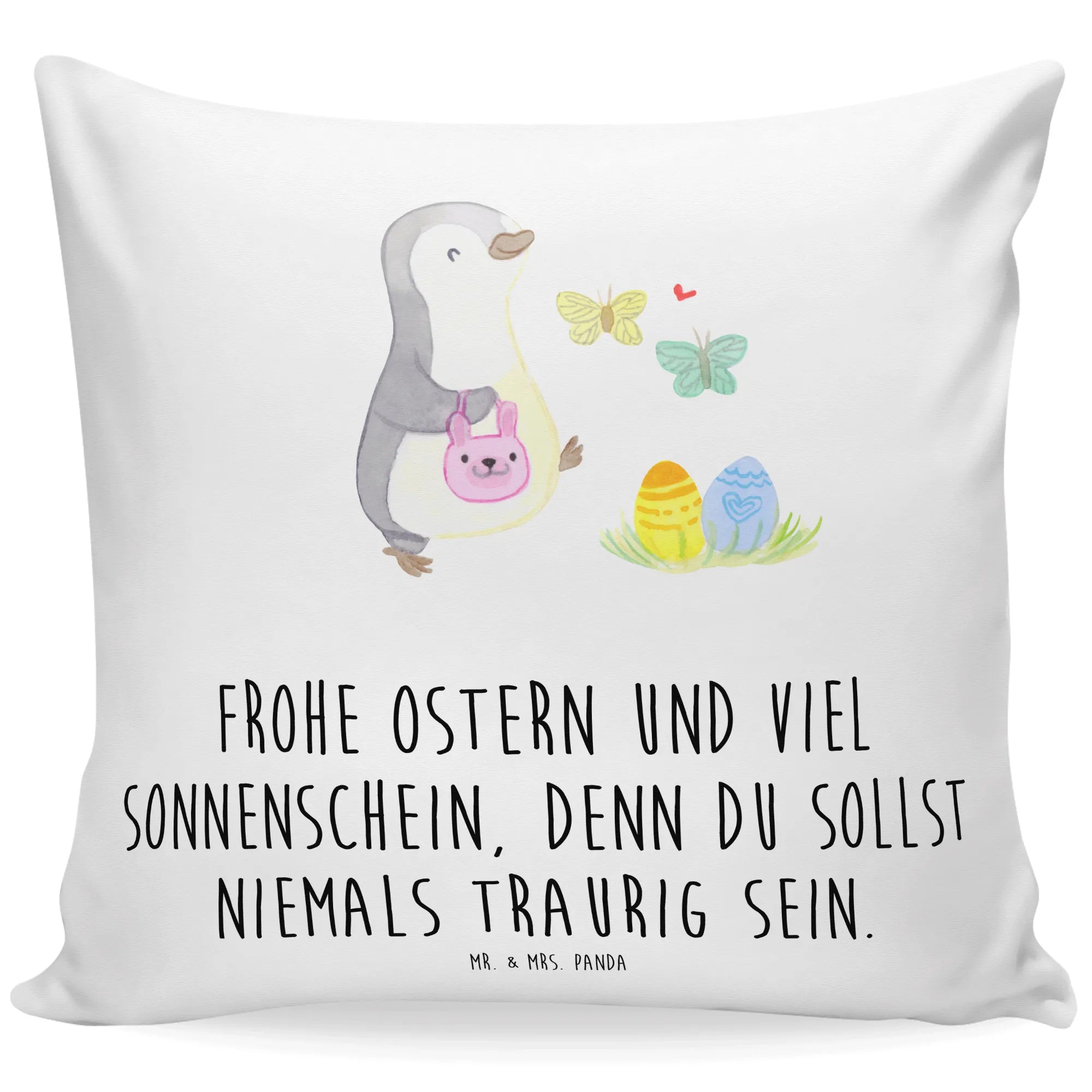 Das besondere Highlight dieser Kissenhülle ist das liebevoll handgezeichnete Motiv von Mr. & Mrs. Panda. Der Pinguin auf der Eiersuche erweckt nicht nur Glücksgefühle, sondern inspiriert auch zu schönen Gesprächen über die bevorstehenden Feiertage. Zudem bringt der Slogan "Frohe Ostern und viel Sonnenschein, denn du sollst niemals traurig sein." eine positive Botschaft, die sich ideal für das Osterfest eignet.