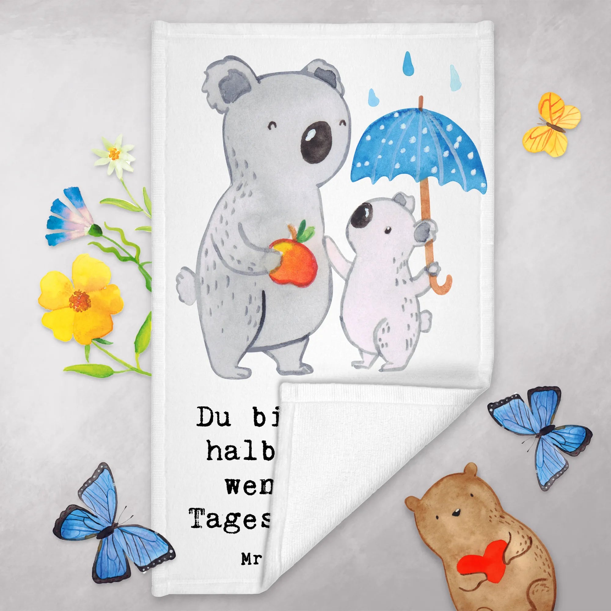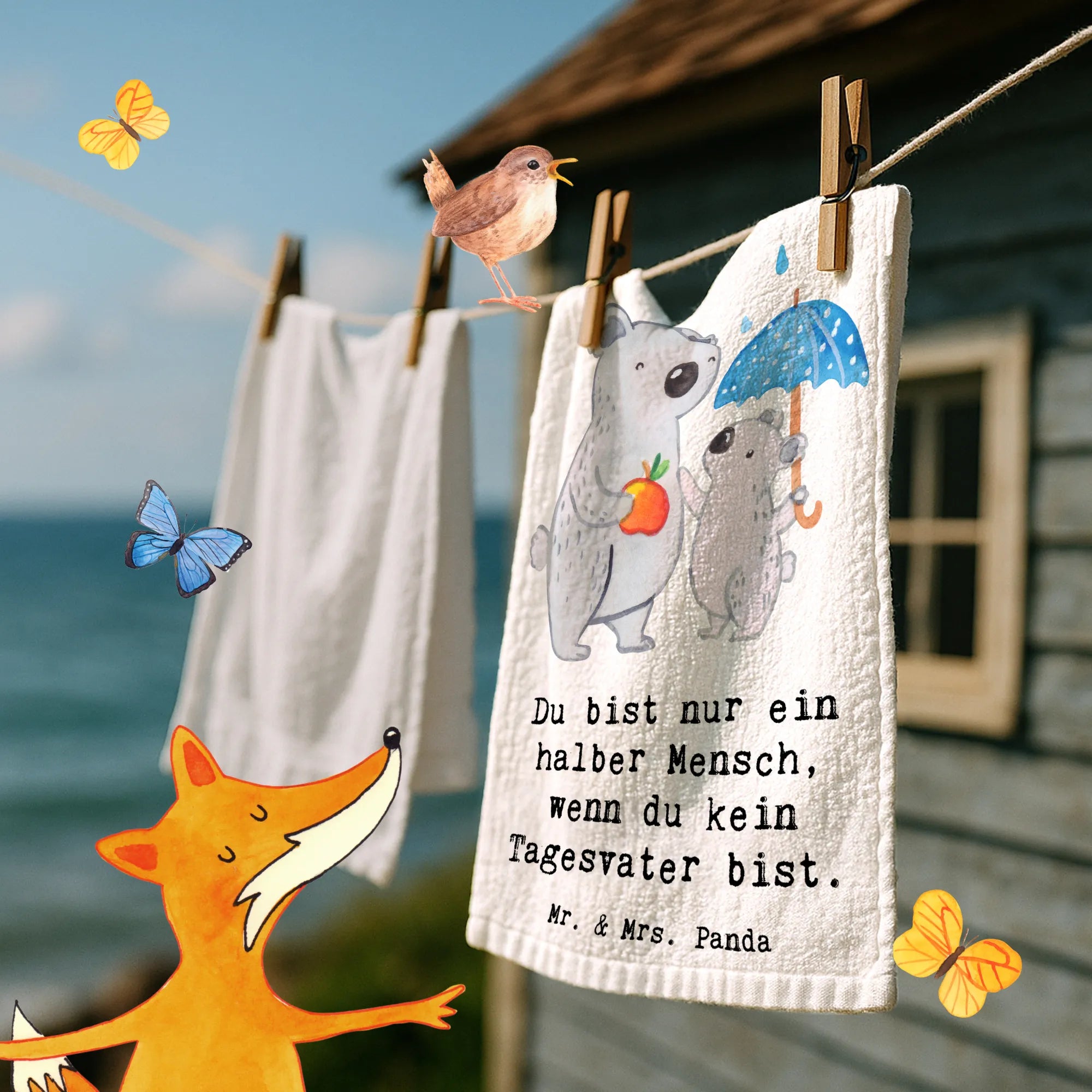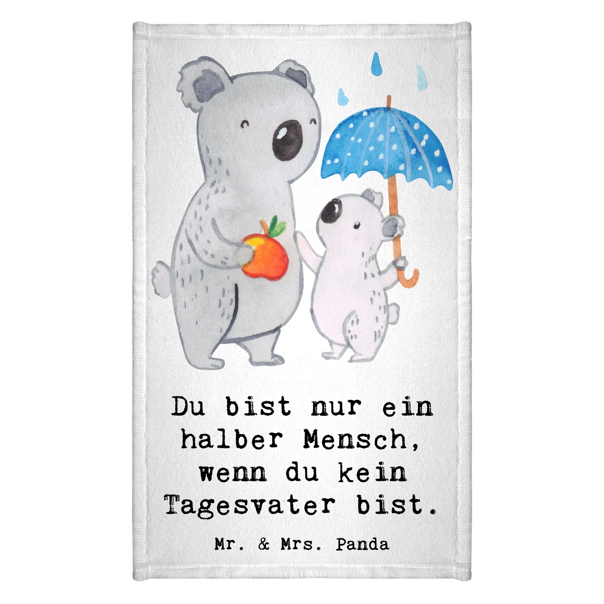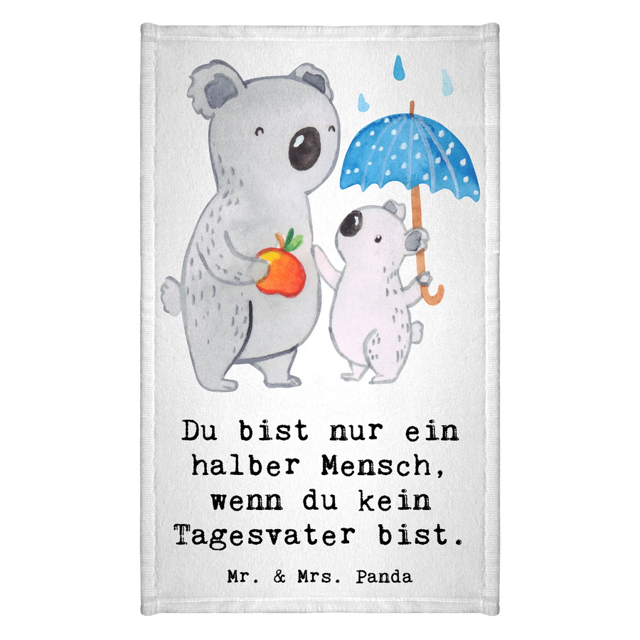 Das Gästetuch "Tagesvater mit Herz" aus der Berufe-Kollektion von Mr. & Mrs. Panda ist das perfekte Geschenk für all die liebevollen Tagesväter da draußen! Mit einem süßen Motiv eines Koalas, der ein kleines Koala-Kind unter einem Regenschirm schützt und ihm einen Apfel bringt, versprüht dieses Handtuch jede Menge Charme und Wärme.