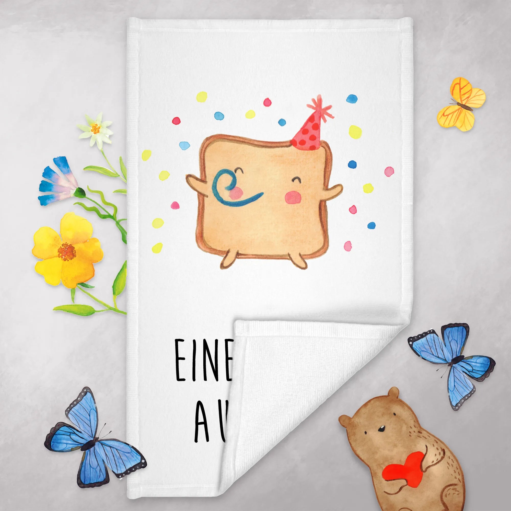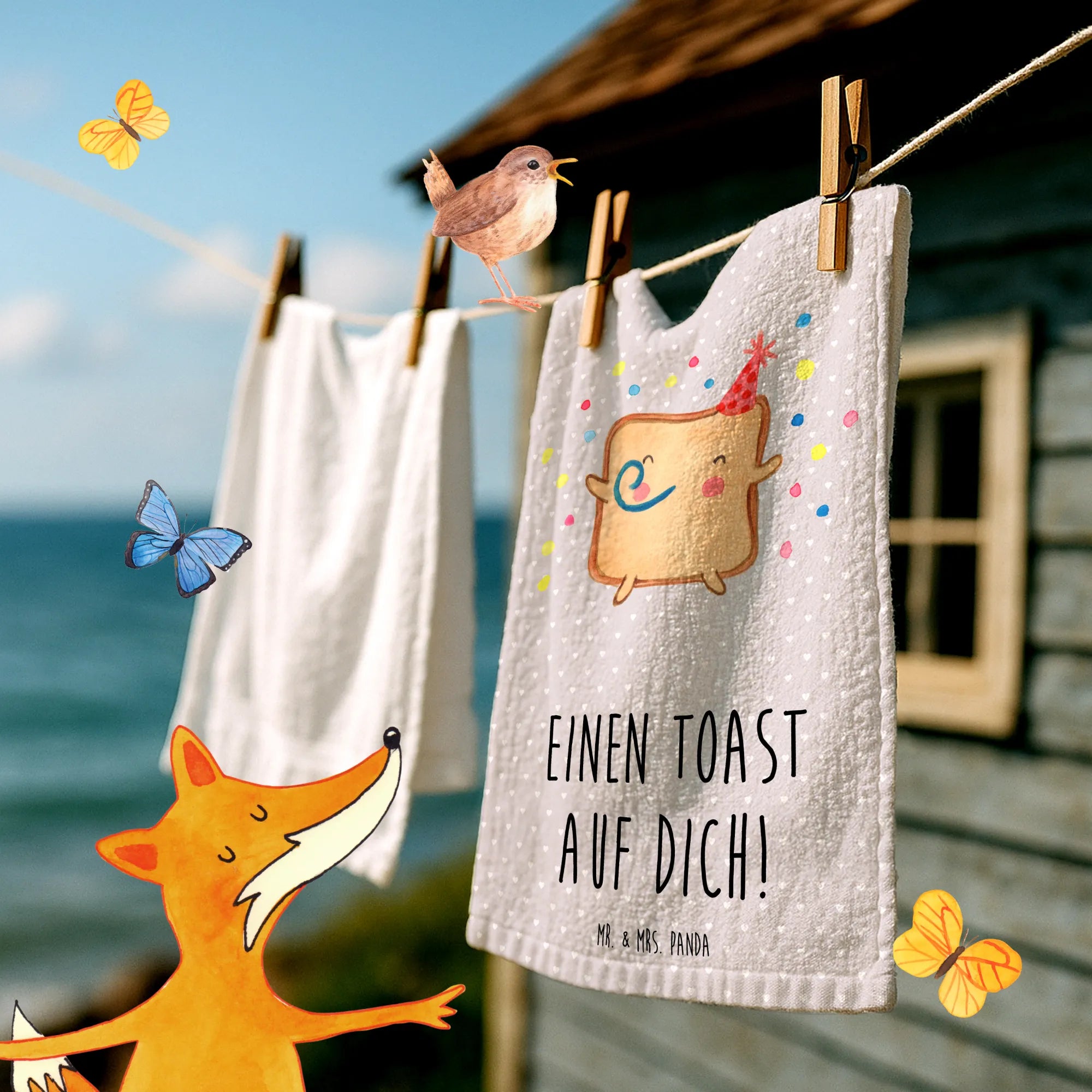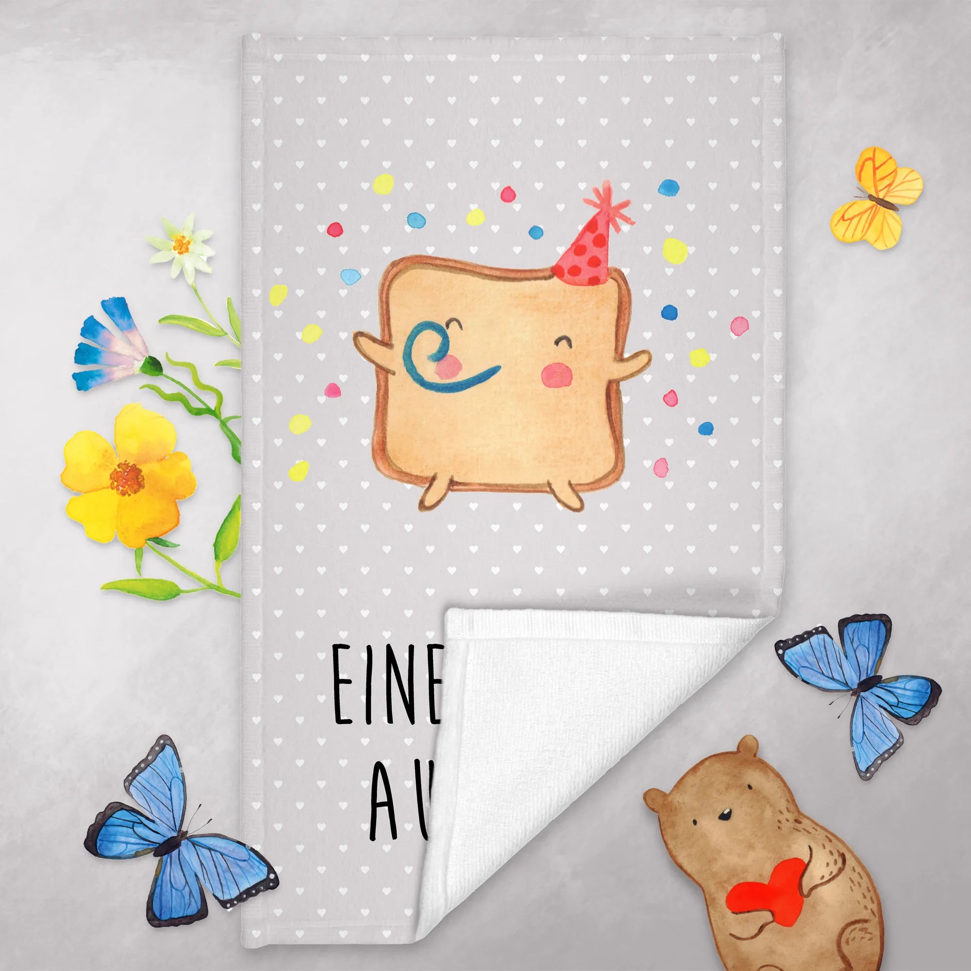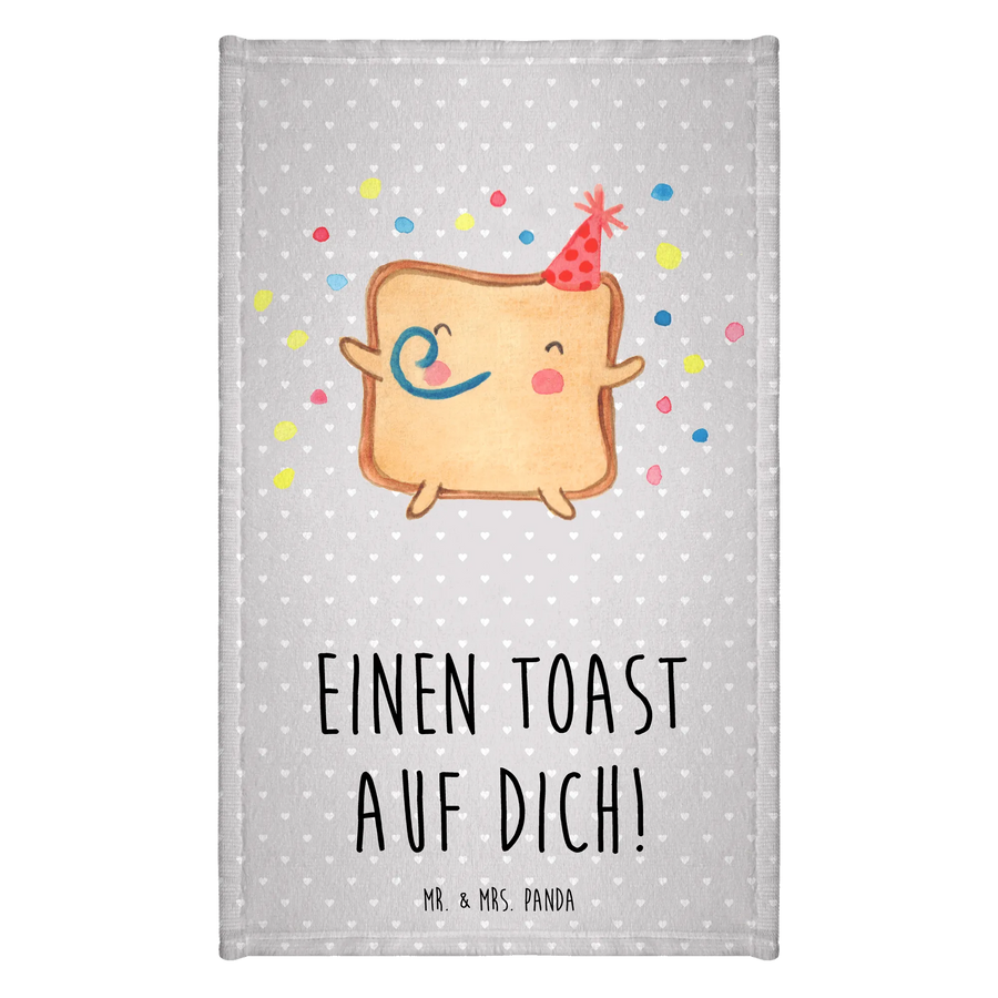 Das Motiv zeigt einen entzückenden Toast mit humanisierten Zügen, der ein lächelndes Gesicht trägt und einen Partyhut auf hat. Rund um den Toast tanzen mehrfarbige Konfetti-Punkte, was die festliche Atmosphäre perfekt unterstreicht. Der Spruch "Einen Toast auf dich!" ergänzt das Design und macht das Handtuch zu einem originellen Liebesgeschenk für jeden Anlass.