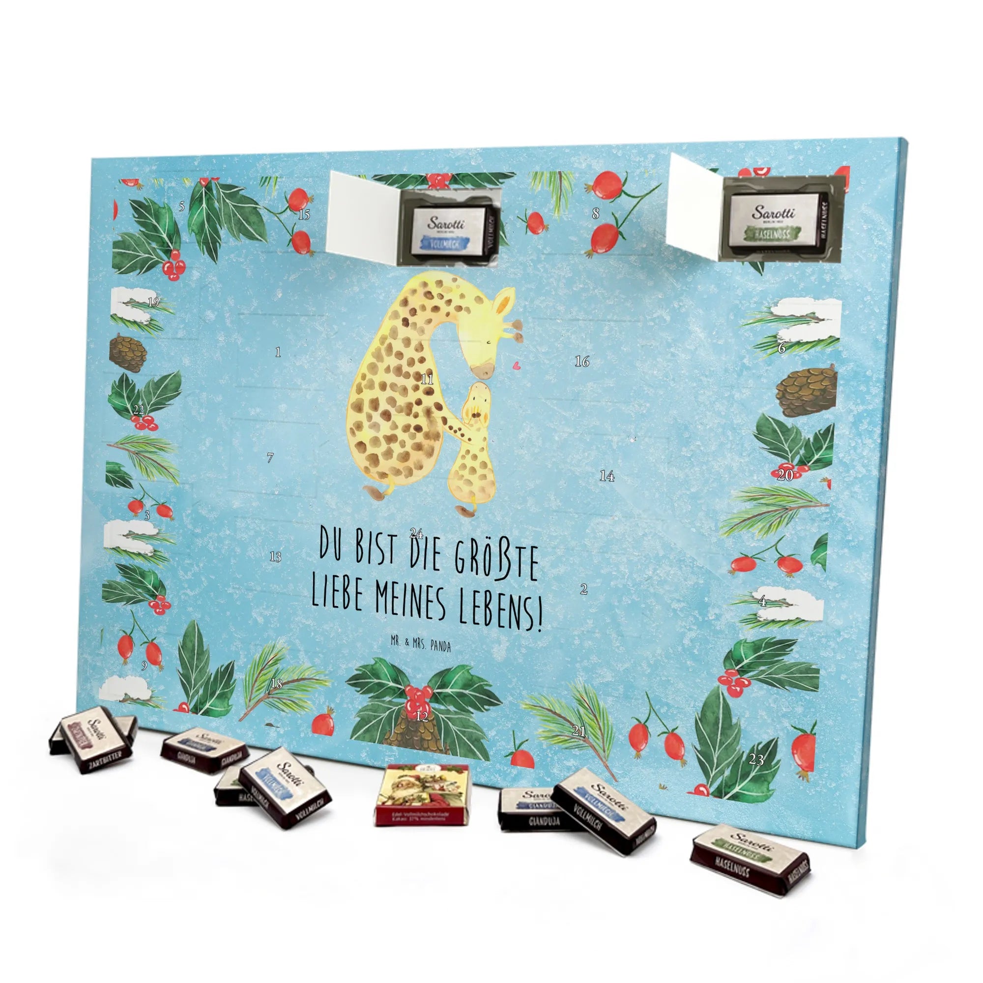 Adventskalender Schokolade von Mr. & Mrs. Panda – eine liebevolle Kombination aus hübschem Design und süßem Inhalt. Der Kalender ist bedruckt mit wunderschönen Motiven & Sprüchen von Mr. & Mrs. Panda und besticht durch brillante Druckqualität mit seidenmatter Oberflächenveredelung. Die Seitenflächen sind ebenfalls bedruckt, wodurch der Kalender rundum ein Hingucker ist. Er ist nicht personalisierbar. Maße: 325 mm x 225 mm x 27 mm. Besonders praktisch: Du kannst ihn sowohl aufgehängt als auch aufgestellt nutzen, je nachdem, wo er bei dir am schönsten wirkt. Gefüllt ist der Kalender mit Ritter Sport Schokowürfeln in verführerischen Sorten – Mousse au Chocolat, Schoko Crisp, Voll-Nuss in Nougatcreme, Karamell Duo, Joghurt und Erdbeer-Joghurt. Wichtiger Hinweis: Es handelt sich um einen Kalender gefüllt mit Ritter Sport Schokolade, nicht um einen Kalender der Marke Ritter Sport. Schenke deinen Liebsten oder dir selbst tägliche Schokoglücksmomente mit diesem charmanten Adventskalender.