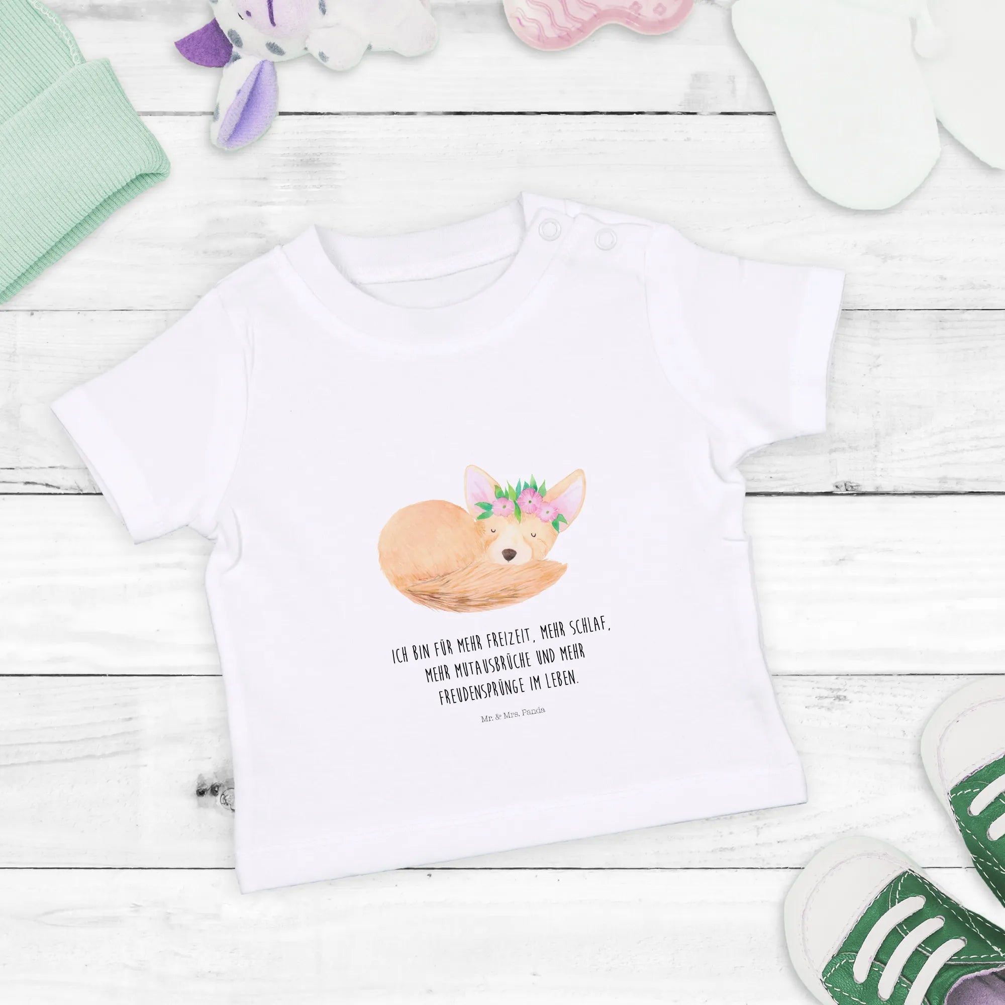 Schenke Freude und Stil mit dem Wüstenfuchs Blumenkranz Baby Shirt von Mr. & Mrs. Panda und bring einen Hauch von Afrika ins Leben Deines Babys!