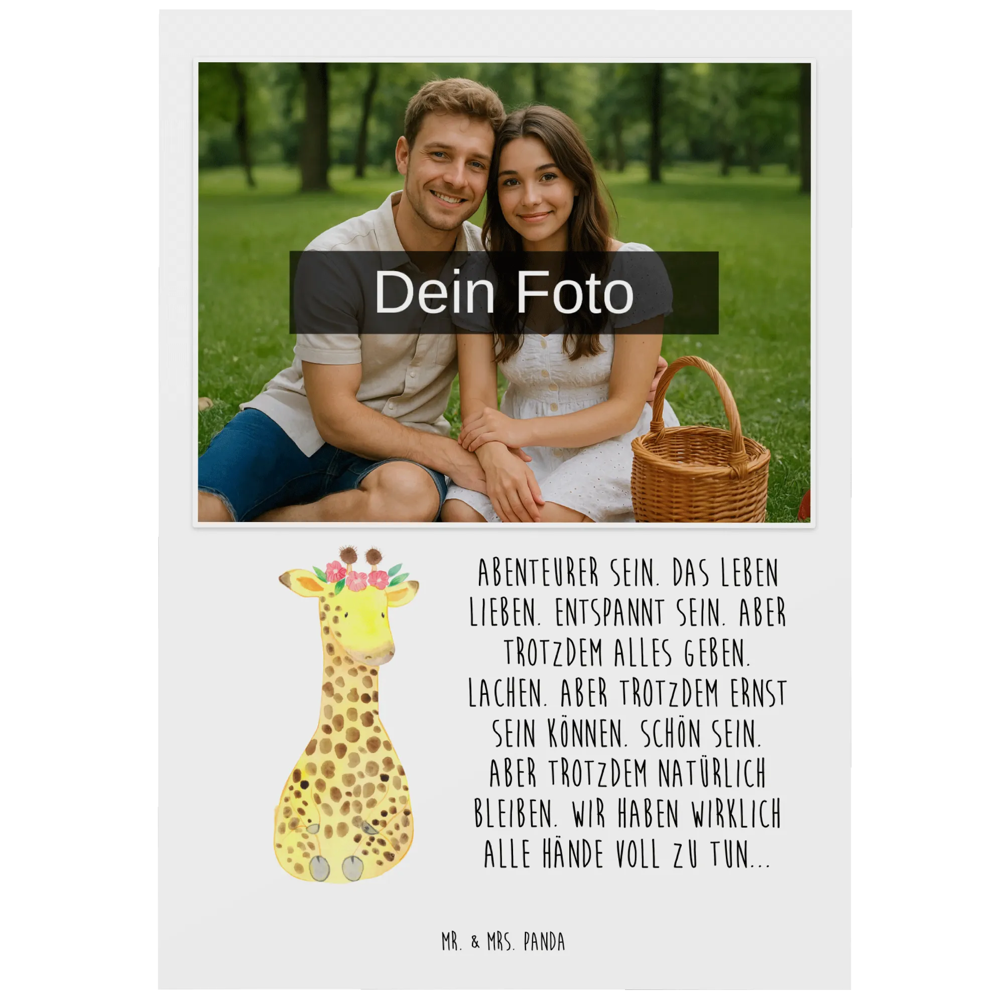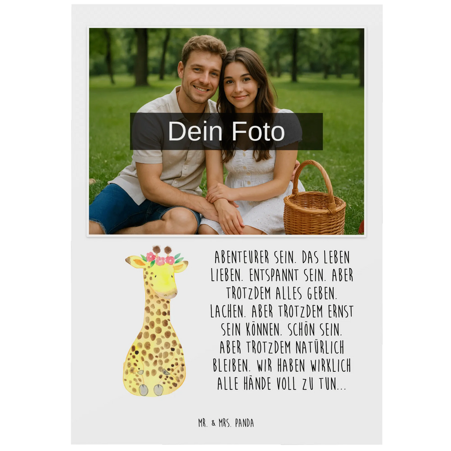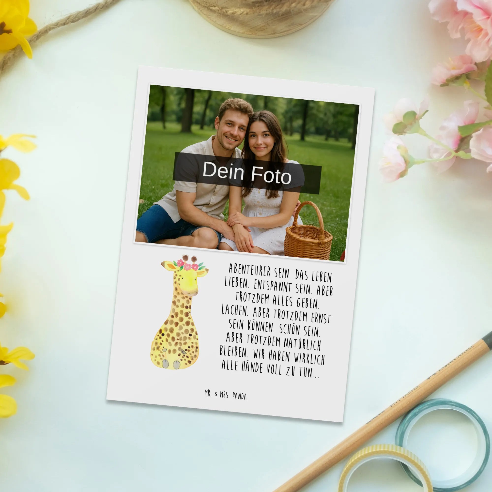 Entdecke die zauberhafte personalisierte Foto Postkarte mit dem Motiv einer Giraffe im Blumenkranz aus der Afrika Kollektion von Mr. & Mrs. Panda! Diese einzigartige Postkarte ist nicht nur ein wunderschönes Geschenk, sondern auch eine wunderbare Möglichkeit, besondere Momente festzuhalten und zu teilen.