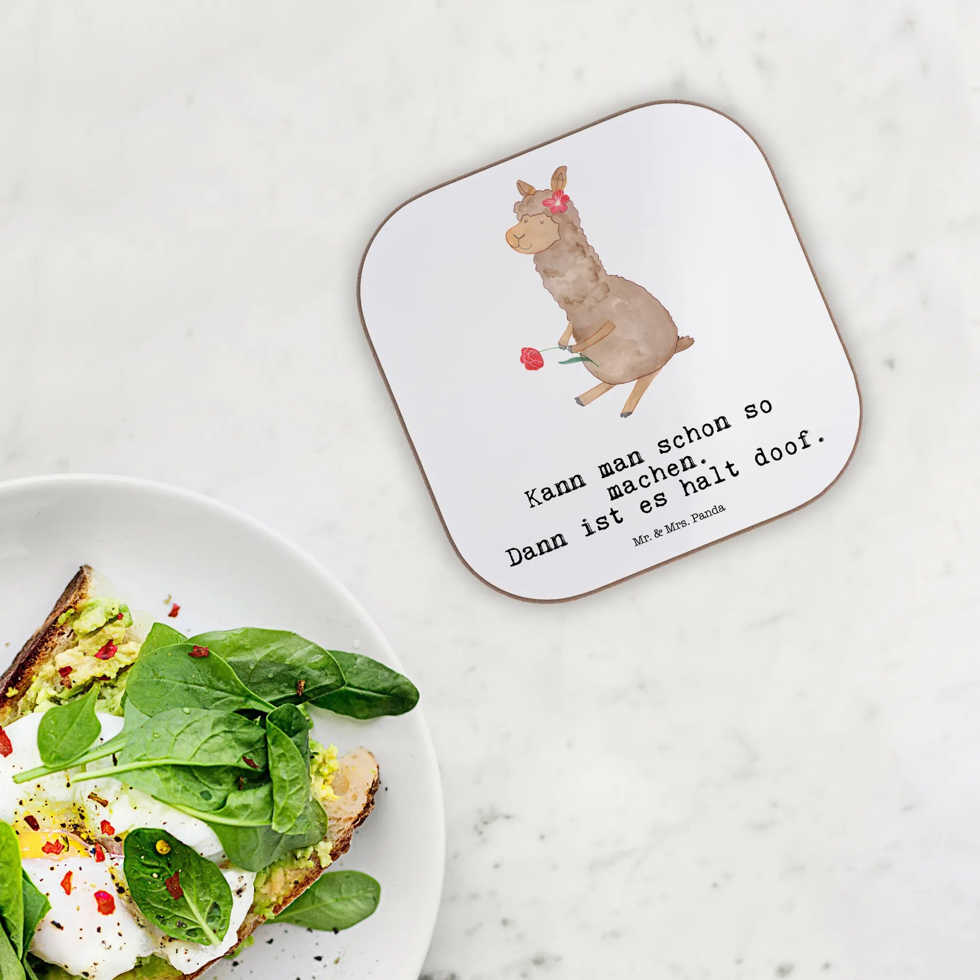 Unser quadratischer Untersetzer vereint niedliches Design und praktischen Nutzen. Das handgezeichnete Alpaka mit Blume im Haar und einer Blume in der Hand zaubert dir ein Lächeln ins Gesicht. Der freche Spruch „Kann man schon so machen. Dann ist es halt doof.“ macht den Untersetzer zu einem kleinen Stimmungsmacher auf deinem Tisch. 🦙🌸