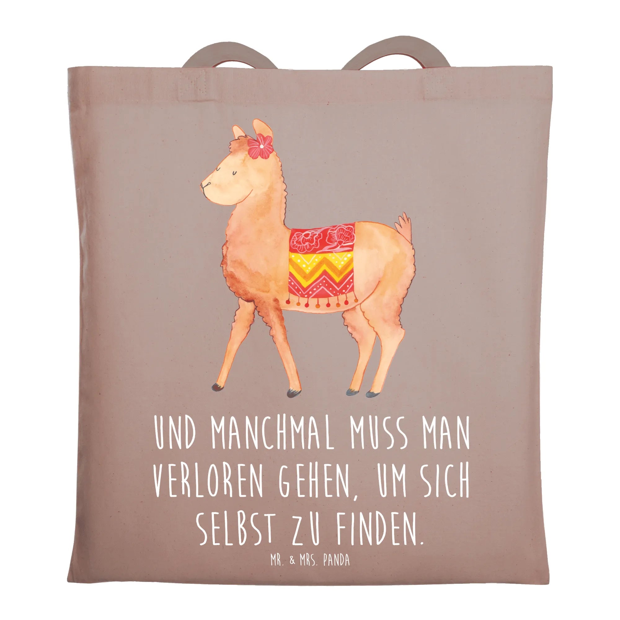 Egal, ob du sie als Einkaufstasche, Shopper oder Strandtasche nutzen möchtest, diese Tragetasche macht immer eine gute Figur. Das niedliche Motiv des stolzen Alpakas, das sich mit einer süßen Schleife herausgeputzt hat, bringt Freude und Charme in dein Leben. Dieser Taschenklassiker ist ideal für Geburtstagsgeschenke, Weihnachtsgeschenke oder einfach nur so, um jemandem eine Freude zu machen. Der Slogan "Und manchmal muss man verloren gehen, um sich selbst zu finden" lädt ein zum Nachdenken und macht diese Tasche zu einem ganz besonderen Accessoire.