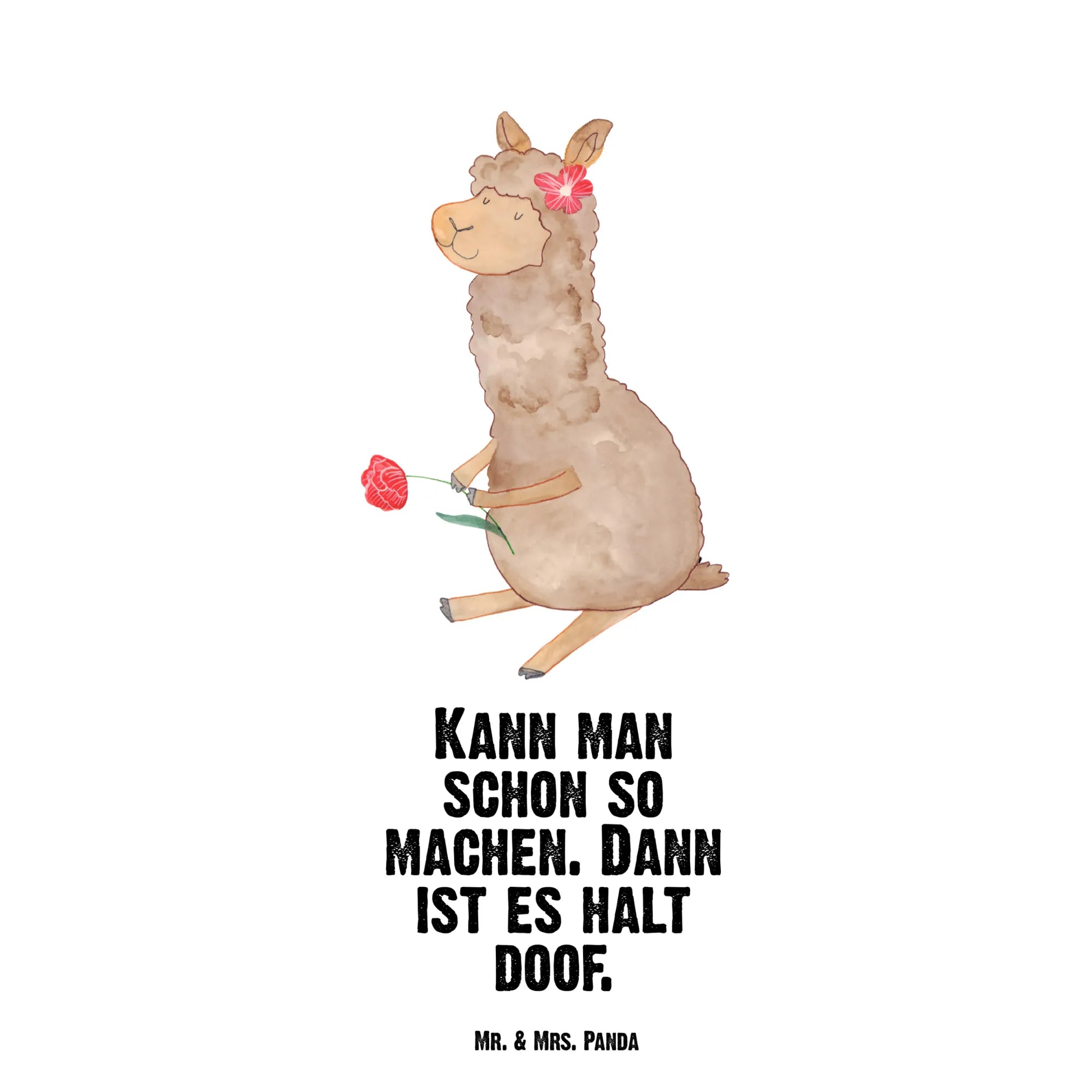 Dieses niedliche Alpaka, das mit einer Blume im Haar und einer weiteren in der Hand posiert, bringt uns dazu, das Leben mit einem Lächeln zu betrachten. Das Alpaka strahlt eine unbeschwerte Freude aus, die uns alle daran erinnert, dass die kleinen Dinge im Leben besondere Momente schaffen. Sein Motto 'Kann man schon so machen. Dann ist es halt doof.' ermutigt uns, das Leben mit Humor zu nehmen, auch wenn die Dinge nicht nach Plan laufen. Lass dich von diesem charmanten Motiv inspirieren, denn es zeigt, dass auch die fluffigsten Wesen uns lehren können, das Leben leicht zu nehmen und auf die schönen Dinge zu achten. Egal, ob als Alpaka Dekor oder als lustiges Geschenk für einen Freund, dieses Motiv wird jedem ein Lächeln ins Gesicht zaubern. Bringe ein Stück Lebensfreude in dein Zuhause oder verschenke es an jemanden, der ein bisschen mehr Freude gebrauchen kann.