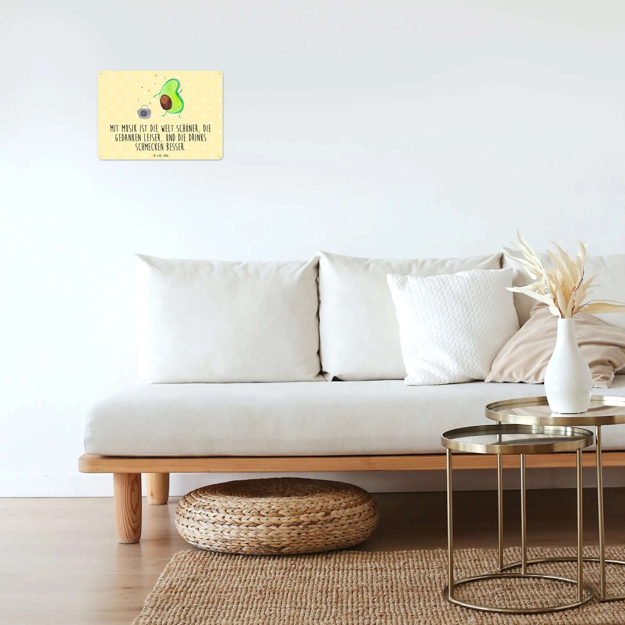 Die niedliche Avocado, die vor einem Ghettoblaster zur Musik tanzt, zaubert jedem ein Lächeln ins Gesicht. Mit dem Spruch "Mit Musik ist die Welt schöner, die Gedanken leiser, und die Drinks schmecken besser", bringt dieses Schild nicht nur Freude, sondern auch eine positive Einstellung in dein Zuhause.