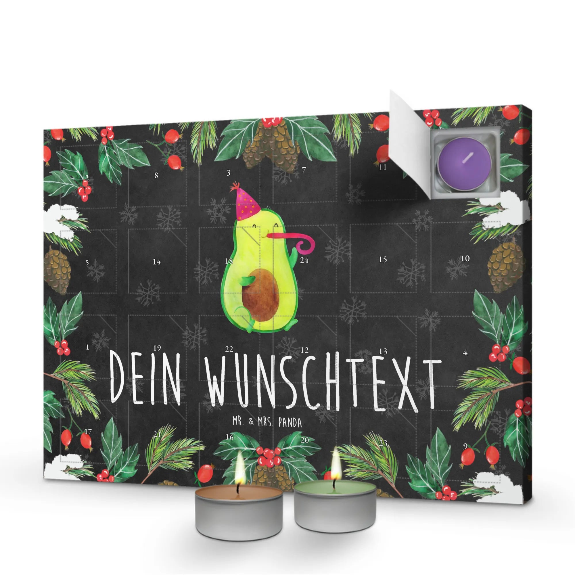 Der personalisierte Duftkerzen Adventskalender "Avocado Partyhupe" von Mr. & Mrs. Panda ist das ideale Geschenk für alle, die das Leben lieben und gerne feiern! Mit seinem verspielten Motiv einer süßen Avocado, die in eine Partypfeife pustet, bringt dieser Kalender gute Laune und ein Lächeln in jedes Zuhause.