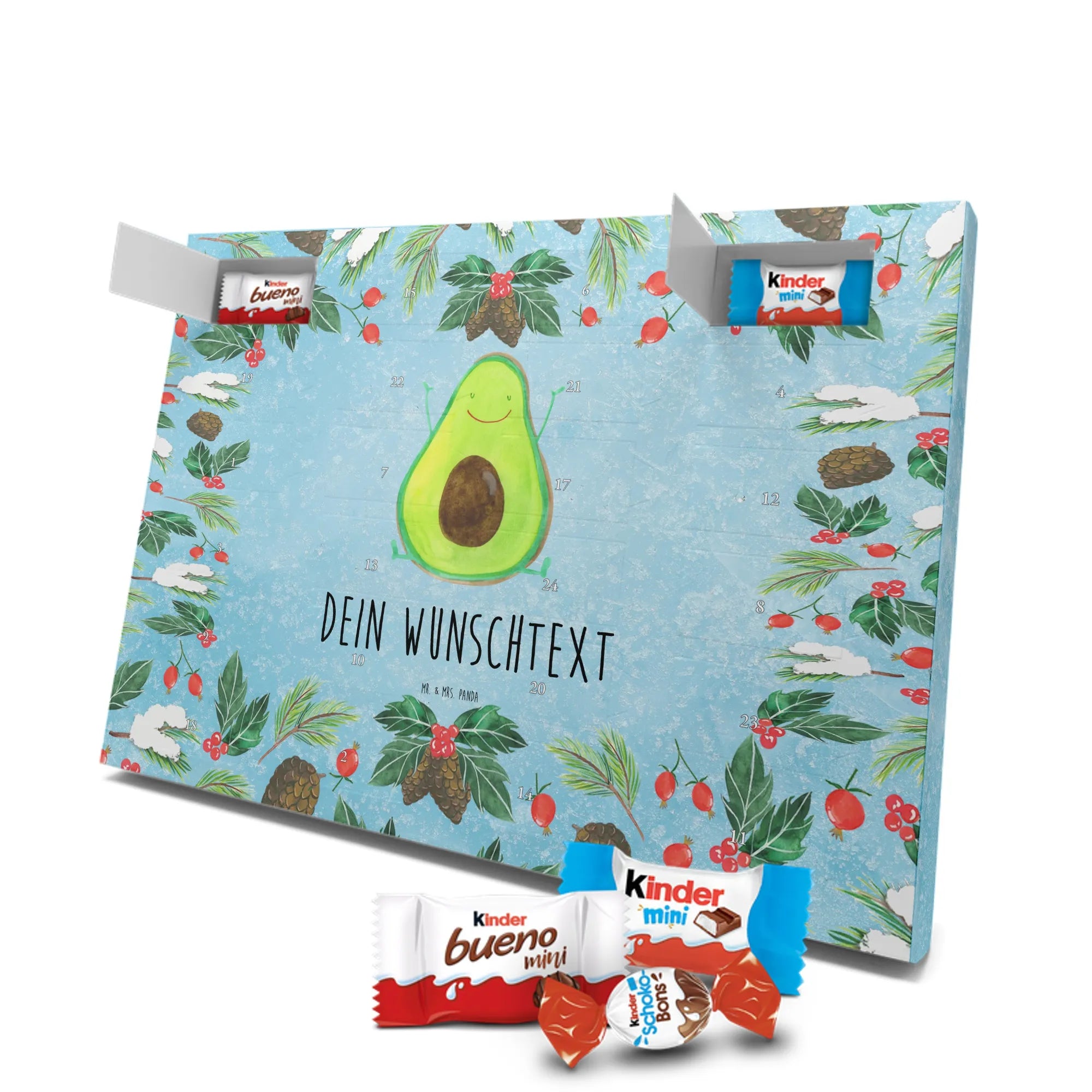 Wunderschöner Personalisierter Schoko Adventskalender von Mr. & Mrs. Panda – perfekt, um die Vorweihnachtszeit besonders persönlich zu gestalten. Unser liebevoll gestalteter Adventskalender ist bedruckt mit wunderschönen Motiven & Sprüchen von Mr. & Mrs. Panda und lässt sich mit deinem Wunschnamen oder Wunschtext personalisieren. Die brillante Druckqualität mit seidenmatter Oberflächenveredelung sorgt für einen edlen Look, und auch die Seitenflächen sind bedruckt, sodass der Kalender von allen Seiten ein Hingucker ist. Du kannst ihn sowohl aufgehängt als auch aufgestellt verwenden, je nachdem, wie es bei dir am besten passt. Maße: 355 mm x 245 mm x 11 mm – kompakt genug, um überall Platz zu finden, und groß genug für eine schöne Überraschung hinter jedem Türchen. Besonderheit: kann aufgehängt oder aufgestellt werden, ideal für Tisch, Regal oder Wand. Gefüllt mit kinder® Schokolade: Adventskalender gefüllt mit kinder® Schokolade; Inhalt: kinder® Schoko-Bons, kinder® Bueno mini und kinder® Schokolade mini. Ein toller persönlicher Adventsteller für Freunde, Familie oder dich selbst – zaubere jeden Tag ein Lächeln ins Gesicht mit süßen Highlights und einem liebevollen Design von Mr. & Mrs. Panda.