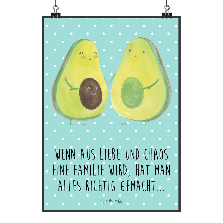 Du bist auf der Suche nach dem perfekten Geschenk für werdende Eltern, frisch gebackene Mamas oder zur Babyshower? Unser wunderschönes Avocado Pärchen Poster von Mr. & Mrs. Panda ist die ideale Lösung! Dieses handgemalte Poster zeigt ein süßes Avocado Pärchen, das sich verliebt anschaut und sich an den Händen hält, dazu der liebevolle Spruch: 'Wenn aus Liebe und Chaos eine Familie wird, hat man alles richtig gemacht...'. Der perfekte Begleiter für jedes Kinderzimmer, Wohnzimmer oder die Küche, um ein bisschen Frische und Freude in die vier Wände zu bringen.
