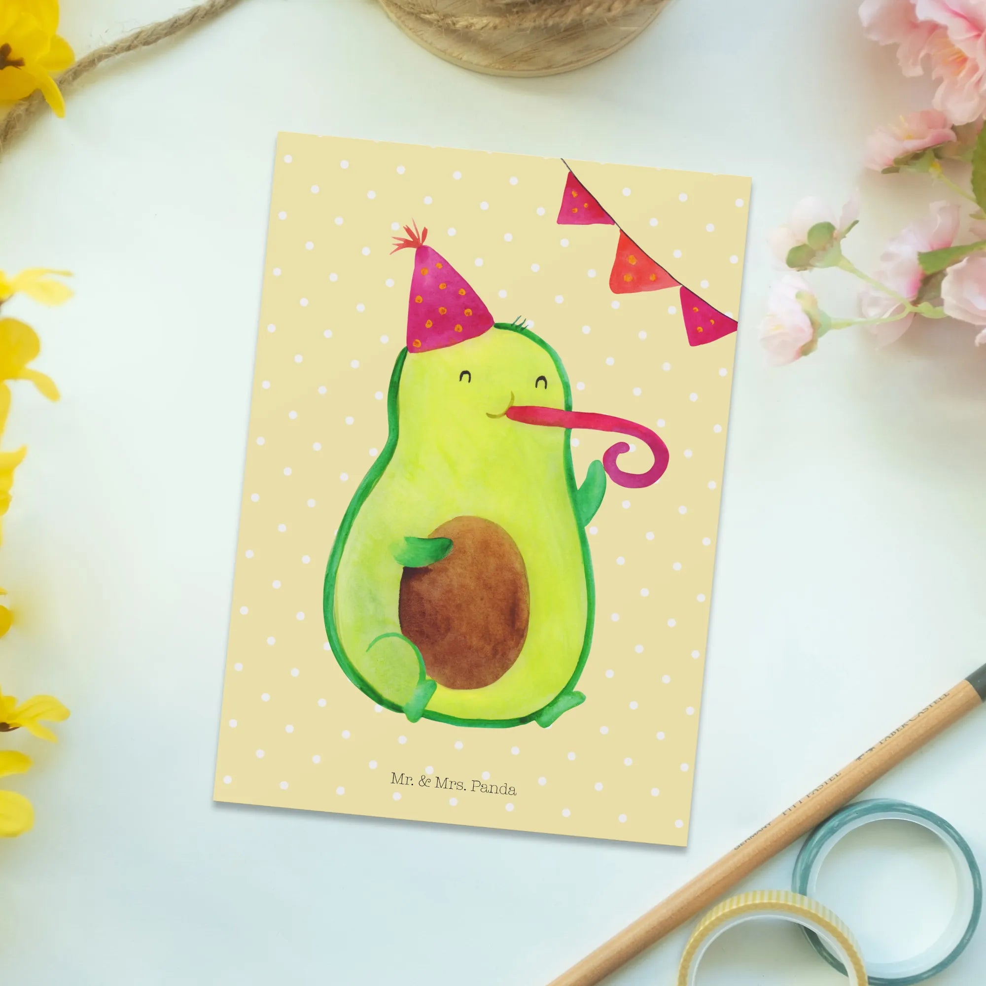 Avocado Birthday Postkarte – die fröhliche Geburtstagskarte aus der Avocado Kollektion von Mr. & Mrs. Panda. Auf der Vorderseite siehst Du eine liebevoll gezeichnete Avocado mit Partyhut, die in eine Partypfeife pustet. Dazu der herzliche Slogan „Happy Birthday!“ – ideal, um sofort gute Laune zu verbreiten. 🎉