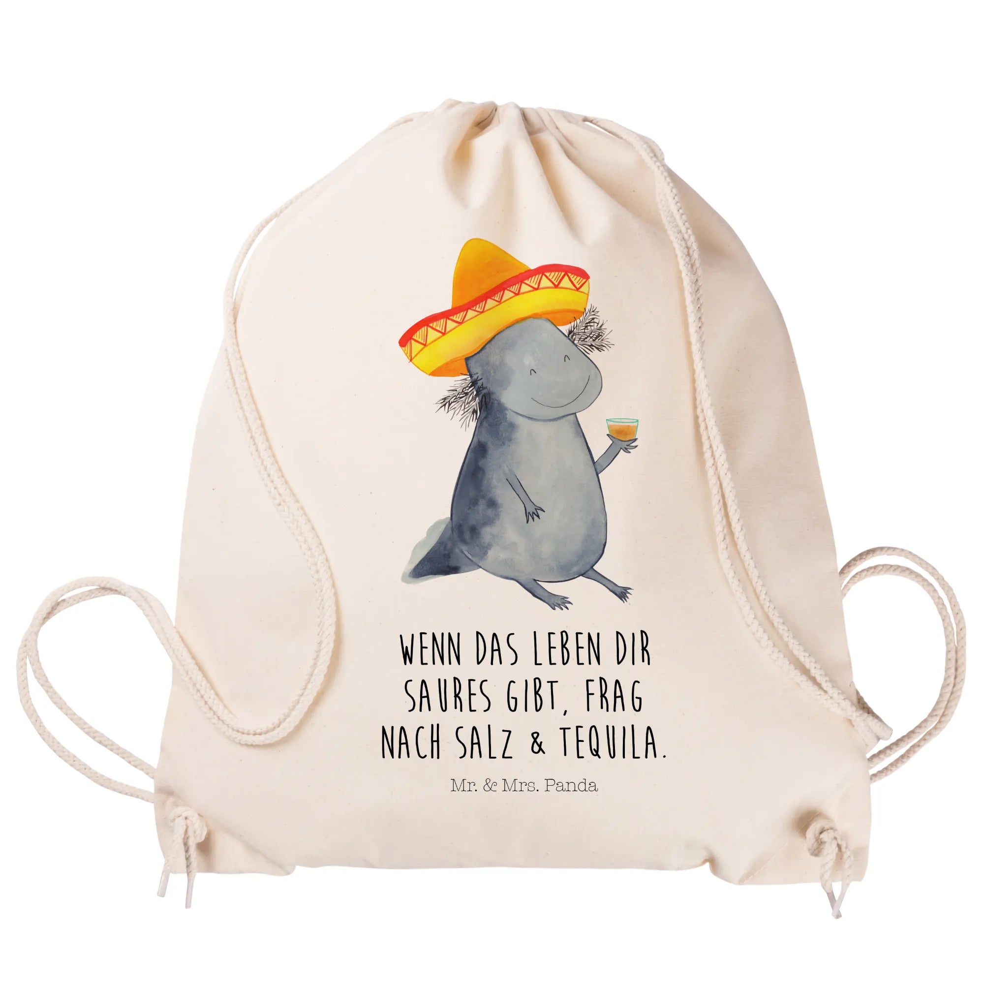 Der Sportbeutel "Axolotl Tequila" von Mr. & Mrs. Panda ist der perfekte Begleiter für kleine Abenteurer und kreative Köpfe. Ob für den Sportunterricht, die Freizeit oder das nächste Festival – dieser einzigartige Turnbeutel überzeugt durch sein fröhliches Design und die liebevolle Botschaft: "Wenn das Leben dir saures gibt, frag nach Salz & Tequila." Der niedliche Axolotl in seinem Sombrero, der stolz ein Tequila Glas hält, zaubert jedem ein Lächeln ins Gesicht und erinnert uns daran, das Leben zu genießen!