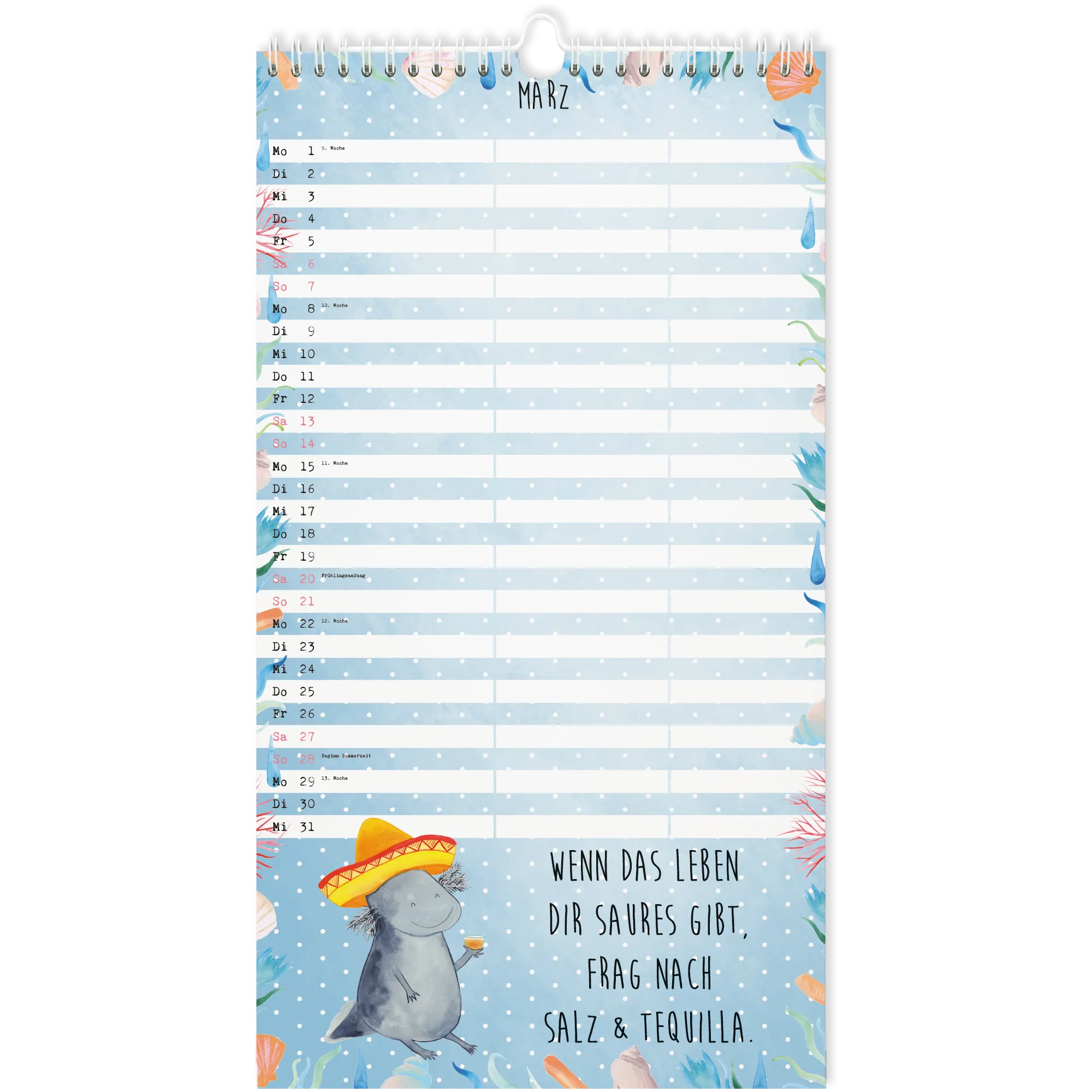Praktisch und liebevoll: Die Laufzeit geht von Januar bis Dezember, sodass ihr das gesamte Jahr im Blick habt. Die klare Aufteilung in drei Spalten erleichtert die Planung von Terminen, Projekten und gemeinsamen Aktivitäten. Jeder Monat ist mit einem eigens gestalteten Axolotl-Motiv versehen, das von Mrs. Panda mit Aquarelltechniken entwickelt wurde.