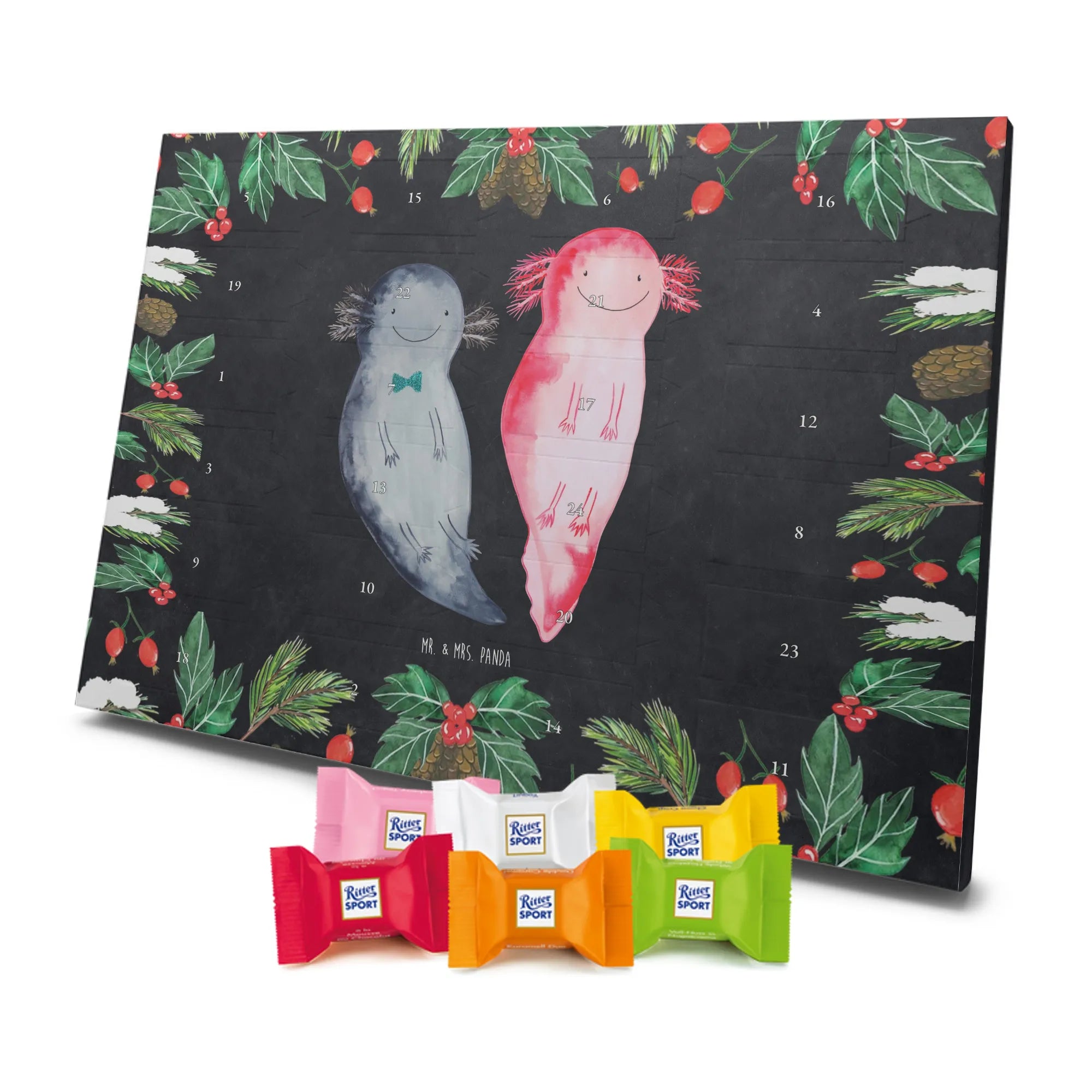 Adventskalender mit Schokolade – so schmeckt Vorfreude! Unser Mr. & Mrs. Panda Adventskalender ist liebevoll gestaltet und bedruckt mit wunderschönen Motiven & Sprüchen, die jeden Tag versüßen. Die brillante Druckqualität mit seidenmatter Oberflächenveredelung sorgt für ein edles Finish, und auch die Seitenflächen sind hübsch bedruckt. Der Kalender ist nicht personalisierbar, dafür aber vielseitig einsetzbar: Maße: 325 mm x 225 mm x 27 mm und die besondere Eigenschaft, dass du ihn aufgehängt oder aufgestellt verwenden kannst, geben dir Flexibilität bei der Dekoration. Gefüllt ist der Kalender mit Ritter Sport Schokowürfeln in beliebten Geschmacksrichtungen wie Mousse au Chocolat, Schoko Crisp, Voll-Nuss in Nougatcreme, Karamell Duo, Joghurt und Erdbeer-Joghurt. Wichtig: Es handelt sich um einen Kalender gefüllt mit Ritter Sport Schokolade, nicht um einen Kalender der Marke Ritter Sport. Ideal als Geschenk oder als Adventsdeko für dein Zuhause – kleine Schokofreuden warten hinter jedem Türchen.