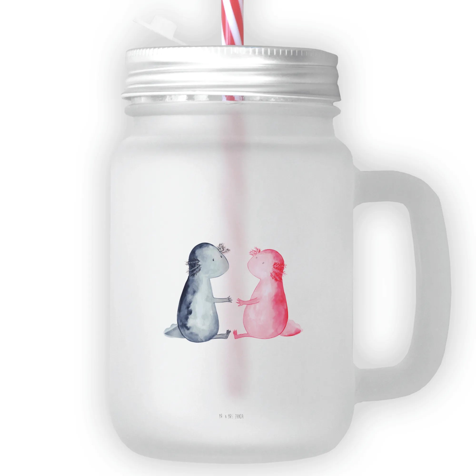 Das Trinkglas Mason Jar mit dem süßen Axolotl Motiv "Liebe" von Mr. & Mrs. Panda ist das perfekte Geschenk für alle, die das Besondere lieben. Ein hübsches Henkelglas für erfrischende Sommergetränke, wie Cocktails, Eistees oder selbstgemachte Limonade.
