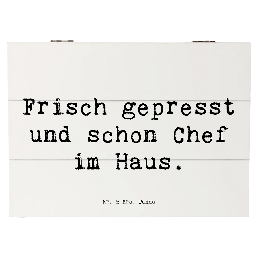 Der charmante Spruch "Frisch gepresst und schon Chef im Haus" wird garantiert ein Lächeln bei jedem Beschenkten hervorrufen. Die besondere Stabilität und die Einschlagscharniere ermöglichen ein einfaches Öffnen und Schließen der Kiste, damit Du die Erinnerungen jederzeit leicht erreichen kannst.