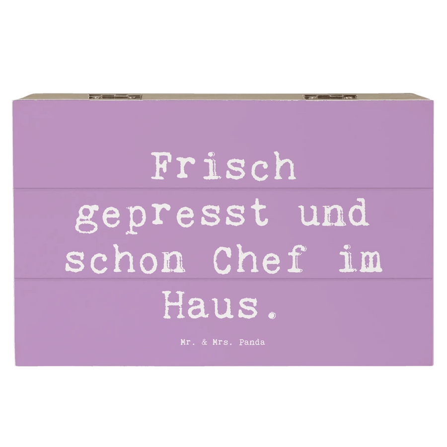 Der charmante Spruch "Frisch gepresst und schon Chef im Haus" wird garantiert ein Lächeln bei jedem Beschenkten hervorrufen. Die besondere Stabilität und die Einschlagscharniere ermöglichen ein einfaches Öffnen und Schließen der Kiste, damit Du die Erinnerungen jederzeit leicht erreichen kannst.