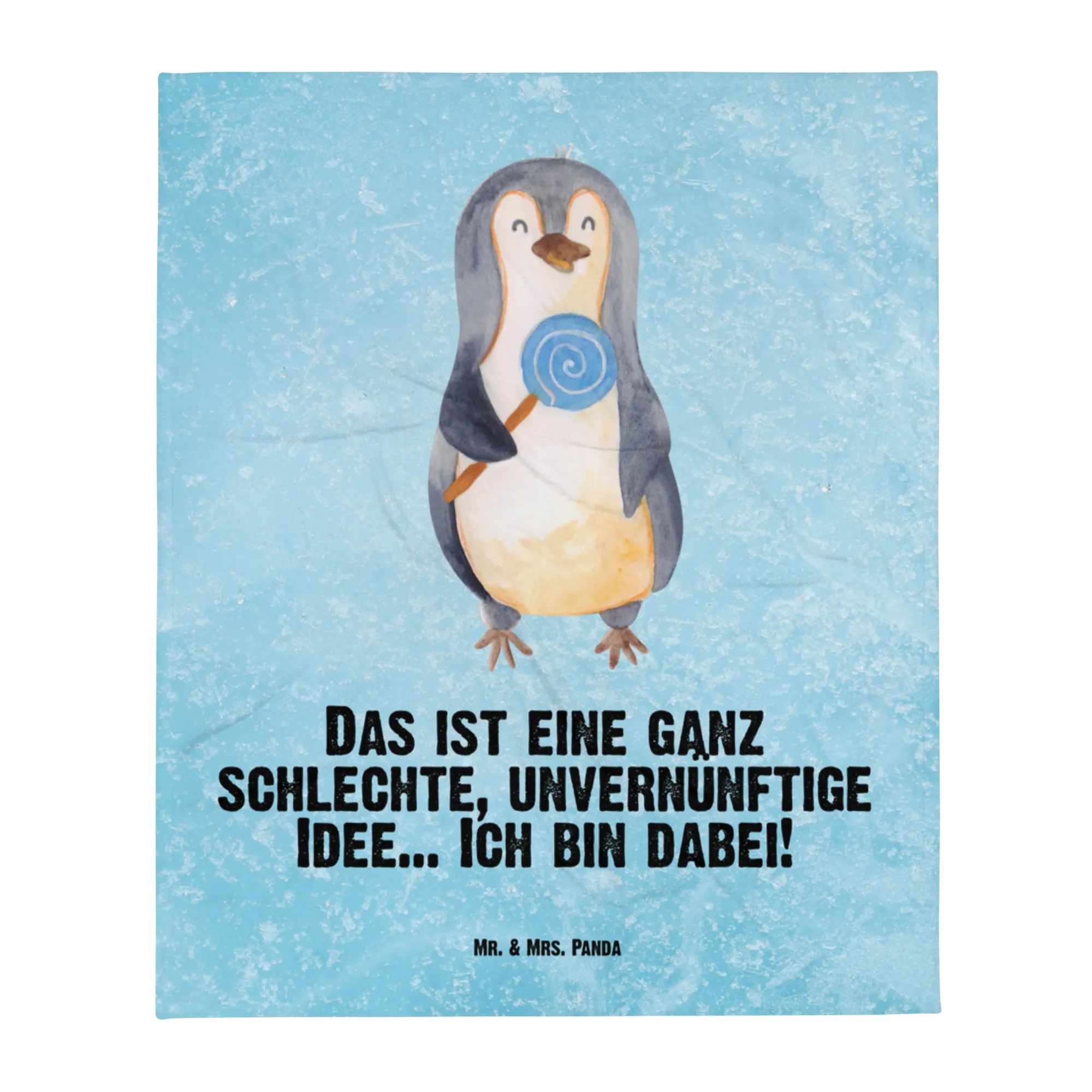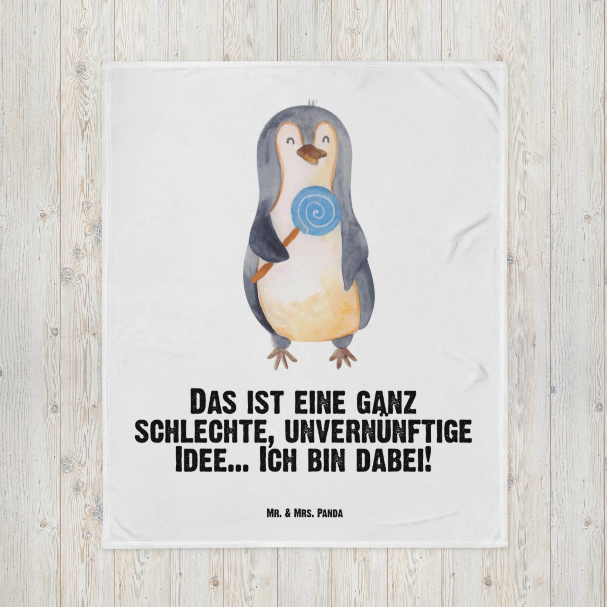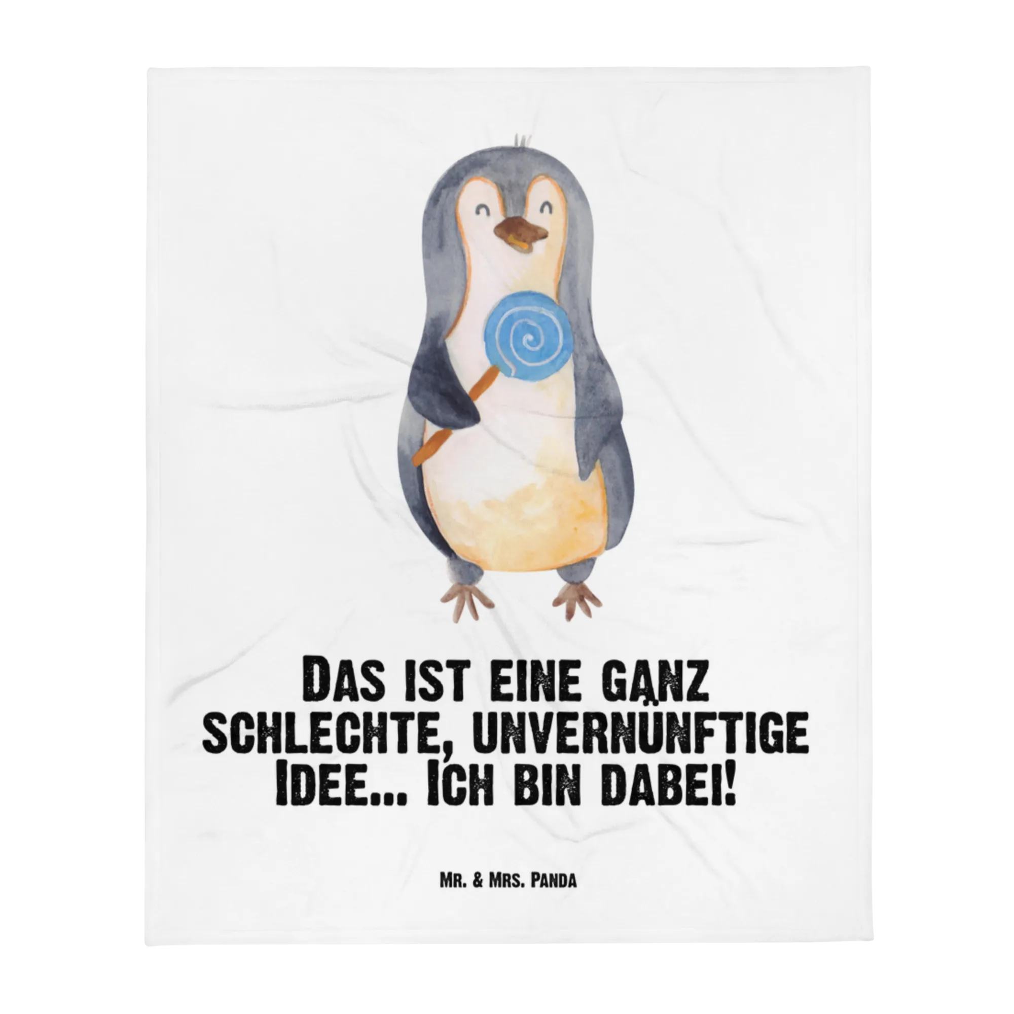 Diese hochwertige Kuscheldecke besticht durch ihr einzigartiges Design: Ein niedlicher kleiner Pinguin, der stolz seinen Lieblingslutscher hält, begleitet von dem frechen Spruch: 'Das ist eine ganz schlechte, unvernünftige Idee... Ich bin dabei!'. Dieser Slogan ist wie gemacht für kleine Rebellen, Ganoven und Rabauken, die mit ihrem Lächeln jedes Herz im Sturm erobern. Es ist das ideale Geschenk zur Geburt oder ein herzliches Babygeschenk für die Taufe.
