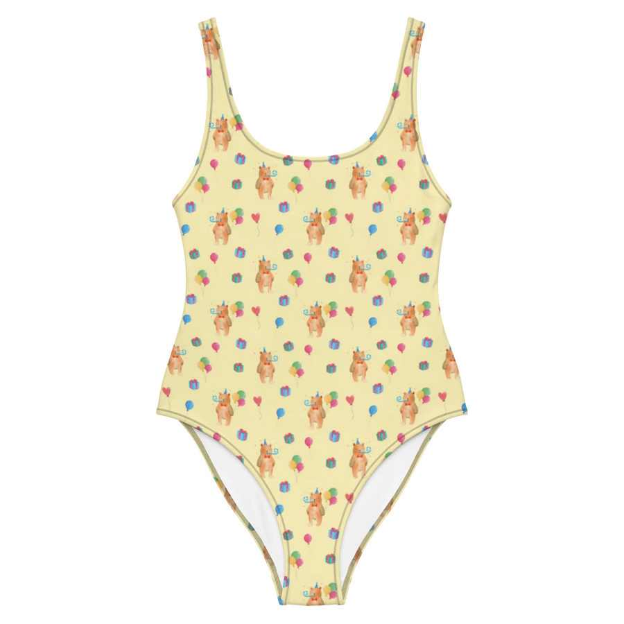 In einem fröhlichen Gelb, das zum Lächeln einlädt, überzeugt der Badeanzug durch sein süßes Design, das mit dem fröhlichen Birthday Bär verziert ist. Er trägt bunte Luftballons und hat ein strahlendes Lächeln, das garantiert gute Laune verbreitet!