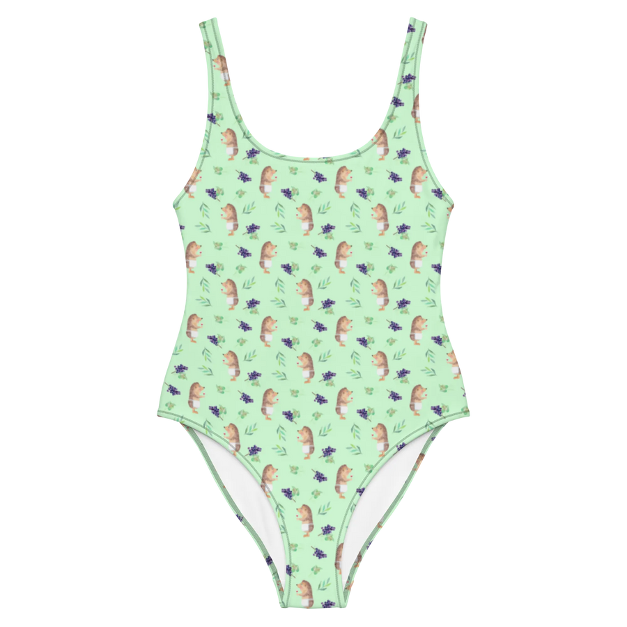 Das süße Design zeigt einen niedlichen Igel, der mit einem Rotweinglas anstößt – eine liebevolle Hommage an den Genuss und an die kleinen Freuden des Lebens. Die Farben sind lebendig und ansprechend, wodurch dieser Badeanzug nicht nur ein Blickfang am Wasser ist, sondern auch ein Gesprächsstarter.