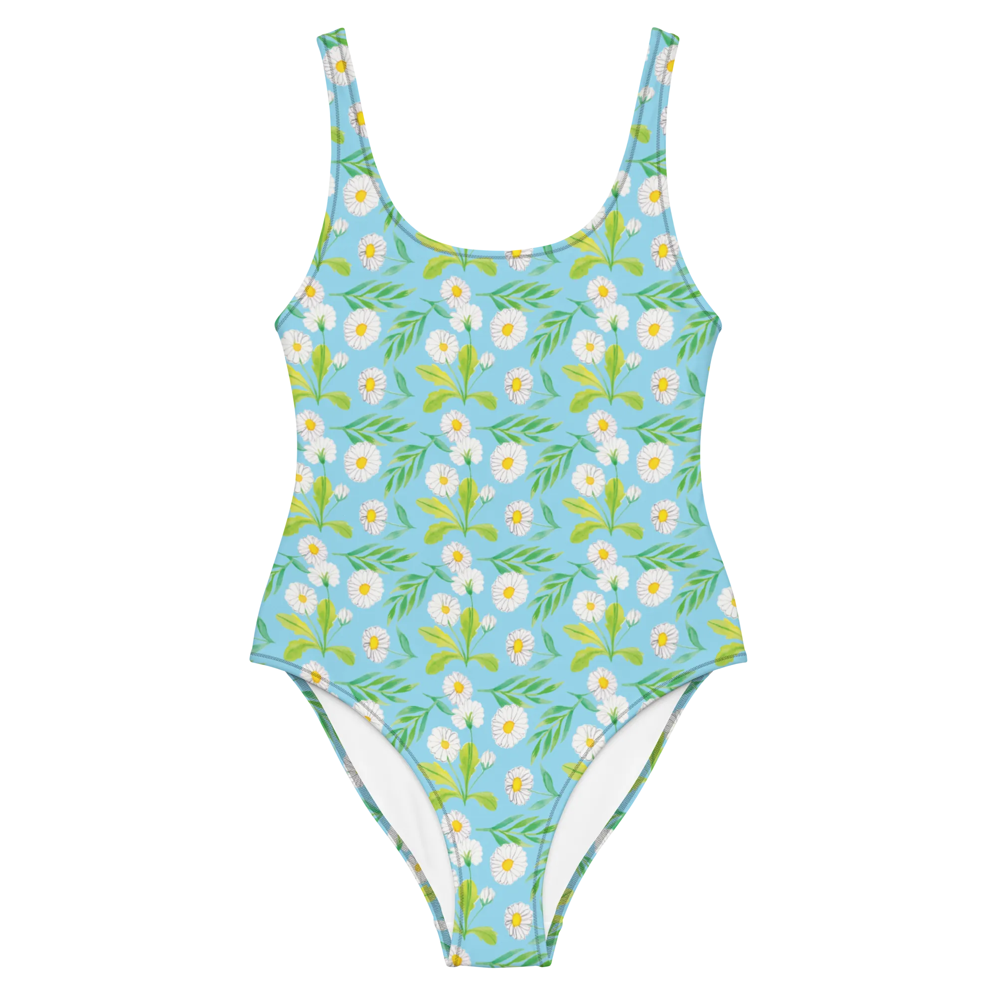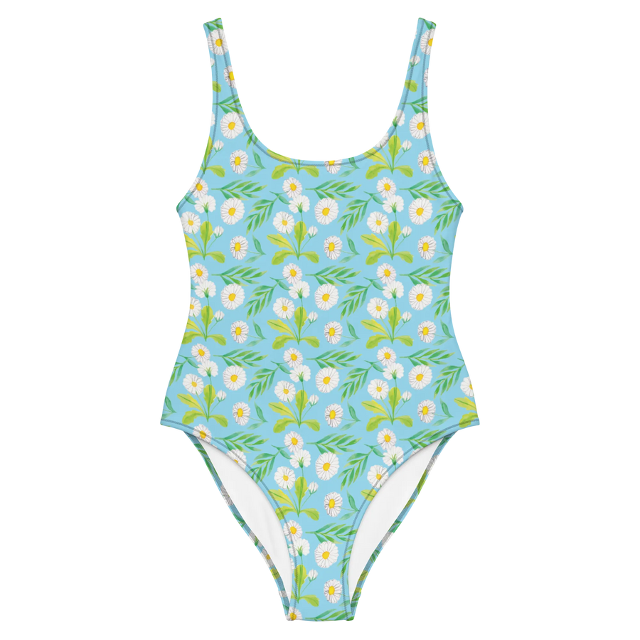 Mit stilisierten Gänseblümchen, die auf zarten weißen Blütenblättern erstrahlen, bringt dieser Badeanzug die Magie einer blühenden Wiese direkt in deinen Kleiderschrank. Die Kombination aus lebendigen Farben und feinen Mustern sorgt dafür, dass du in jeder Situation stilvoll aussiehst.
