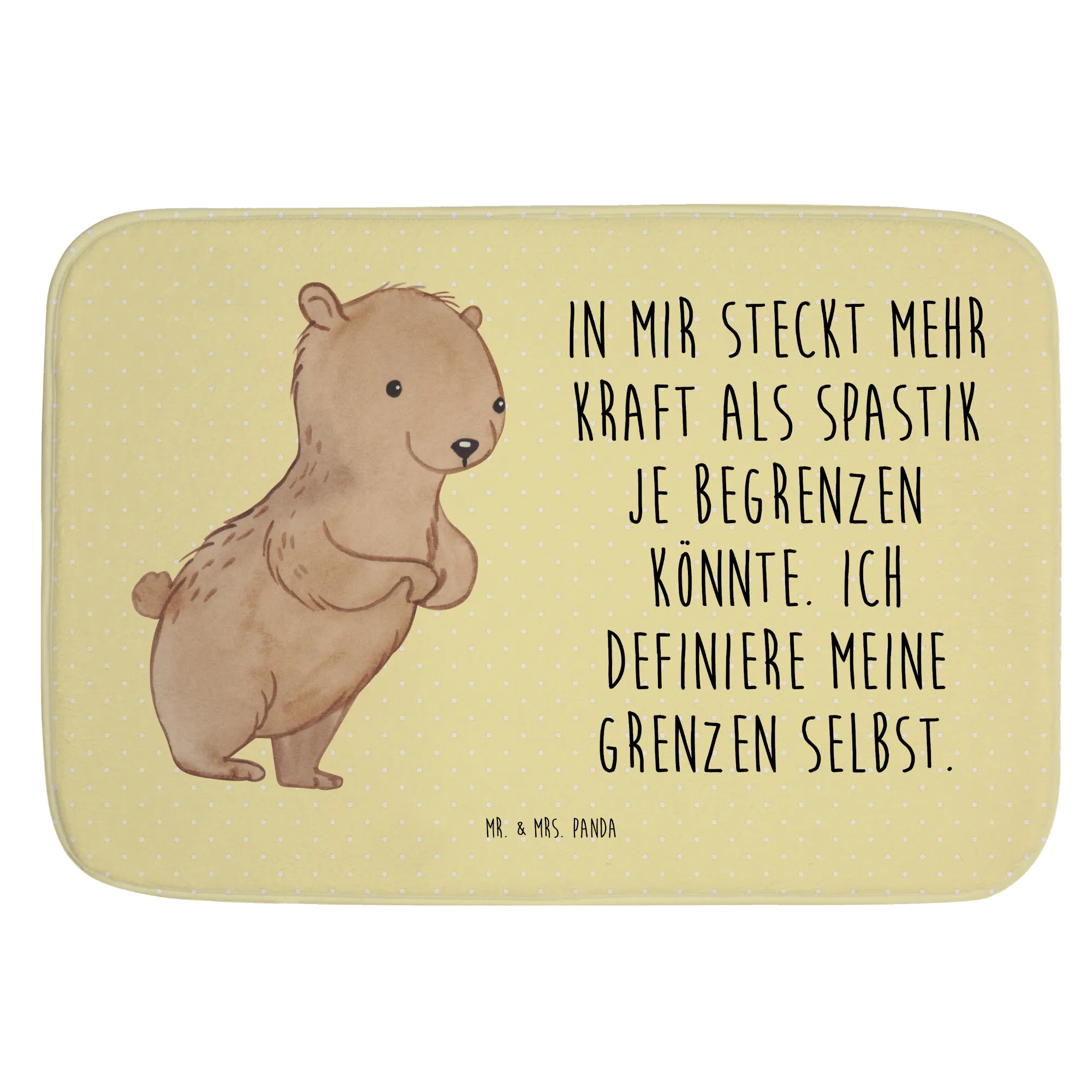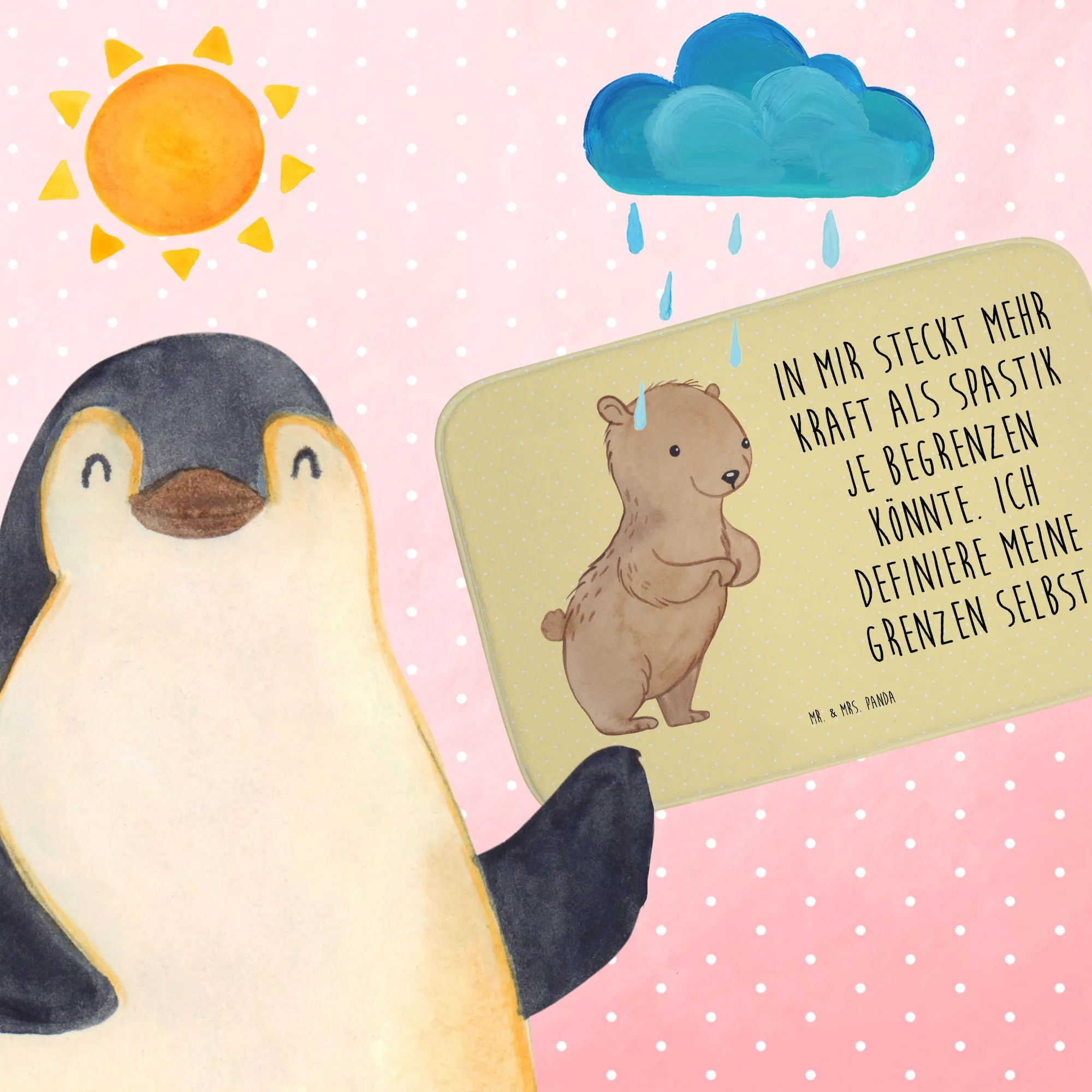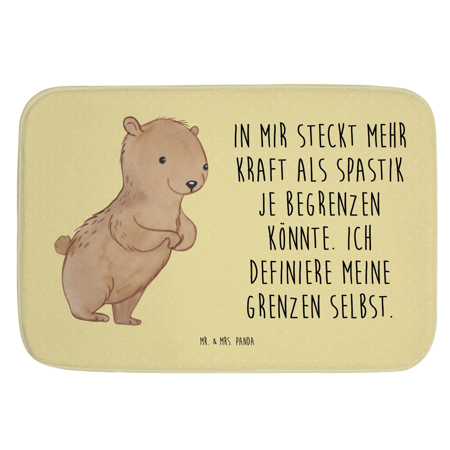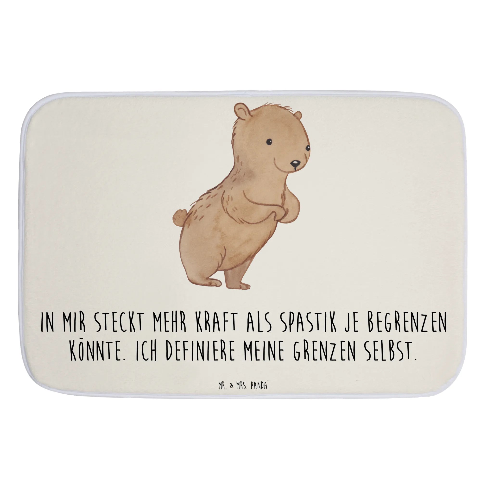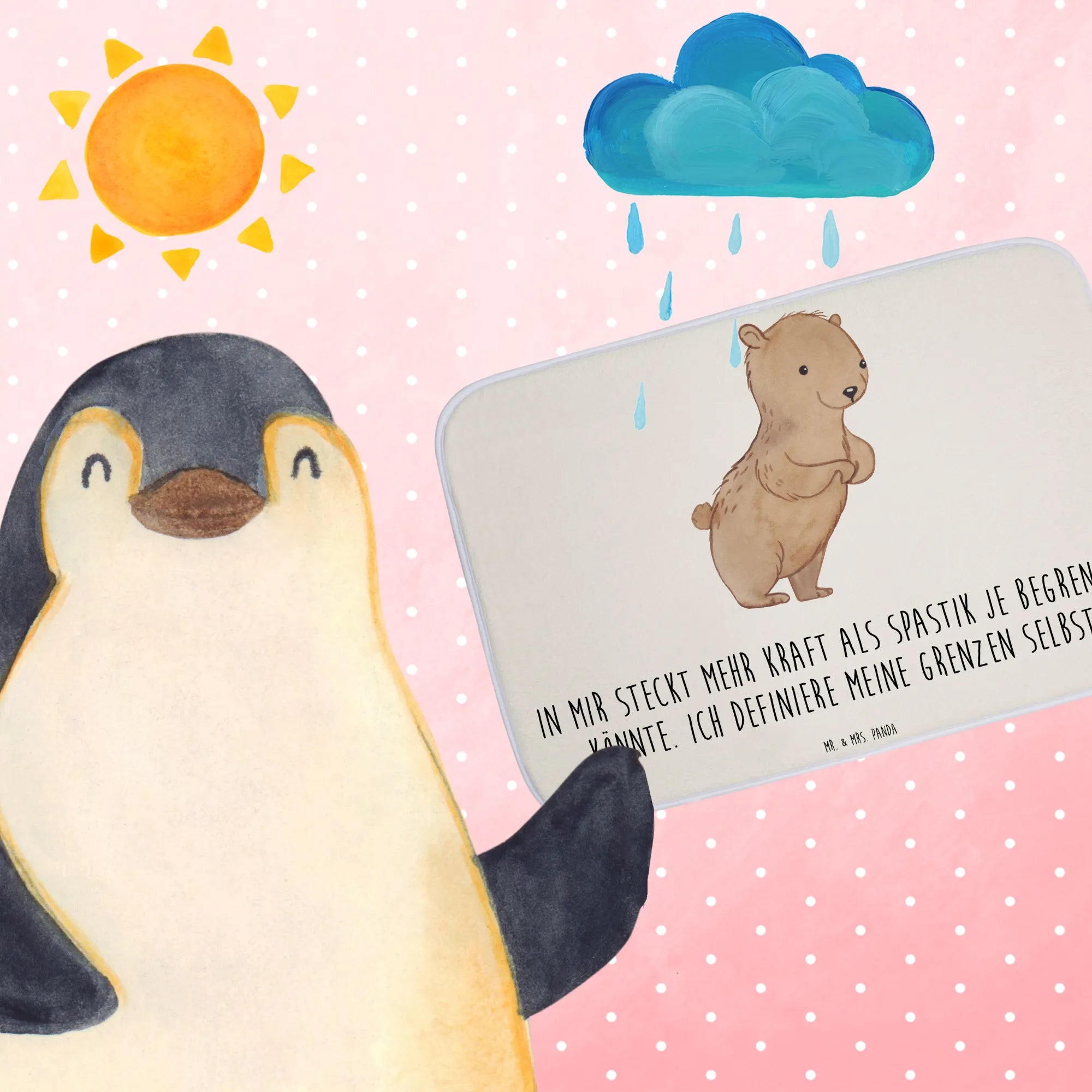 Dieser Badvorleger, mit dem liebevoll gestalteten Bärenmotiv, zeigt einen Bären mit gekrümmten Pfoten – ein Symbol für den Alltag vieler, die unter Spastik zu leiden haben. Doch der Slogan "In mir steckt mehr Kraft als Spastik je begrenzen könnte. Ich definiere meine Grenzen selbst." unterstreicht die innere Stärke, die diese Menschen besitzen.