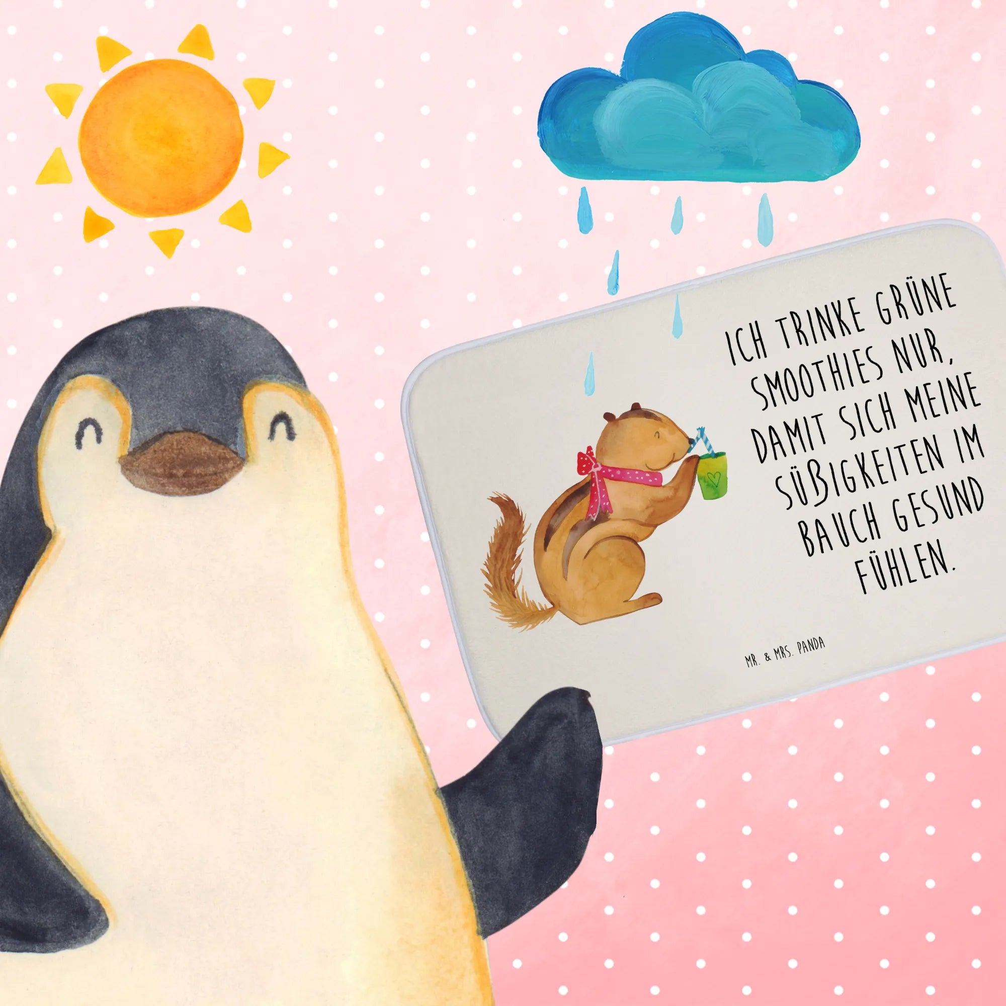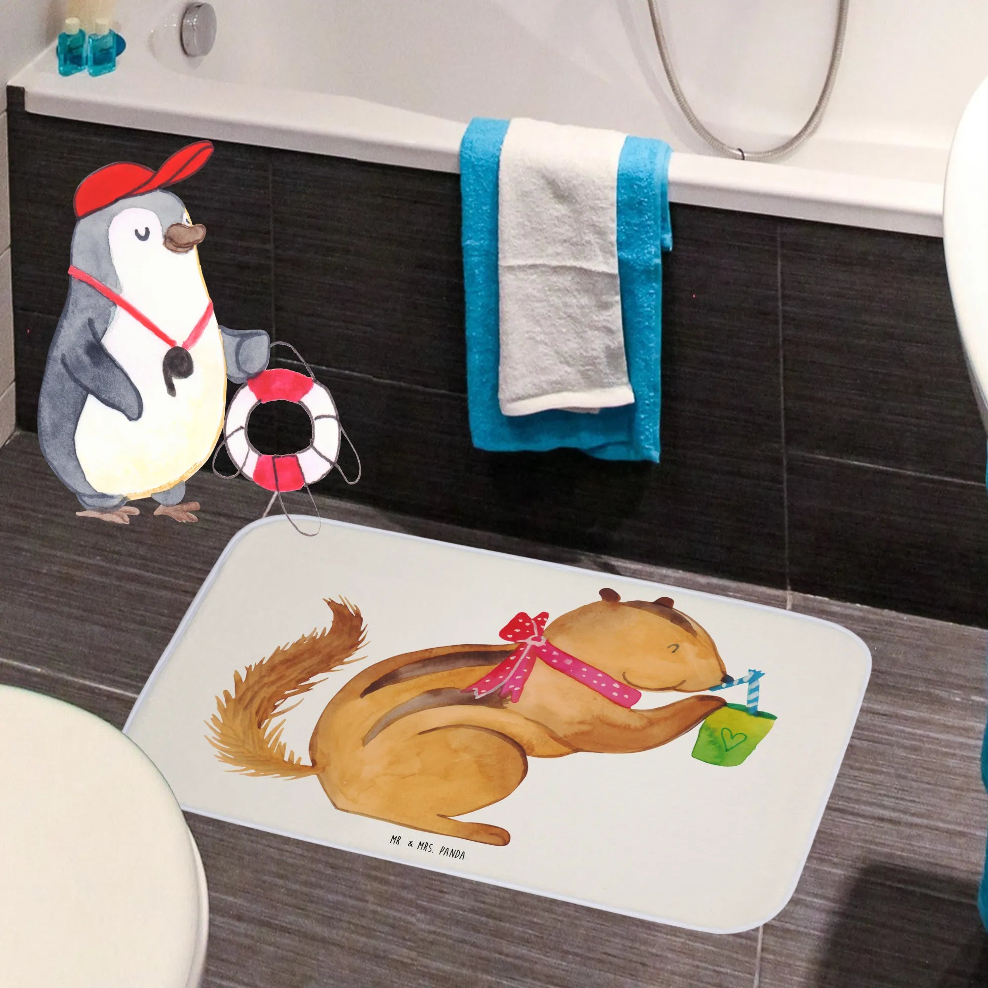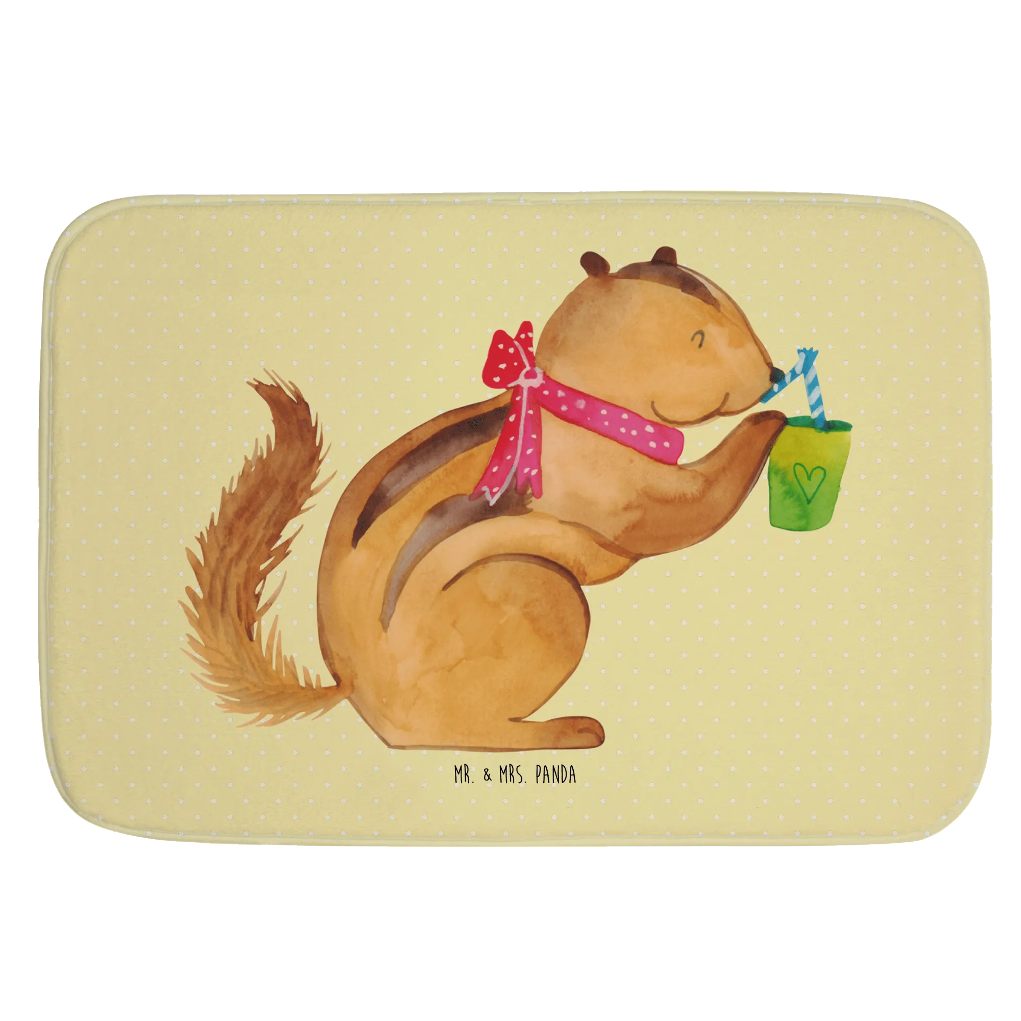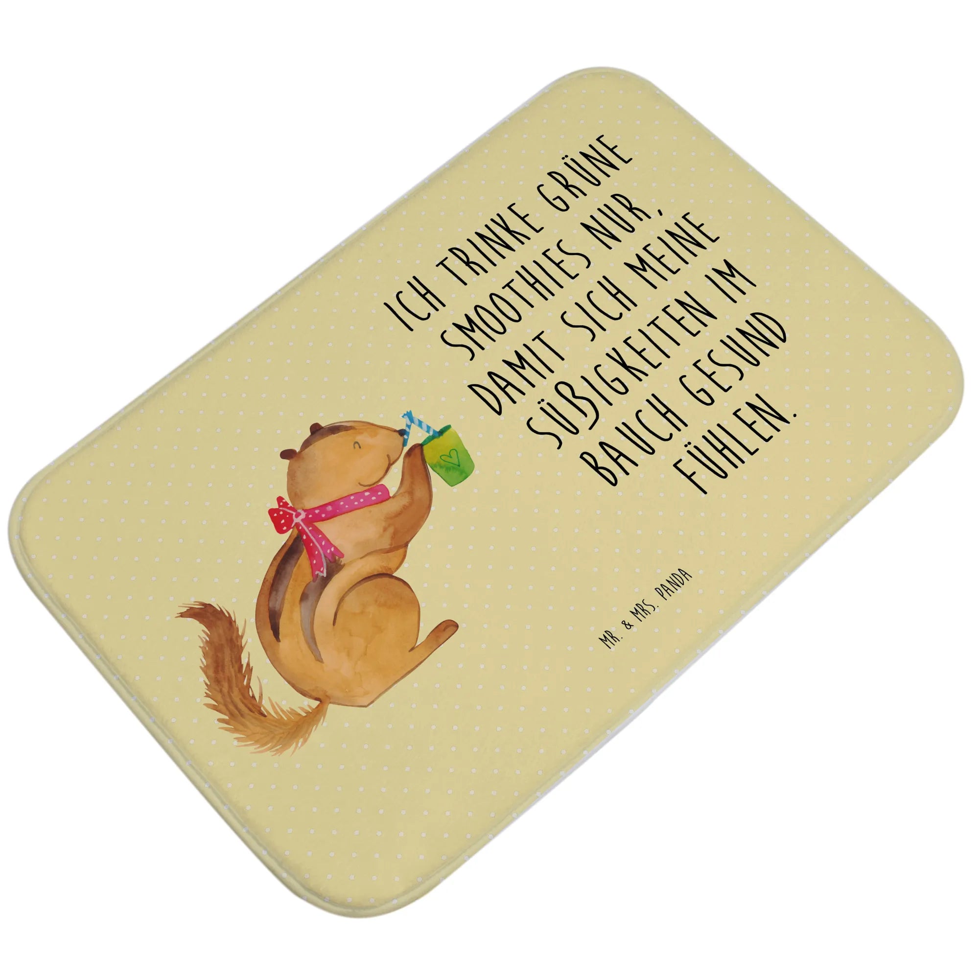 Der Badvorleger Eichhörnchen Smoothie aus der Small World Kollektion von Mr. & Mrs. Panda ist das perfekte Accessoire für dein Badezimmer! Er bringt nicht nur Farbe und gute Laune, sondern sorgt auch für Sicherheit dank seiner Anti-Rutsch-Gummibeschichtung. Das liebevolle Design mit dem süßen Eichhörnchen, das genüsslich einen Smoothie schlürft, verleiht deinem Badezimmer eine fröhliche Atmosphäre.