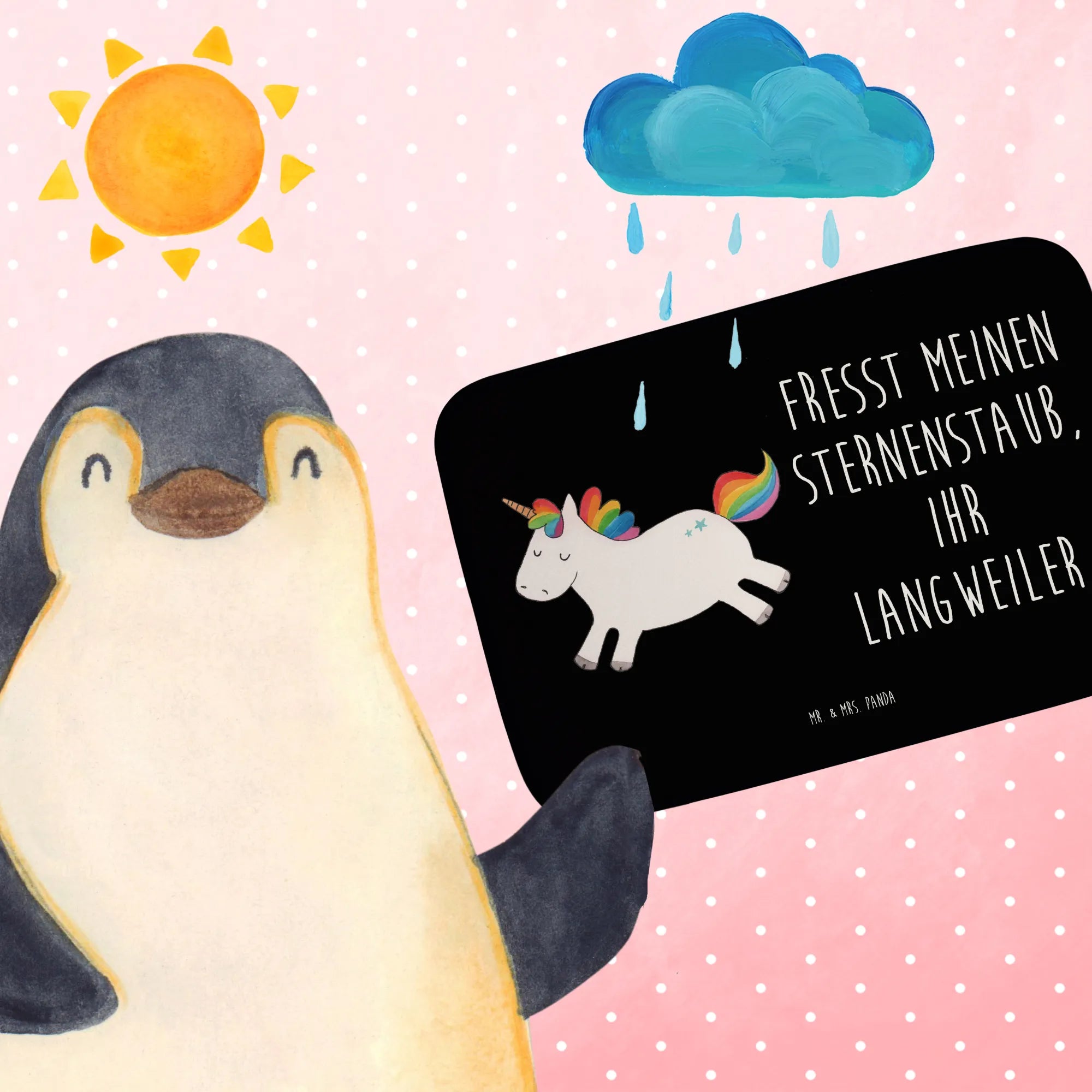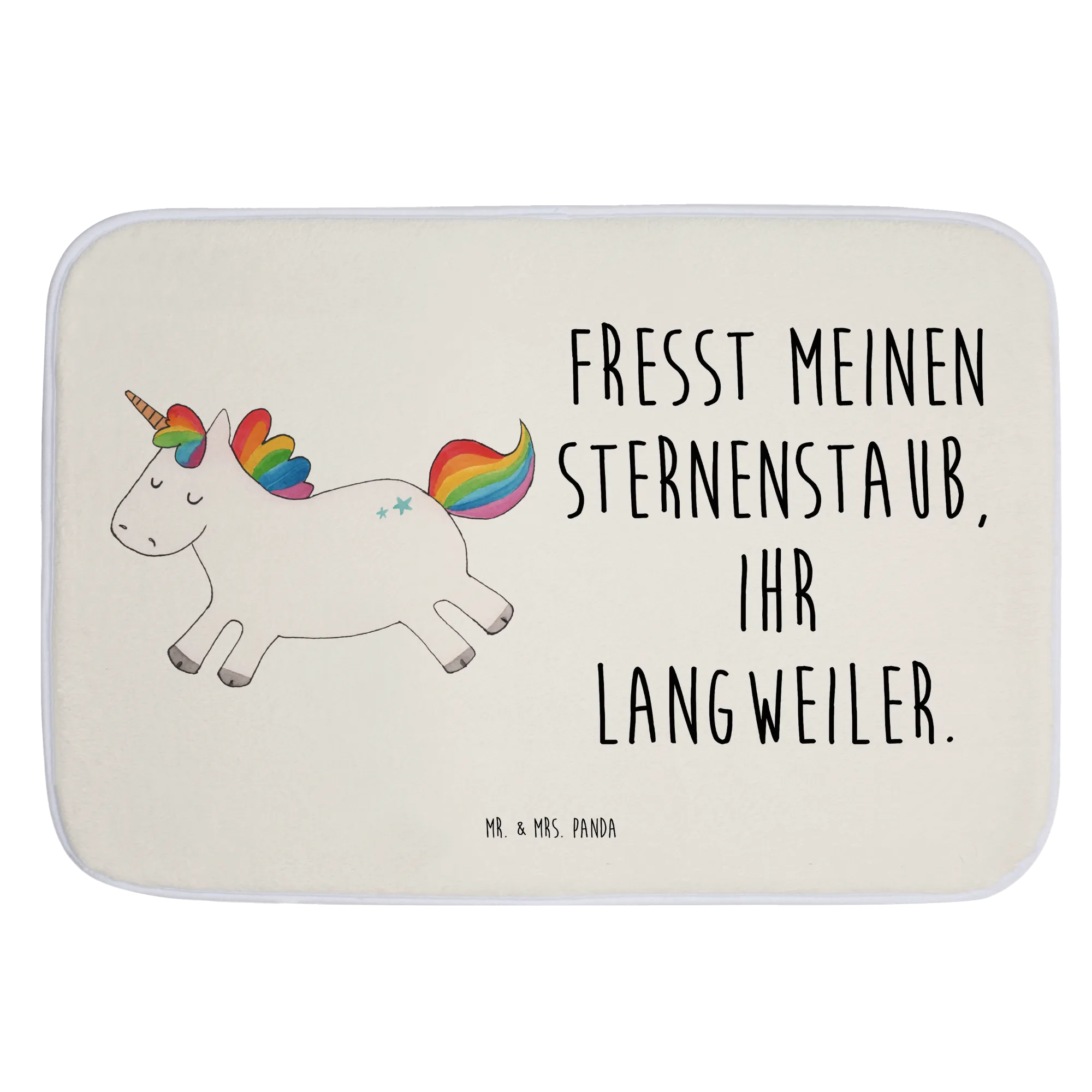 Dieses niedliche Einhorn mit seiner bunten Regenbogen-Mähne bringt nicht nur Freude, sondern sorgt auch für ein fröhliches Ambiente in jedem Badezimmer. Der Badvorleger ist mit dem witzigen Spruch "Fresst meinen Sternenstaub, ihr Langweiler" versehen, der dich und deine Gäste zum Schmunzeln bringt.