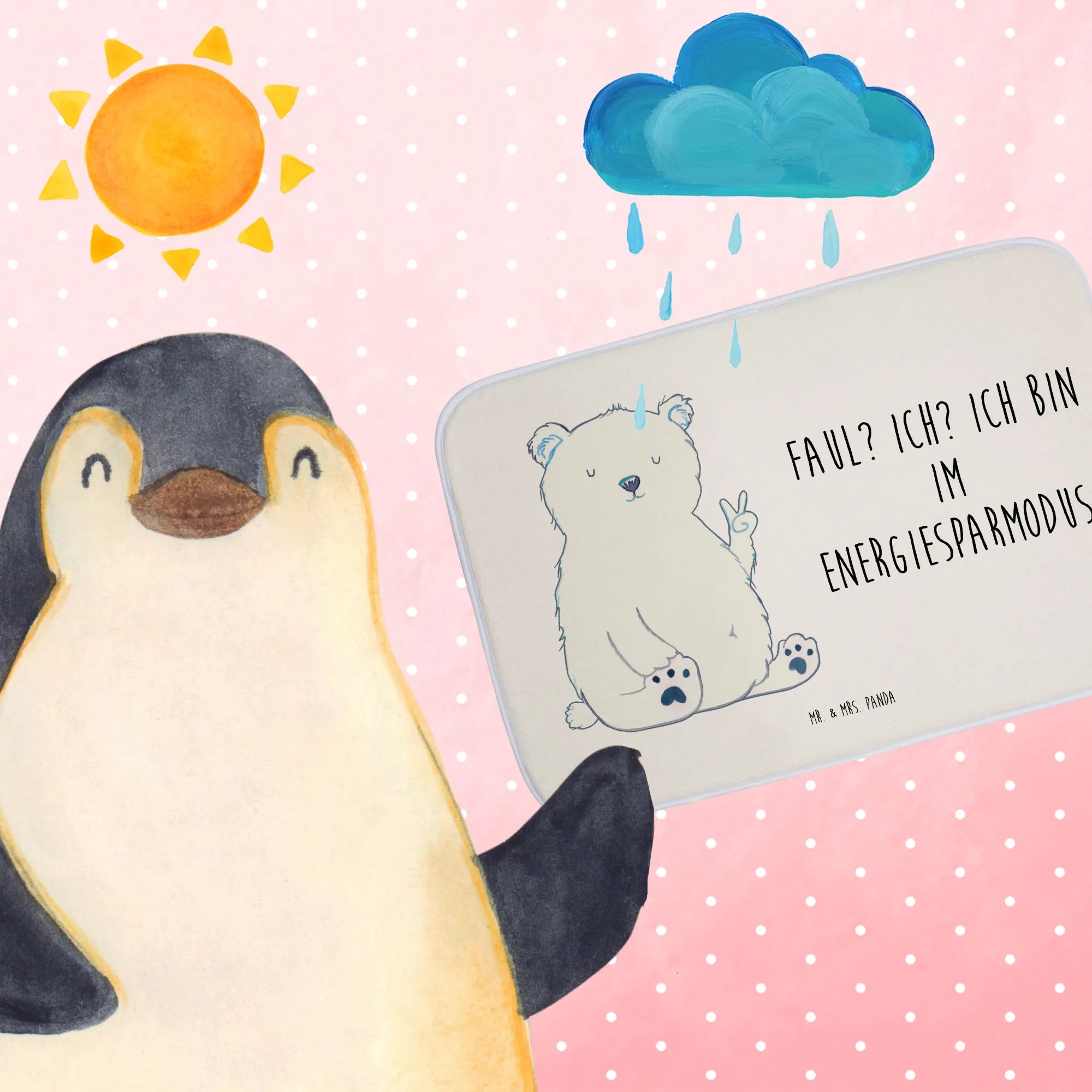 Suchst du nach dem perfekten Badvorleger? Dann haben wir genau das Richtige für dich! Unser Badvorleger Eisbär Faul aus der liebevollen Bär-Kollektion von Mr. & Mrs. Panda ist die ideale Wahl für dein Badezimmer. Mit einem wunderschönen, handgezeichneten Motiv eines faulen Eisbären, der humorvoll das Peace-Zeichen zeigt, sorgt dieser Badteppich für eine gemütliche und entspannte Atmosphäre. Der Spruch "Faul? Ich? Ich bin im Energiesparmodus." bringt zusätzlich einen Lächeln in deinen Alltag und ist der perfekte Hingucker im Bad.