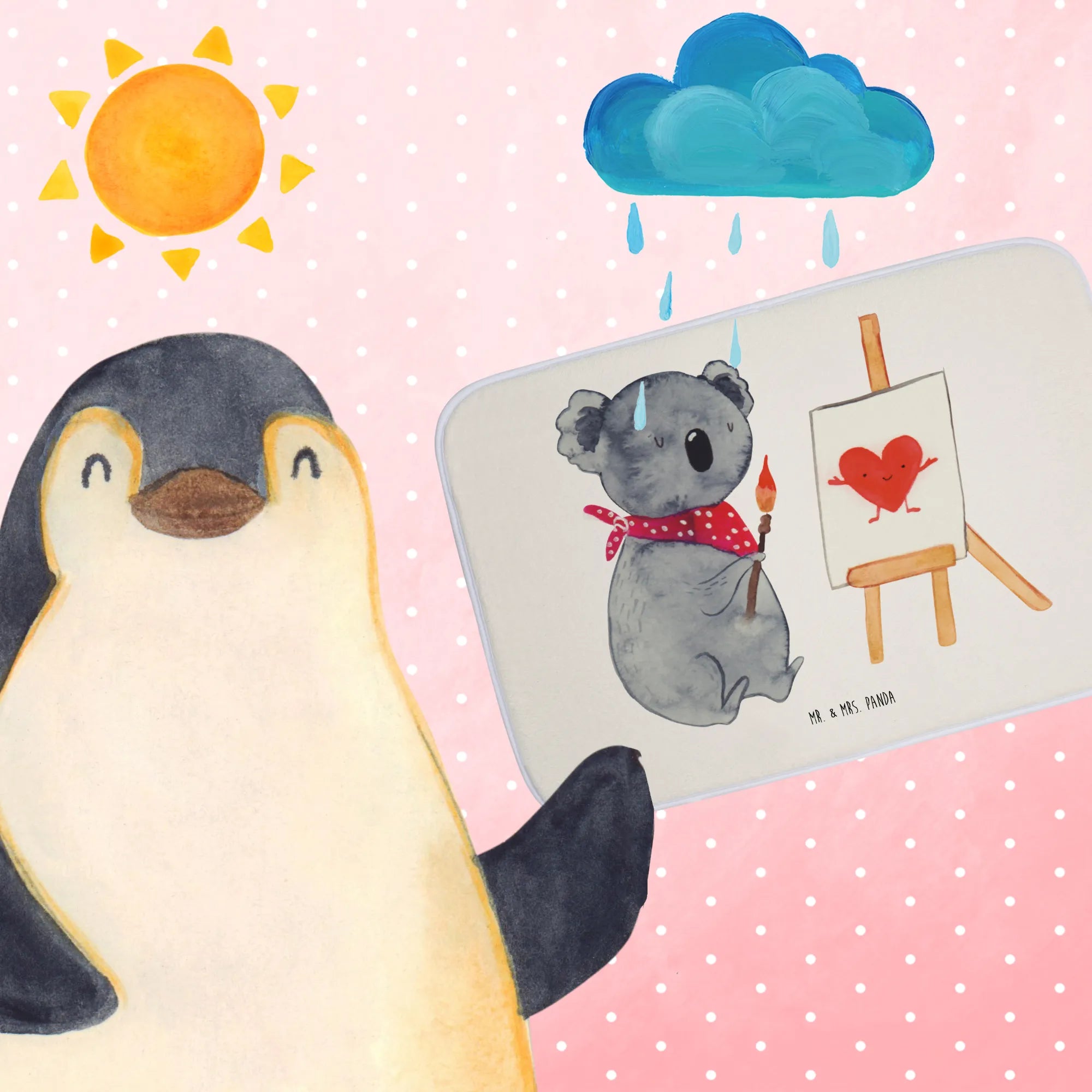 Der Badvorleger "Koala Künstler" von Mr. & Mrs. Panda ist das perfekte Geschenk für alle, die ihr Badezimmer auf liebevolle Weise dekorieren möchten. Mit seinem einzigartigen Design, das einen süßen Koala zeigt, der auf einer Leinwand mit einem Pinsel malt, bringt dieser Badteppich nicht nur Farbe, sondern auch Freude in dein Zuhause.
