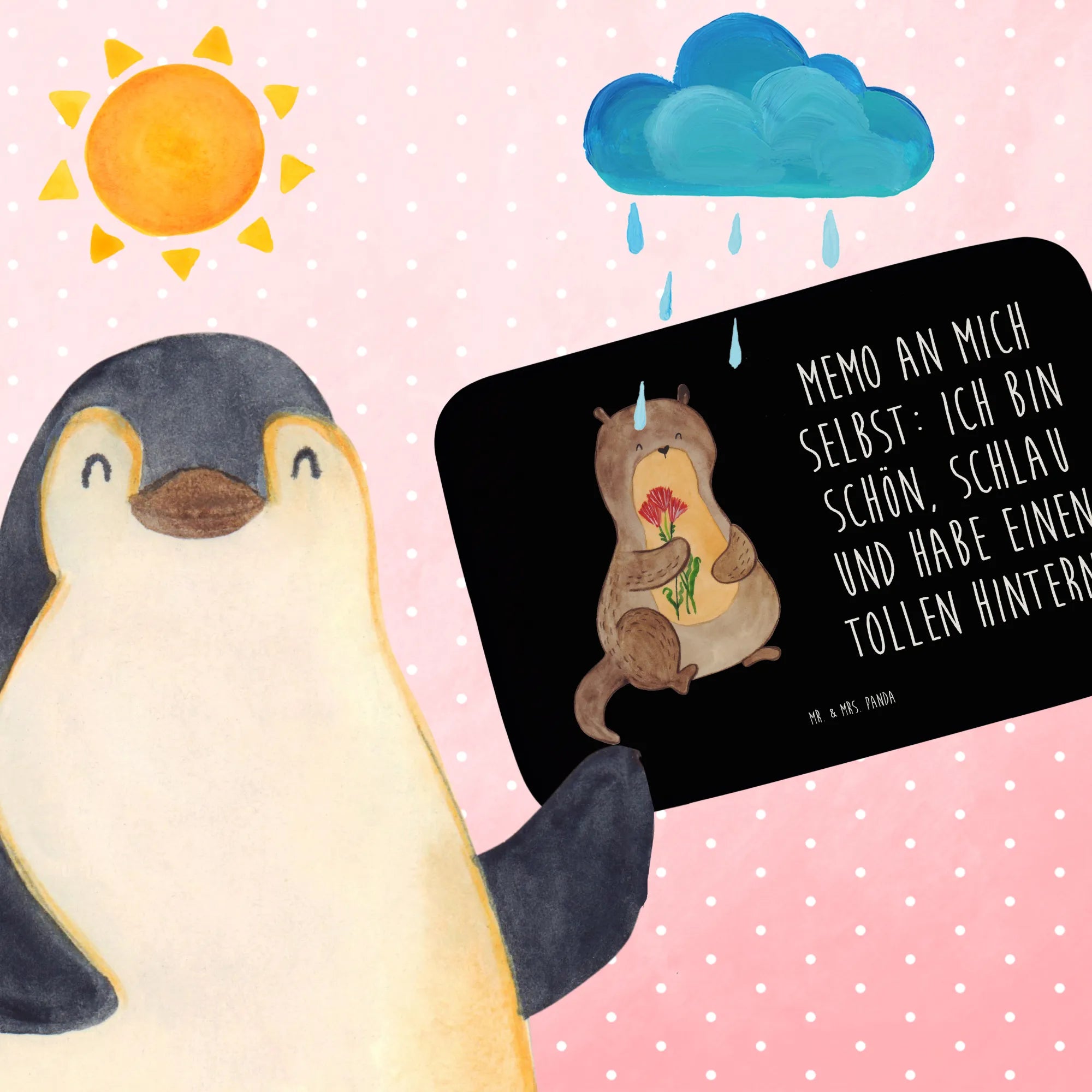 In der fantasievollen Welt von Mr. & Mrs. Panda begegnest du einem charmanten Otter, der behutsam einen farbenfrohen Blumenstrauß hält. Dieses liebevoll gestaltete Motiv ist eine Ode an die Schönheit der Selbstliebe und der Anerkennung eigener Stärken. Der dazugehörige Spruch 'Memo an mich selbst: ich bin schön, schlau und habe einen tollen Hintern' ist mehr als nur Worte - es ist eine Ermächtigung, sich selbst in bestem Licht zu sehen. Dieses Bild, das sowohl Seeotter als auch Freude verkörpert, ist ein Symbol für die Botschaft, dass wir alle wunderbar sind, genau so, wie wir sind. Lass dieses Motiv dein Herz erwärmen und erinnere dich daran, jeden Tag ein bisschen Liebe an dich selbst zu verschenken.